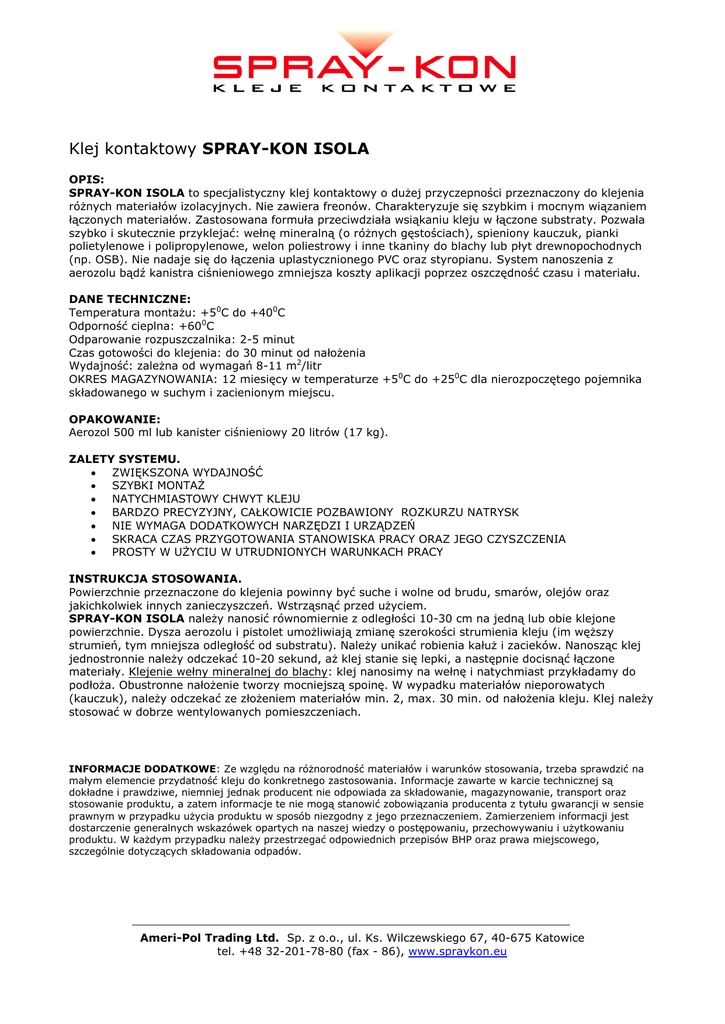 Klej kontaktowy SPRAY-KON ISOLA OPIS: SPRAY-KON ISOLA to specjalistyczny klej kontaktowy o dużej przyczepności przeznaczony do klejenia różnych materiałów izolacyjnych. Nie zawiera freonów. Charakteryzuje się szybkim i mocnym wiązaniem łączonych materiałów. Zastosowana formuła przeciwdziała wsiąkaniu kleju w łączone substraty. Pozwala szybko i skutecznie przyklejać: wełnę mineralną (o różnych gęstościach), spieniony kauczuk, pianki polietylenowe i polipropylenowe, welon poliestrowy i inne tkaniny do blachy lub płyt drewnopochodnych (np. OSB). Nie nadaje się do łączenia uplastycznionego PVC oraz styropianu. System nanoszenia z aerozolu bądź kanistra ciśnieniowego zmniejsza koszty aplikacji poprzez oszczędność czasu i materiału. DANE TECHNICZNE: Temperatura montażu: +50C do +400C Odporność cieplna: +600C Odparowanie rozpuszczalnika: 2-5 minut Czas gotowości do klejenia: do 30 minut od nałożenia Wydajność: zależna od wymagań 8-11 m2/litr OKRES MAGAZYNOWANIA: 12 miesięcy w temperaturze +50C do +250C dla nierozpoczętego pojemnika składowanego w suchym i zacienionym miejscu. OPAKOWANIE: Aerozol 500 ml lub kanister ciśnieniowy 20 litrów (17 kg). ZALETY SYSTEMU. ZWIĘKSZONA WYDAJNOŚĆ SZYBKI MONTAŻ NATYCHMIASTOWY CHWYT KLEJU BARDZO PRECYZYJNY, CAŁKOWICIE POZBAWIONY ROZKURZU NATRYSK NIE WYMAGA DODATKOWYCH NARZĘDZI I URZĄDZEŃ SKRACA CZAS PRZYGOTOWANIA STANOWISKA PRACY ORAZ JEGO CZYSZCZENIA PROSTY W UŻYCIU W UTRUDNIONYCH WARUNKACH PRACY APPLICATION INSTRUKCJA STOSOWANIA. Powierzchnie przeznaczone do klejenia powinny być suche i wolne od brudu, smarów, olejów oraz jakichkolwiek innych zanieczyszczeń. Wstrząsnąć przed użyciem. SPRAY-KON ISOLA należy nanosić równomiernie z odległości 10-30 cm na jedną lub obie klejone powierzchnie. Dysza aerozolu i pistolet umożliwiają zmianę szerokości strumienia kleju (im węższy strumień, tym mniejsza odległość od substratu). Należy unikać robienia kałuż i zacieków. Nanosząc klej jednostronnie należy odczekać 10-20 sekund, aż klej stanie się lepki, a następnie docisnąć łączone materiały. Klejenie wełny mineralnej do blachy: klej nanosimy na wełnę i natychmiast przykładamy do podłoża. Obustronne nałożenie tworzy mocniejszą spoinę. W wypadku materiałów nieporowatych (kauczuk), należy odczekać ze złożeniem materiałów min. 2, max. 30 min. od nałożenia kleju. Klej należy stosować w dobrze wentylowanych pomieszczeniach. INFORMACJE DODATKOWE: Ze względu na różnorodność materiałów i warunków stosowania, trzeba sprawdzić na małym elemencie przydatność kleju do konkretnego zastosowania. Informacje zawarte w karcie technicznej są dokładne i prawdziwe, niemniej jednak producent nie odpowiada za składowanie, magazynowanie, transport oraz stosowanie produktu, a zatem informacje te nie mogą stanowić zobowiązania producenta z tytułu gwarancji w sensie prawnym w przypadku użycia produktu w sposób niezgodny z jego przeznaczeniem. Zamierzeniem informacji jest dostarczenie generalnych wskazówek opartych na naszej wiedzy o postępowaniu, przechowywaniu i użytkowaniu produktu. W każdym przypadku należy przestrzegać odpowiednich przepisów BHP oraz prawa miejscowego, szczególnie dotyczących składowania odpadów. Ameri-Pol Trading Ltd. Sp. z o.o., ul. Ks. Wilczewskiego 67, 40-675 Katowice tel. +48 32-201-78-80 (fax - 86), www.spraykon.eu