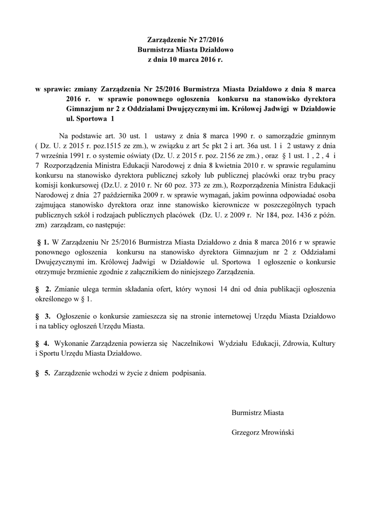 Zarządzenie Nr 27/2016 Burmistrza Miasta Działdowo z dnia 10 marca 2016 r. w sprawie: zmiany Zarządzenia Nr 25/2016 Burmistrza Miasta Działdowo z dnia 8 marca 2016 r. w sprawie ponownego ogłoszenia konkursu na stanowisko dyrektora Gimnazjum nr 2 z Oddziałami Dwujęzycznymi im. Królowej Jadwigi w Działdowie ul. Sportowa 1 Na podstawie art. 30 ust. 1 ustawy z dnia 8 marca 1990 r. o samorządzie gminnym ( Dz. U. z 2015 r. poz.1515 ze zm.), w związku z art 5c pkt 2 i art. 36a ust. 1 i 2 ustawy z dnia 7 września 1991 r. o systemie oświaty (Dz. U. z 2015 r. poz. 2156 ze zm.) , oraz § 1 ust. 1 , 2 , 4 i 7 Rozporządzenia Ministra Edukacji Narodowej z dnia 8 kwietnia 2010 r. w sprawie regulaminu konkursu na stanowisko dyrektora publicznej szkoły lub publicznej placówki oraz trybu pracy komisji konkursowej (Dz.U. z 2010 r. Nr 60 poz. 373 ze zm.), Rozporządzenia Ministra Edukacji Narodowej z dnia 27 października 2009 r. w sprawie wymagań, jakim powinna odpowiadać osoba zajmująca stanowisko dyrektora oraz inne stanowisko kierownicze w poszczególnych typach publicznych szkół i rodzajach publicznych placówek (Dz. U. z 2009 r. Nr 184, poz. 1436 z późn. zm) zarządzam, co następuje: § 1. W Zarządzeniu Nr 25/2016 Burmistrza Miasta Działdowo z dnia 8 marca 2016 r w sprawie ponownego ogłoszenia konkursu na stanowisko dyrektora Gimnazjum nr 2 z Oddziałami Dwujęzycznymi im. Królowej Jadwigi w Działdowie ul. Sportowa 1 ogłoszenie o konkursie otrzymuje brzmienie zgodnie z załącznikiem do niniejszego Zarządzenia. § 2. Zmianie ulega termin składania ofert, który wynosi 14 dni od dnia publikacji ogłoszenia określonego w § 1. § 3. Ogłoszenie o konkursie zamieszcza się na stronie internetowej Urzędu Miasta Działdowo i na tablicy ogłoszeń Urzędu Miasta. § 4. Wykonanie Zarządzenia powierza się Naczelnikowi Wydziału Edukacji, Zdrowia, Kultury i Sportu Urzędu Miasta Działdowo. § 5. Zarządzenie wchodzi w życie z dniem podpisania. Burmistrz Miasta Grzegorz Mrowiński Załącznik do Zarządzenia Nr 27/2016 Burmistrza Miasta Działdowo z dnia 10 marca 2016 r. Burmistrz Miasta Działdowo ponownie ogłasza konkurs na stanowisko dyrektora Gimnazjum nr 2 z Oddziałami Dwujęzycznymi im. Królowej Jadwigi w Działdowie ul. Sportowa 1 1. Do konkursu może przystąpić osoba, która spełnia wymagania określone w § 1, § 2 i § 5 oraz w § 10 rozporządzenia Ministra Edukacji Narodowej z dnia 27 października 2009 r. w sprawie wymagań, jakim powinna odpowiadać osoba zajmująca stanowisko dyrektora oraz inne stanowisko kierownicze w poszczególnych typach publicznych szkół i rodzajach publicznych placówek (Dz. U. z 2009 r. Nr 184, poz.1436 z późn. zm.), 2. Zgodnie z § 1 ust.2 pkt 4 r. rozporządzenia Ministra Edukacji Narodowej z dnia 8 kwietnia 2010 r. w sprawie regulaminu konkursu na stanowisko dyrektora publicznej szkoły lub publicznej placówki oraz trybu pracy komisji konkursowej (Dz.U. z 2010 r. Nr 60, poz.373 z późn.zm.) oferty osób przystępujących do konkursu powinny zawierać: a) uzasadnienie przystąpienia do konkursu wraz z koncepcją funkcjonowania i rozwoju publicznej szkoły, b) poświadczoną przez kandydata za zgodność z oryginałem kopię dowodu osobistego lub innego dokumentu potwierdzającego tożsamość oraz poświadczającego obywatelstwo kandydata, c) życiorys z opisem przebiegu pracy zawodowej, zawierający w szczególności informację o: – stażu pracy pedagogicznej - w przypadku nauczyciela albo – stażu pracy dydaktycznej - w przypadku nauczyciela akademickiego, albo – stażu pracy, w tym stażu pracy na stanowisku kierowniczym - w przypadku osoby niebędącej nauczycielem, d) oryginały lub poświadczone przez kandydata za zgodność z oryginałem kopie dokumentów potwierdzających posiadanie wymaganego stażu pracy, o którym mowa w lit. c, e) oryginały lub poświadczone przez kandydata za zgodność z oryginałem kopie dokumentów potwierdzających posiadanie wymaganego wykształcenia, w tym dyplomu ukończenia studiów wyższych lub świadectwa ukończenia studiów podyplomowych z zakresu zarządzania albo świadectwa ukończenia kursu kwalifikacyjnego z zakresu zarządzania oświatą, f) zaświadczenie lekarskie o braku przeciwwskazań zdrowotnych do wykonywania pracy na stanowisku kierowniczym, g) oświadczenie, że przeciwko kandydatowi nie toczy się postępowanie o przestępstwo ścigane z oskarżenia publicznego lub postępowanie dyscyplinarne, h) oświadczenie, że kandydat nie był skazany prawomocnym wyrokiem za umyślne przestępstwo lub umyślne przestępstwo skarbowe, i) oświadczenie, że kandydat nie był karany zakazem pełnienia funkcji związanych z dysponowaniem środkami publicznymi, o których mowa w art. 31 ust. 1, pkt 4 ustawy z dnia 17 grudnia 2004 r. o odpowiedzialności za naruszenie dyscypliny finansów publicznych (j.t. Dz. U. z 2013 r. poz. 168), j) oświadczenie o dopełnieniu obowiązku, o którym mowa w art. 7 ust. 1 i ust. 3a ustawy z dnia 18 października 2006 r. o ujawnianiu informacji o dokumentach organów bezpieczeństwa państwa z lat 1944-1990 oraz treści tych dokumentów (t.j. Dz. U. z 2013 r., poz. 1388), k) oryginał lub poświadczoną przez kandydata za zgodność z oryginałem kopię aktu nadania stopnia nauczyciela mianowanego lub dyplomowanego - w przypadku nauczyciela, l) oryginał lub poświadczoną przez kandydata za zgodność z oryginałem kopię karty oceny pracy lub oceny dorobku zawodowego – w przypadku nauczyciela i nauczyciela akademickiego, m) oświadczenie, że kandydat nie był karany karą dyscyplinarną, o której mowa w art. 76 ust.1 ustawy z dnia 26 stycznia 1982 r. - Karta Nauczyciela (t.j. Dz. U. 2014 r. poz. 191 z późn. zm.) lub w art. 140 ust. 1 ustawy z dnia 27 lipca 2005 r. - Prawo o szkolnictwie wyższym (j.t. Dz. U. z 2012 r. poz. 572 z późn. zm.) - w przypadku nauczyciela i nauczyciela akademickiego, n) oświadczenie, że kandydat ma 