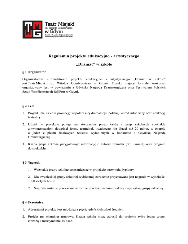 Regulamin projektu edukacyjno - artystycznego „Dramat” w szkole § 1 Organizator Organizatorem i fundatorem projektu edukacyjno - artystycznego „Dramat w szkole” jest Teatr Miejski im. Witolda Gombrowicza w Gdyni. Projekt mający formułę konkursu, organizowany jest w powiązaniu z Gdyńską Nagrodą Dramaturgiczną oraz Festiwalem Polskich Sztuk Współczesnych R@Port w Gdyni. § 2 Cele 1. Projekt ma na celu promocję współczesnej dramaturgii polskiej wśród młodzieży oraz edukację teatralną. 2. Udział w projekcie polega na stworzeniu przez każdą z grup szkolnych spektaklu z wykorzystaniem dowolnej formy teatralnej, trwającego nie dłużej niż 20 minut, w oparciu o jeden z pięciu finałowych tekstów wyłonionych w konkursie o Gdyńską Nagrodę Dramaturgiczną. 3. Każda grupa szkolna przygotowuje informację o autorze dramatu (do 3 minut) oraz program do spektaklu. § 3 Nagroda 1. Wszystkie grupy szkolne uczestniczące w projekcie otrzymują dyplomy. 2. Dla zwycięskiej grupy szkolnej wybieranej corocznie przyznawana jest nagroda w wysokości 1000 złotych brutto. 2. Nagroda zostanie przekazana w formie przelewu na konto szkoły zwycięskiej grupy szkolnej. § 4 Uczestnicy 1. Adresatami projektu jest młodzież z pięciu gdyńskich szkół średnich. 2. Projekt ma charakter grupowy. Każda szkoła może zgłosić do projektu tylko jedną grupę, złożoną z maksymalnie 15 osób. 3. O wyborze szkół zaangażowanych w projekt „Dramat w szkole” decyduje Teatr Miejski im. Witolda Gombrowicza w Gdyni. § 5 Organizacja projektu 1. Zgłoszenia do projektu są przyjmowane do dnia 6 kwietnia każdego roku na adres: Teatr Miejski im. Witolda Gombrowicza w Gdyni 81- 381 Gdynia, ul. Bema 26 z dopiskiem: DRAMAT W SZKOLE lub drogą elektroniczną: [email protected] 2. Lista szkół zakwalifikowanych do udziału w projekcie zostanie opublikowana na stronie Teatru po 6 kwietnia. Uczestnicy projektu zostaną również zawiadomieni przez organizatora. 3. Każda grupa szkolna (zespół) otrzymuje tekst dramatu w drodze losowania, które odbywa się po 6 kwietnia. 4. Zespoły wraz z nauczycielami pracują nad opracowaniem autorskiej wypowiedzi artystycznej pod opieką artystyczną pracowników Teatru (aktora i pedagoga teatru). 5. Zespoły są zobowiązane do przesłania zapotrzebowania technicznego spektaklu (np. oświetlenie, nagłośnienie, rzutnik multimedialny, rekwizyty, elementy scenografii) do 9 maja. 6. Zespoły korzystające z podkładów muzycznych zobowiązane są do przygotowania nagrań na płytach CD zaopatrzonych w dokładny opis. Możliwe jest również wystawienie spektaklu z akompaniamentem na żywo. 7. Prezentacje wszystkich spektakli odbywają się na Dużej Scenie Teatru Miejskiego im. Witolda Gombrowicza w Gdyni 24 maja, podczas finału projektu „Dramat w szkole”. § 6 Jury 1. Prezentowane spektakle oceniane są przez jury w składzie co najmniej 3 osobowym, które każdorazowo powołuje organizator. 2. Jury ocenia spektakle kierując się następującymi kryteriami: adaptacja tekstu, interpretacja tekstu, budowanie sytuacji scenicznych, wybór niebanalnych form wyrazu artystycznego. 3. Jury wybiera laureata nagrody w głosowaniu. Każdemu z członków jury przysługuje jeden głos. Z obrad jury sporządza się protokół. 4. Protokół z obrad jury zostanie opublikowany na stronie internetowej Teatru po 2 maja.