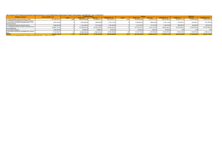Stan wdrażania II Osi Priorytetowej Gospodarka Regionalnej Szansy w ramach Małopolskiego Regionalnego Programu Operacyjnego na lata 2007-2013 - stan na 30.03.2012 r. Projekty wybrane Działanie / Schemat Alokacja EFRR (w zł)* Liczba EFRR (w zł) BP (w zł) EFRR+BP (w zł) 2.1.A Bezpośrednie wsparcie inwestycji w MŚP 583 126 674,11 477 352 781,16 1 628 495 657 672,99 87 469 001,12 2.1.B Wspólne przedsięwzięcia i tworzenie powiązań kooperacyjnych pomiędzy przedsiębiorstwami, w tym 2 732 112,63 5 279 775,00 4 2 322 295,74 409 816,89 tworzenie klastrów 2.1.C Dotacje dla instytucji otoczenia biznesu 1 428 798,84 4 788 238,30 3 1 214 479,01 214 319,83 2.1.D Wsparcie funduszy zwrotnych, przeznaczonych 151 609 247,28 178 363 820,33 144 897 171,97 14 26 754 573,05 dla przedsiębiorstw 2.2.A Projekty badawcze 59 925,00 1 953 297,28 1 50 936,25 8 988,75 2.2.B Projekty inwestycyjne przedsiębiorstw z zakresu 31 223 454,72 19 634 768,98 91 16 689 553,63 2 945 215,35 B+R RAZEM 665 494 718,43 1 741 667 544 184,91 117 801 914,98 785 346 099,89 *kurs roboczy Europejskiego Banku Centralnego na dzień 28.02.2012 r.: 1 EUR = 4.1410 PLN Liczba 1 495 Umowy EFRR (w zł) 459 469 256,00 BP (w zł) 81 052 811,30 EFRR+BP (w zł) 540 522 067,30 EFRR (w zł) 184 348 110,70 Płatności BP (w zł) 32 532 024,60 EFRR+BP (w zł) 216 880 135,30 1 501 884,88 4 2 322 295,73 409 816,90 2 732 112,63 1 276 602,14 225 282,74 3 1 214 479,01 214 319,83 1 428 798,84 229 076,37 40 425,26 269 501,63 14 144 333 991,00 25 470 704,30 169 804 695,30 133 200 848,40 23 506 032,40 156 706 880,80 1 50 936,25 8 988,75 59 925,00 0,00 0,00 0,00 84 15 315 791,65 2 702 786,83 18 018 578,48 7 564 416,87 1 334 897,32 8 899 314,19 1 601 622 706 749,64 109 859 427,91 732 566 177,55 326 619 054,48 57 638 662,32 384 257 716,80