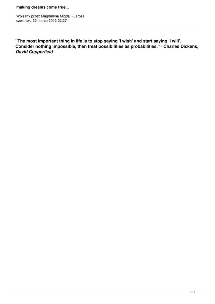 making dreams come true... Wpisany przez Magdalena Migdał - Jarosz czwartek, 22 marca 2012 22:27 - "The most important thing in life is to stop saying 'I wish' and start saying 'I will'. Consider nothing impossible, then treat possibilities as probabilities." ~Charles Dickens, David Copperfield 1/1