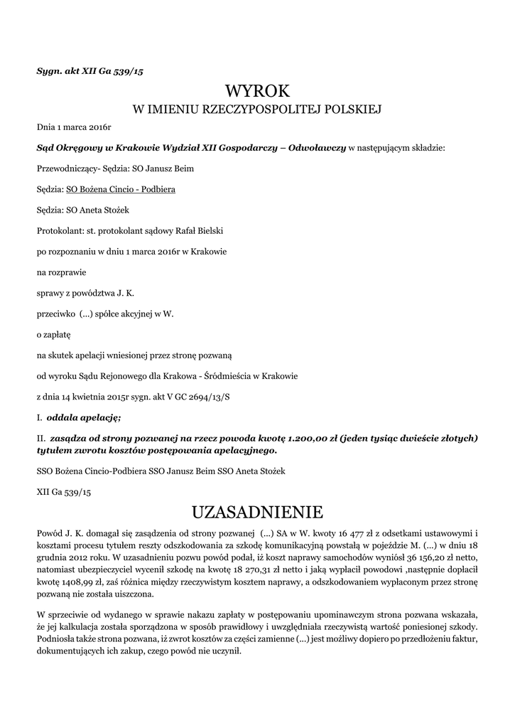 Sygn. akt XII Ga 539/15 WYROK W IMIENIU RZECZYPOSPOLITEJ POLSKIEJ Dnia 1 marca 2016r Sąd Okręgowy w Krakowie Wydział XII Gospodarczy – Odwoławczy w następującym składzie: Przewodniczący- Sędzia: SO Janusz Beim Sędzia: SO Bożena Cincio - Podbiera Sędzia: SO Aneta Stożek Protokolant: st. protokolant sądowy Rafał Bielski po rozpoznaniu w dniu 1 marca 2016r w Krakowie na rozprawie sprawy z powództwa J. K. przeciwko (...) spółce akcyjnej w W. o zapłatę na skutek apelacji wniesionej przez stronę pozwaną od wyroku Sądu Rejonowego dla Krakowa - Śródmieścia w Krakowie z dnia 14 kwietnia 2015r sygn. akt V GC 2694/13/S I. oddala apelację; II. zasądza od strony pozwanej na rzecz powoda kwotę 1.200,00 zł (jeden tysiąc dwieście złotych) tytułem zwrotu kosztów postępowania apelacyjnego. SSO Bożena Cincio-Podbiera SSO Janusz Beim SSO Aneta Stożek XII Ga 539/15 UZASADNIENIE Powód J. K. domagał się zasądzenia od strony pozwanej (...) SA w W. kwoty 16 477 zł z odsetkami ustawowymi i kosztami procesu tytułem reszty odszkodowania za szkodę komunikacyjną powstałą w pojeździe M. (...) w dniu 18 grudnia 2012 roku. W uzasadnieniu pozwu powód podał, iż koszt naprawy samochodów wyniósł 36 156,20 zł netto, natomiast ubezpieczyciel wycenił szkodę na kwotę 18 270,31 zł netto i jaką wypłacił powodowi ,następnie dopłacił kwotę 1408,99 zł, zaś różnica między rzeczywistym kosztem naprawy, a odszkodowaniem wypłaconym przez stronę pozwaną nie została uiszczona. W sprzeciwie od wydanego w sprawie nakazu zapłaty w postępowaniu upominawczym strona pozwana wskazała, że jej kalkulacja została sporządzona w sposób prawidłowy i uwzględniała rzeczywistą wartość poniesionej szkody. Podniosła także strona pozwana, iż zwrot kosztów za części zamienne (...) jest możliwy dopiero po przedłożeniu faktur, dokumentujących ich zakup, czego powód nie uczynił. Bezsporne pozostawało, iż strony były związane umową ubezpieczenia komunikacyjnego AC z dnia 12 lipca 2012 roku, fakt zaistnienia szkody w pojeździe oraz jej zgłoszenia, a także wypłaty powodowi kwoty 19 679,30 zł netto. Sąd Rejonowy w oparciu p przedłożone dowody, w tym dowód z opinii biegłego, ustalił, iż koszty naprawy potwierdzone przez powoda fakturami rachunkami są w dużym stopniu zbieżne z wyliczeniami biegłego, oprócz kwoty wynikającej z faktury (...), dotyczącej wymiany błotnika przedniego prawego i drzwi tylnych prawych bowiem biegły ustalił, iż były one jedynie naprawione. Koszt naprawy tych elementów biegły ustalił na kwotę 525 zł netto, przyjmując kwotę 105 zł za roboczogodzinę, mimo iż w zakładzie naprawczym obowiązywała stawka 85 zł za roboczogodzinę. W tym zakresie Sąd Rejonowy zweryfikował opinię biegłego, i ustalił, iż koszt prac wynosił 425 zł, przy przyjęciu stawki roboczogodziny stosowanej przez zakład naprawczy. Sąd Rejonowy nie dał wiary zeznaniom powoda, iż błotnik przedni prawy i drzwi tylne prawe zostały wymienione ,a to wobec treści opinii biegłego, stwierdzającej iż nowe drzwi musiałyby być uszkodzone w tych właśnie miejscach co stare, co jest niemożliwe. Sąd Rejonowy wskazał, iż biegły nie uznał kosztów montażu i oprogramowania modułu samochodu wynikającego z faktury (...) ponieważ były one już policzone w fakturze (...), natomiast koszty lakierowania samochodu zostały w rachunku powoda zawyżone wobec czego, zgodnie z opinią uzupełniającą, Sąd Rejonowy ustalił koszt lakierowania na kwotę 2042,50 zł. Wg ustaleń Sądu Rejonowego rzeczywisty koszt naprawy samochodu wyniósł 31 341,59 zł netto. Sąd Rejonowy pozytywnie zweryfikował opinię biegłego, uznając ją za rzetelną, opartą na materiale dowodowym i odnoszącą się do zarzutów stron. Sąd Rejonowy zważył, iż powód uprawniony był do naprawy przy użyciu części oryginalnych, serwisowych skoro doszło do uszkodzenia jego pojazdu, szkoda została zgłoszona, a samochód naprawiony. Poniesione przez powoda koszty przerosły kwotę otrzymaną od strony pozwanej zatem powodowi winna przypaść różnica pomiędzy rzeczywistym kosztem naprawy, a kwotą wypłacaną przez ubezpieczyciela. Wyliczone przez ubezpieczyciela koszty bowiem żaden sposób nie odpowiadają kosztom wskazanym przez biegłego. Skoro koszty naprawy netto ustalono na kwotę 31 341,59 zł, a strona pozwana wypłaciła powodowi 19 679,30 zł Sąd Rejonowy w wyrokiem z dnia 14 kwietnia 2015 roku zasądził od strony pozwanej na rzecz kwotę 11 662,29 zł, a w pozostałej części powództwo oddalił, orzekając o kosztach postępowania po myśli art. 100 kpc. W apelacji od tego wyroku strona pozwana zarzuciła Sądowi Rejonowemu niewyjaśnienie wszystkich okoliczności faktycznych istotnych dla rozstrzygnięcia sprawy, w tym nie ustalenie jakich części zamiennych, nowych serwisowych czy też używanych użył powód do naprawy, co miało istotny wpływ na ustalenie kosztów zakupu części , mimo iż w toku postępowania powód przedłożył faktury zakupu części zamiennych w firmie, zajmującej się sprzedażą części zamiennych używanych, a żądał kosztów zbliżonych do kosztów zakupu części nowych serwisowych. Błędu w ustaleniach faktycznych dopatrywała się strona pozwana w okoliczności przyjęcia przez Sąd Rejonowy na podstawie faktury (...) i faktury (...), że koszty zakupu części zamiennych wyniosły 27 125 zł, podczas gdy z opinii uzupełniającej biegłego sądowego wynika, że maksymalna wartość części używanych dochodzi do wysokości 50 % części nowych, wobec czego nie powinna przekroczyć kwoty 10 958,71 zł. Zdaniem skarżącej Sąd Rejonowy naruszył art. 824/1/ kc poprzez zasądzenie odszkodowania przewyższającego wysokość szkody. W motywach apelacji podniesiono, że powód nie udokumentował kosztów poniesienia szkody w sytuacji gdy strona powodowa kwestionowała by do naprawy użyto nowych, o