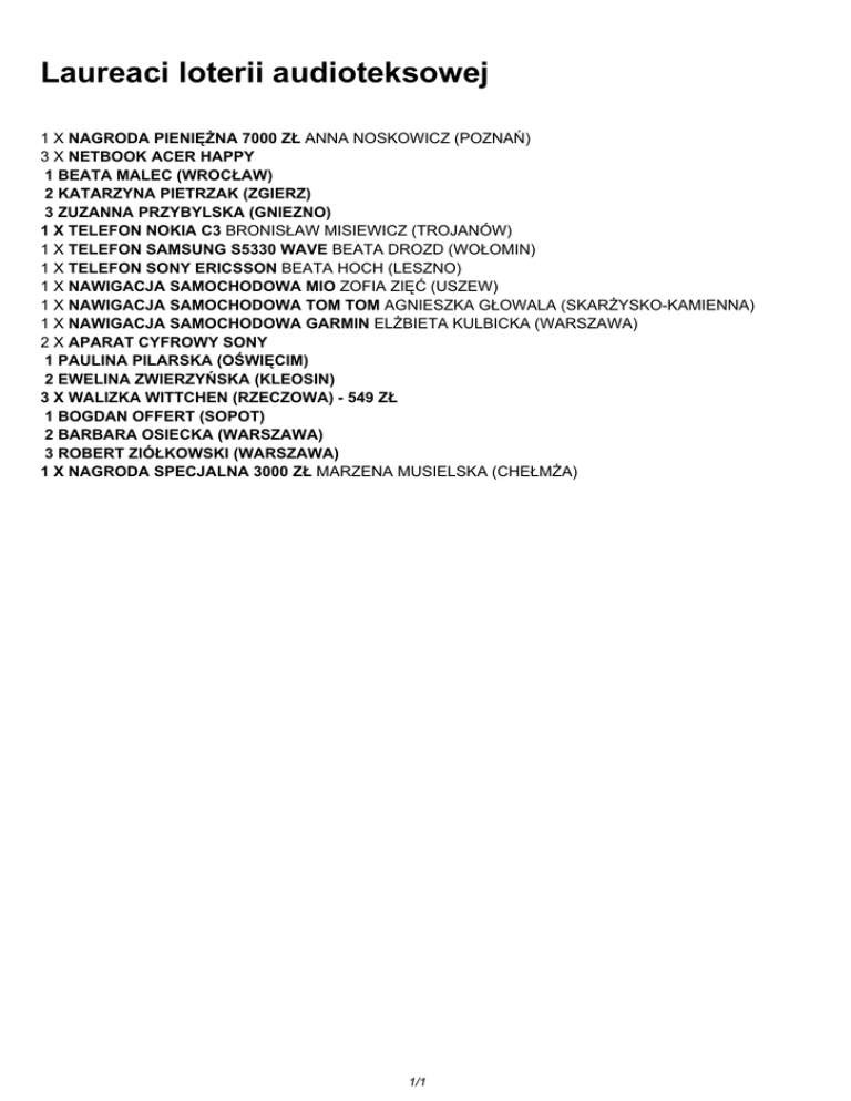 Laureaci loterii audioteksowej 1 X NAGRODA PIENIĘŻNA 7000 ZŁ ANNA NOSKOWICZ (POZNAŃ) 3 X NETBOOK ACER HAPPY 1 BEATA MALEC (WROCŁAW) 2 KATARZYNA PIETRZAK (ZGIERZ) 3 ZUZANNA PRZYBYLSKA (GNIEZNO) 1 X TELEFON NOKIA C3 BRONISŁAW MISIEWICZ (TROJANÓW) 1 X TELEFON SAMSUNG S5330 WAVE BEATA DROZD (WOŁOMIN) 1 X TELEFON SONY ERICSSON BEATA HOCH (LESZNO) 1 X NAWIGACJA SAMOCHODOWA MIO ZOFIA ZIĘĆ (USZEW) 1 X NAWIGACJA SAMOCHODOWA TOM TOM AGNIESZKA GŁOWALA (SKARŻYSKO-KAMIENNA) 1 X NAWIGACJA SAMOCHODOWA GARMIN ELŻBIETA KULBICKA (WARSZAWA) 2 X APARAT CYFROWY SONY 1 PAULINA PILARSKA (OŚWIĘCIM) 2 EWELINA ZWIERZYŃSKA (KLEOSIN) 3 X WALIZKA WITTCHEN (RZECZOWA) - 549 ZŁ 1 BOGDAN OFFERT (SOPOT) 2 BARBARA OSIECKA (WARSZAWA) 3 ROBERT ZIÓŁKOWSKI (WARSZAWA) 1 X NAGRODA SPECJALNA 3000 ZŁ MARZENA MUSIELSKA (CHEŁMŻA) 1/1