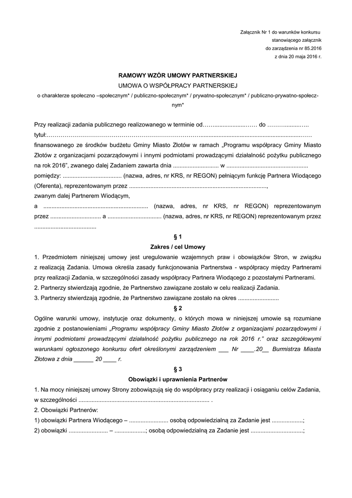 Załącznik Nr 1 do warunków konkursu stanowiącego załącznik do zarządzenia nr 85.2016 z dnia 20 maja 2016 r. RAMOWY WZÓR UMOWY PARTNERSKIEJ UMOWA O WSPÓŁPRACY PARTNERSKIEJ o charakterze społeczno –społecznym* / publiczno-społecznym* / prywatno-społecznym* / publiczno-prywatno-społecznym* Przy realizacji zadania publicznego realizowanego w terminie od……...................…… do ……….........….. tytuł:…………………………………………………………………….............................................................…… finansowanego ze środków budżetu Gminy Miasto Złotów w ramach „Programu współpracy Gminy Miasto Złotów z organizacjami pozarządowymi i innymi podmiotami prowadzącymi działalność pożytku publicznego na rok 2016”, zwanego dalej Zadaniem zawarta dnia ............................ w .................................................. pomiędzy: .................................... (nazwa, adres, nr KRS, nr REGON) pełniącym funkcję Partnera Wiodącego (Oferenta), reprezentowanym przez ...................................................................................., zwanym dalej Partnerem Wiodącym, a ................................................................ (nazwa, adres, nr KRS, nr REGON) reprezentowanym przez ............................... a ................................. (nazwa, adres, nr KRS, nr REGON) reprezentowanym przez ...................................... §1 Zakres / cel Umowy 1. Przedmiotem niniejszej umowy jest uregulowanie wzajemnych praw i obowiązków Stron, w związku z realizacją Zadania. Umowa określa zasady funkcjonowania Partnerstwa - współpracy między Partnerami przy realizacji Zadania, w szczególności zasady współpracy Partnera Wiodącego z pozostałymi Partnerami. 2. Partnerzy stwierdzają zgodnie, że Partnerstwo zawiązane zostało w celu realizacji Zadania. 3. Partnerzy stwierdzają zgodnie, że Partnerstwo zawiązane zostało na okres ......................... §2 Ogólne warunki umowy, instytucje oraz dokumenty, o których mowa w niniejszej umowie są rozumiane zgodnie z postanowieniami „Programu współpracy Gminy Miasto Złotów z organizacjami pozarządowymi i innymi podmiotami prowadzącymi działalność pożytku publicznego na rok 2016 r.” oraz szczegółowymi warunkami ogłoszonego konkursu ofert określonymi zarządzeniem ___ Nr ____.20__ Burmistrza Miasta Złotowa z dnia ______ 20 ____ r. §3 Obowiązki i uprawnienia Partnerów 1. Na mocy niniejszej umowy Strony zobowiązują się do współpracy przy realizacji i osiąganiu celów Zadania, w szczególności ................................................................................ . 2. Obowiązki Partnerów: 1) obowiązki Partnera Wiodącego – ........................ osobą odpowiedzialną za Zadanie jest ...................; 2) obowiązki ........................ – ...................; osobą odpowiedzialną za Zadanie jest ................................; 3) obowiązki .................................. – ...................................................; osobą odpowiedzialną za Zadanie jest .............................................. 3. Partner Wiodący zobowiązany jest do bezzwłocznego poinformowania na piśmie Partnerów o fakcie uzyskania dofinansowania na realizację zadania publicznego, którego przedmiot określa niniejsza umowa. 4. Przedstawia się opis poszczególnych działań / uzgodnień terminów w formie harmonogramu / relacji finansowych w formie kosztorysu, które stanowią odpowiednio załączniki do niniejszej umowy. 5. W ramach realizacji Zadania, Partnerzy są zobowiązani do: 1) realizowania Zadania, zgodnie z postanowieniami „Programu współpracy Gminy Miasto Złotów z organizacjami pozarządowymi i innymi podmiotami prowadzącymi działalność pożytku publicznego na rok 2016 r.” oraz szczegółowymi warunkami ogłoszonego konkursu ofert określonymi zarządzeniem Nr ____.20__ Burmistrza Miasta Złotowa z dnia ______ 20 ____ r., 2) zapewnienia promocji Zadania, zgodnie z postanowieniami „Programu współpracy Gminy Miasto Złotów z organizacjami pozarządowymi i innymi podmiotami prowadzącymi działalność pożytku publicznego na rok 2016 r.” oraz szczegółowymi warunkami ogłoszonego konkursu ofert określonymi zarządzeniem Nr ____.20__ Burmistrza Miasta Złotowa z dnia ______ 20 ____ r., przy czym Partner Wiodący dokona wszelkich starań aby informować Partnerów o obowiązkach wynikających z tego dokumentu i zmianach w tym zakresie, 3) przedstawienia na pisemne wezwanie Burmistrza Miasta Złotowa informacji i wyjaśnień związanych z realizacją Zadania, 4) poddania się kontroli Burmistrza Miasta Złotowa lub upoważnionych przez niego osób w zakresie prawidłowości wykonywania zadania zarówno w siedzibie stron niniejszej umowy, jak i w miejscu realizacji zadania publicznego. 5. Wykonanie umowy nastąpi z chwilą zaakceptowania przez Gminą Miasto Złotów reprezentowaną przez Burmistrza Miasta Złotowa sprawozdania końcowego, jakie w związku z zawarta umową o dofinansowanie zobowiązany jest złożyć Partner Wiodący. 6. Partner Wiodący oświadcza, że nie będzie dokonywał wpłat środków finansowych na rzecz partnerów, w związku z realizacją zadania. §4 Sprawozdawczość Partnerzy zobowiązani są do przekazywania Partnerowi Wiodącemu informacji na temat realizacji Zadania niezbędnych do sporządzenia sprawozdań z realizacji zadania, mają na uwadze zachowanie terminów które zostaną uregulowane w Umowie o dofinansowanie realizacji Zadania między Partnerem Wiodącym a Gminą Miasto Złotów reprezentowaną przez Burmistrza Miasta Złotowa. §5 Monitoring i kontrola 1. Partner Wiodący zobowiązuje się na bieżąco monitorować prawidłowość realizacji Zadania. 2. W sytuacji przeprowadzania przez Burmistrza Miasta Złotowa lub przez niego osób upoważnionych kontroli strony umożliwią bezz