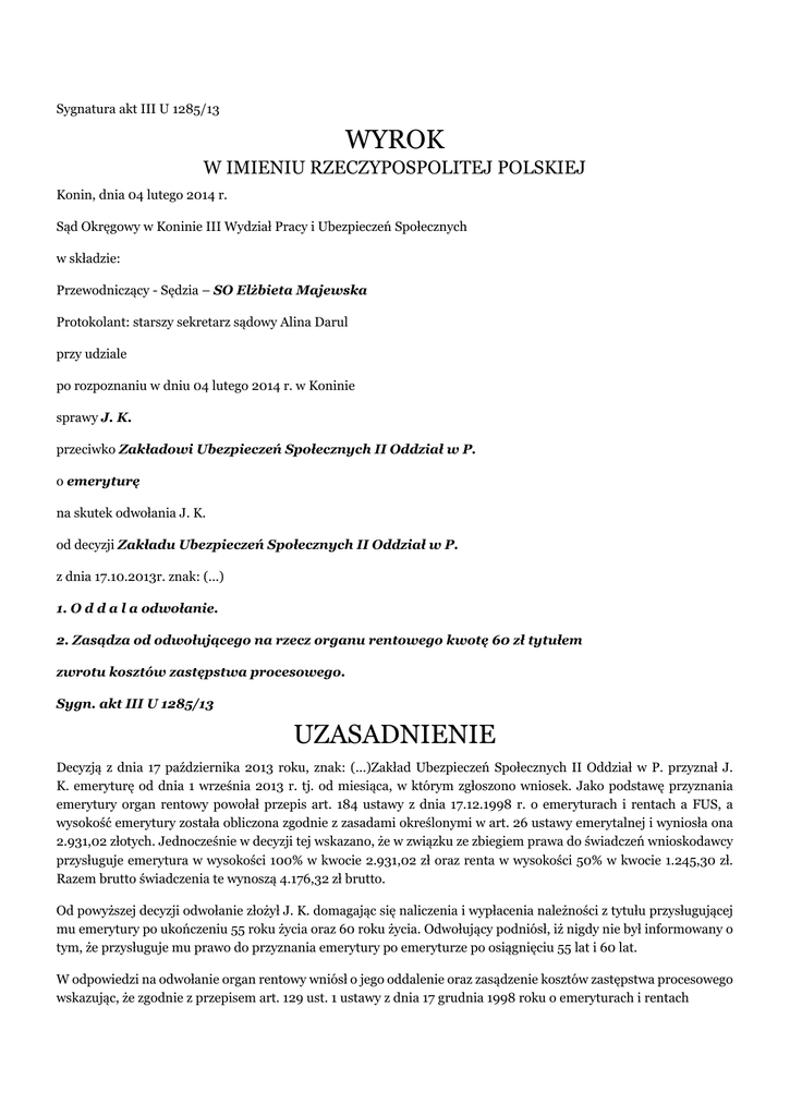 Sygnatura akt III U 1285/13 WYROK W IMIENIU RZECZYPOSPOLITEJ POLSKIEJ Konin, dnia 04 lutego 2014 r. Sąd Okręgowy w Koninie III Wydział Pracy i Ubezpieczeń Społecznych w składzie: Przewodniczący - Sędzia – SO Elżbieta Majewska Protokolant: starszy sekretarz sądowy Alina Darul przy udziale po rozpoznaniu w dniu 04 lutego 2014 r. w Koninie sprawy J. K. przeciwko Zakładowi Ubezpieczeń Społecznych II Oddział w P. o emeryturę na skutek odwołania J. K. od decyzji Zakładu Ubezpieczeń Społecznych II Oddział w P. z dnia 17.10.2013r. znak: (...) 1. O d d a l a odwołanie. 2. Zasądza od odwołującego na rzecz organu rentowego kwotę 60 zł tytułem zwrotu kosztów zastępstwa procesowego. Sygn. akt III U 1285/13 UZASADNIENIE Decyzją z dnia 17 października 2013 roku, znak: (...)Zakład Ubezpieczeń Społecznych II Oddział w P. przyznał J. K. emeryturę od dnia 1 września 2013 r. tj. od miesiąca, w którym zgłoszono wniosek. Jako podstawę przyznania emerytury organ rentowy powołał przepis art. 184 ustawy z dnia 17.12.1998 r. o emeryturach i rentach a FUS, a wysokość emerytury została obliczona zgodnie z zasadami określonymi w art. 26 ustawy emerytalnej i wyniosła ona 2.931,02 złotych. Jednocześnie w decyzji tej wskazano, że w związku ze zbiegiem prawa do świadczeń wnioskodawcy przysługuje emerytura w wysokości 100% w kwocie 2.931,02 zł oraz renta w wysokości 50% w kwocie 1.245,30 zł. Razem brutto świadczenia te wynoszą 4.176,32 zł brutto. Od powyższej decyzji odwołanie złożył J. K. domagając się naliczenia i wypłacenia należności z tytułu przysługującej mu emerytury po ukończeniu 55 roku życia oraz 60 roku życia. Odwołujący podniósł, iż nigdy nie był informowany o tym, że przysługuje mu prawo do przyznania emerytury po emeryturze po osiągnięciu 55 lat i 60 lat. W odpowiedzi na odwołanie organ rentowy wniósł o jego oddalenie oraz zasądzenie kosztów zastępstwa procesowego wskazując, że zgodnie z przepisem art. 129 ust. 1 ustawy z dnia 17 grudnia 1998 roku o emeryturach i rentach z Funduszu Ubezpieczeń Społecznych świadczenia wypłaca się od dnia powstania prawa do tych świadczeń, nie wcześniej jednak niż od miesiąca, w którym zgłoszono wniosek lub wydano decyzję. Wniosek o wypłatę świadczenia został złożony przez odwołującego w dniu 25 września 2013 roku, a zatem zgodnie z powołanym przepisem świadczenie należało przyznać od dnia 1 września 2013 roku. Na rozprawie w dniu 4 lutego 2014 roku J. K. sprecyzował odwołanie podnosząc, że emerytura winna być przyznana co najmniej od maja 2011 roku, kiedy to ukończył 60 lat. Sąd Okręgowy – Sąd Pracy i Ubezpieczeń Społecznych w Koninie ustalił i zważył, co następuje: J. K., ur. (...), nabył prawo do emerytury górniczej od dnia 10.08.2002 r. (decyzja z dnia 12.03.2002 r.). Wypłata emerytury była początkowo zawieszona bowiem ubezpieczony kontynuował zatrudnienie bez uprzedniego rozwiązania stosunku pracy jednakże od dnia 1.04.2002 r. , po rozwiązaniu stosunku pracy organ rentowy podjął wypłatę emerytury wnioskodawcy i przeliczył jej wysokość (decyzja z dnia 5.04.2002 r.). Po przyznaniu emerytury i podjęciu jej jej wypłaty wnioskodawca nie podejmował dalszego zatrudnienia i nie podlegał ubezpieczeniu emerytalno-rentowemu. W dniu 9.12.2009 r. J. K. złożył wniosek do ZUS o przyznanie renty z tytułu niezdolności do pracy w związku z chorobą zawodową. Do wniosku dołączył m.in. decyzję (...)Państwowego Powiatowego Inspektora Sanitarnego w K. z dnia 29.10.2007 r. o stwierdzeniu choroby zawodowej. Decyzją z dnia 27 kwietnia 2010 roku, znak: (...)(...) Zakład Ubezpieczeń Społecznych przyznał odwołującemu, od dnia 1 grudnia 2009 roku, prawo do renty z tytułu częściowej niezdolności do pracy w związku z chorobą zawodową na okres do dnia 28 lutego 2013 roku. Jednocześnie organ rentowy dokonał zbiegu przysługujących ubezpieczonemu świadczeń i przyznał rentę z tytułu choroby zawodowej w 100% oraz połowę przysługującej emerytury. W dniu 25 września 2013 roku J. K. wystąpił do Zakładu Ubezpieczeń Społecznych z wnioskiem o przyznanie emerytury po emeryturze uwagi na osiągnięcie 60 roku życia. We wniosku tym odwołujący podkreślił, że nie pracuje i nie pracował po przyznanie emerytury. Zakład Ubezpieczeń Społecznych po przeprowadzeniu postępowania wyjaśniającego ustalił, że odwołujący legitymuje się – na dzień 1 stycznia 1999 roku – składkowym i nieskładkowym w wymiarze 25 lat, w tym okresem 15 lat pracy w warunkach lub szczególnym charakterze. Nadto ustalił, że J. K. ukończył wiek emerytalny i nie przystąpił do otwartego funduszu emerytalnego. Zaskarżoną decyzją organ rentowy uwzględnił złożony przez ubezpieczonego wniosek i przyznał mu prawo do emerytury na podstawie art. 184 ustawy o emeryturach i rentach z FUS od dnia 1 września 2013 roku, tj. od miesiąca, w którym zgłoszono wniosek. Jednocześnie ustalił wysokość emerytury zgodnie z zasadami określonymi w art. 26 ustawy. Powyższy stan faktyczny Sąd ustalił w oparciu o dokumentację zebraną w aktach organu rentowego. Treść dokumentów nie budziła wątpliwości Sądu, nadto nie była ona kwestionowana przez żadną ze stron postępowania. Odwołujący potwierdził, że wcześniej tj. przed dniem 25.09.2013 r. nie składał wniosku o przyznanie mu emerytury po emeryturze bowiem nie wiedział o takim uprawnieniu i wywodził, że to organ rentowy powinien był poinformować go o takim prawie. W przedmiotowej sprawie nie budzi wątpliwości, że zaskarżoną decyzją przyznano wnioskodawcy emeryturę a więc uwzględniono wniosek. Ubezpieczony nie kwestionował też wysokości ustalonej emerytury ani zbiegu przysługujących mu świadczeń. Domagał się natomiast by wypłata emerytury nastąpiła od dnia kiedy spełnił warunki do jej nabycia , a więc co najmniej od ukończył lat 6