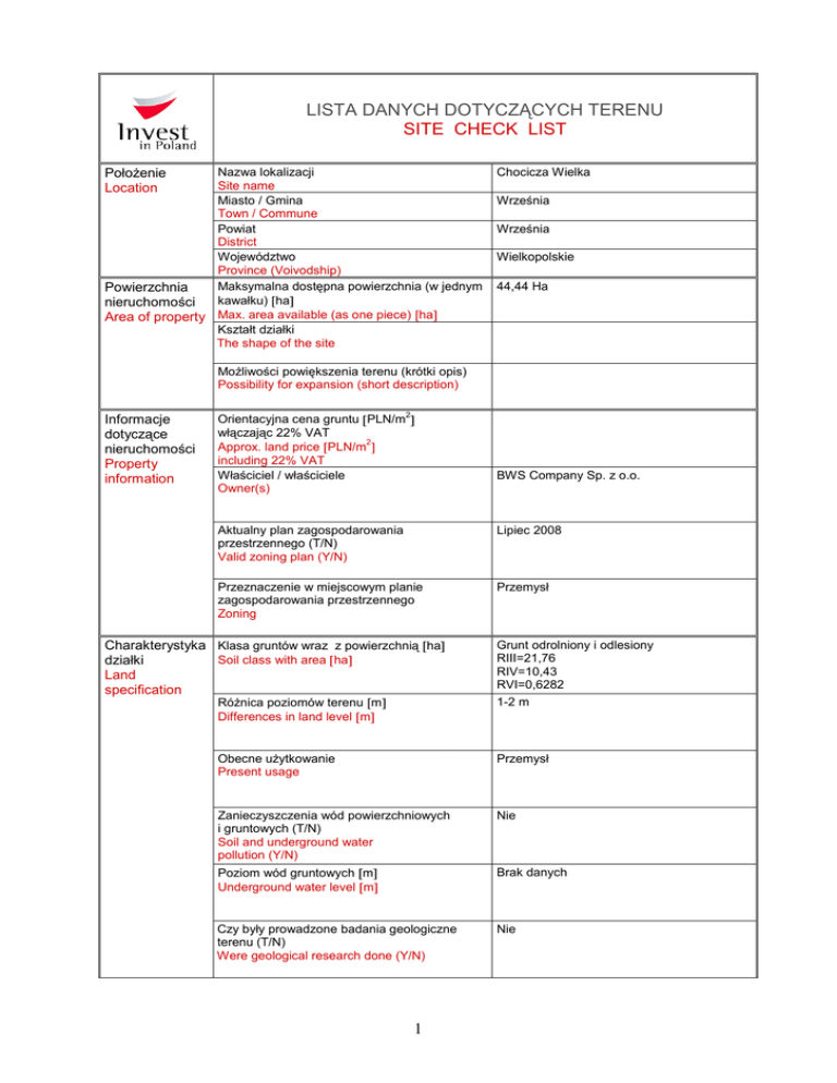 LISTA DANYCH DOTYCZĄCYCH TERENU SITE CHECK LIST Położenie Location Nazwa lokalizacji Site name Miasto / Gmina Town / Commune Powiat District Województwo Province (Voivodship) Maksymalna dostępna powierzchnia (w jednym Powierzchnia kawałku) ha nieruchomości Area of property Max. area available (as one piece) ha Kształt działki The shape of the site Chocicza Wielka Września Września Wielkopolskie 44,44 Ha Możliwości powiększenia terenu (krótki opis) Possibility for expansion (short description) Informacje dotyczące nieruchomości Property information Orientacyjna cena gruntu PLN/m włączając 22% VAT 2 Approx. land price PLN/m including 22% VAT Właściciel / właściciele Owner(s) 2 BWS Company Sp. z o.o. Aktualny plan zagospodarowania przestrzennego (T/N) Valid zoning plan (Y/N) Lipiec 2008 Przeznaczenie w miejscowym planie zagospodarowania przestrzennego Zoning Przemysł Charakterystyka Klasa gruntów wraz z powierzchnią ha Soil class with area ha działki Land specification Różnica poziomów terenu m Differences in land level m Grunt odrolniony i odlesiony RIII=21,76 RIV=10,43 RVI=0,6282 1-2 m Obecne użytkowanie Present usage Przemysł Zanieczyszczenia wód powierzchniowych i gruntowych (T/N) Soil and underground water pollution (Y/N) Nie Poziom wód gruntowych m Underground water level m Brak danych Czy były prowadzone badania geologiczne terenu (T/N) Were geological research done (Y/N) Nie 1 Połączenia transportowe Transport links Ryzyko wystąpienia zalań lub obsunięć terenu (T/N) Risk of flooding or land slide (Y/N) Nie Przeszkody podziemne (T/N) Underground obstacles (Y/N) Nie Przeszkody występujące na powierzchni terenu (T/N) Ground and overhead obstacles (Y/N) Nie Istniejące ograniczenia ekologiczne (T/N) Ecological restrictions (Y/N) Nie Budynki i zabudowania na terenie (T/N) Buildings / other constructions on site (Y/N) 2 budynki pomocnicze gospodarstwa rolnego (2x100 m²) Droga dojazdowa do terenu (rodzaj drogi i jej szerokość) Access road to the plot (type and width of access road) Droga dojazdowa: droga wew. 20 m długosci, wjazd z 2lub 3 stron. Autostrada A2-600m, droga krajowa 92 przylegająca, droga krajowa 15-700m A2(Warszawa-Poznań-Berlin) Autostrada / droga krajowa km Nearest motorway / national road km Porty rzeczne i morskie w odległości do 200 km Sea and river ports located up to 200 km Września-linia kolejowa w sąsiedztwie (teren przylega do linii kolejowej), Berlin-Warszawa, oraz 1,5 km linia Gdańsk-Wrocław Katowice) Kolej km Railway line km Bocznica kolejowa km Railway siding km Istniejąca infrastruktura Existing infrastructure Jest pozwolenie na bocznicę kolejową (teren przylega do linii kolejowej) Najbliższe lotnisko międzynarodowe km Nearest international airport km Poznań (58 km) Najbliższe miasto wojewódzkie km Nearest province capital km Poznań (58 km) Elektryczność na terenie (T/N) Electricity (Y/N) TAK Odległość przyłącza od granicy terenu Connection point (distance from boundary) m Napięcie Voltage kV 0m Dostępna moc Available capacity MW 0,2 MW, możliwość techniczna 25MW Gaz na terenie (T/N) Gas (Y/N) 15 TAK Odległość przyłącza od granicy działki Connection point (distance from 2 600 m od granicy działki boundary) m Wartość kaloryczna 3 Calorific value MJ/Nm 26 MJ/Nm3 Średnica rury Pipe diameter mm 180mm Dostępna objętość 3 Available capacity Nm /h 5000m3/h, technicznie brak ograniczeń Woda na terenie (T/N) Water supply (Y/N) TAK Odległość przyłącza od granicy terenu Connection point (distance from boundary) m Dostępna objętość 3 Available capacity m /24h Kanalizacja na terenie (T/N) Sewage discharge (Y/N) 0m 54m3/24h, technicznie 1100m3/24h TAK Odległość przyłącza od granicy terenu Connection point (distance from boundary) m Dostępna objętość 3 Available capacity m /24h Oczyszczalnia ścieków na terenie bądź w bezpośrednim sąsiedztwie Treatment plant (Y/N) Telefony (T/N) Telephone (Y/N) 500m 54m3/24h, technicznie 1100m3/24h Września TAK Odległość przyłącza od granicy terenu Connection point (distance from boundary) m Możliwość uzyskania specjalnej strefy ekonomicznej Uwagi Comments Osoba przygotowująca ofertę Offer prepared by Osoby do kontaktu Contact person Ewa Wałecka, e-mail: [email protected] tel. (0- 61) 650 01 10 Stanisław Adamczyk, Członek Zarządu (+48 604 77 77 97), angielski, e-mail: [email protected] Wymagane załączniki: Required enclosures: Mapki terenu (włączając infrastrukturę na terenie i sieć połączeń transportowych); Maps of plot (including infrastructure on plot and transport links); 5-10 dobrej jakości zdjęć, dających pełny obraz terenu; 5-10 high-quality photographs giving full view of plot; Zdjęcia lotnicze (o ile są); Aerial photographs (if available). 3