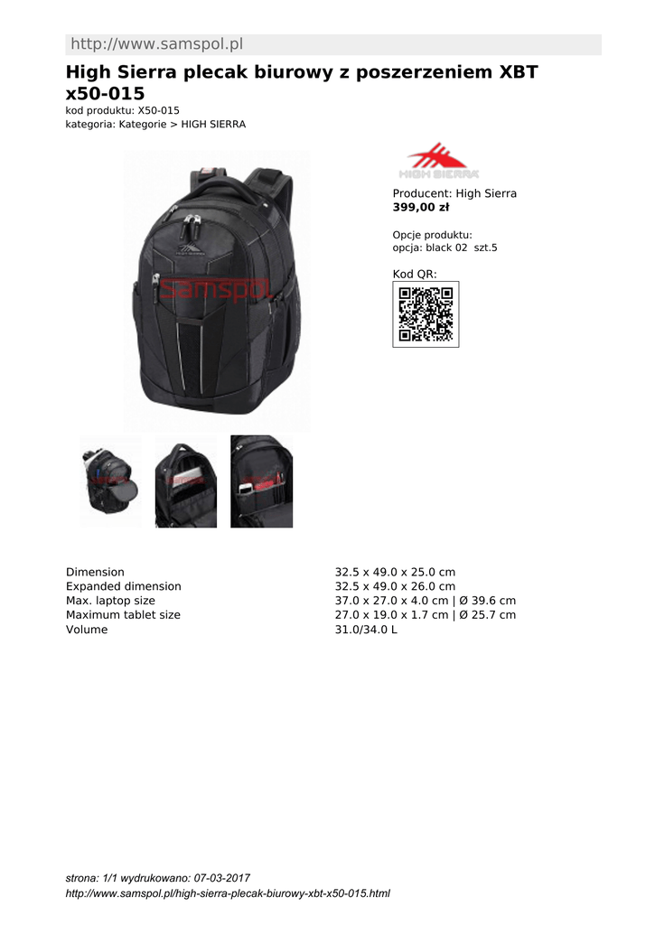 http://www.samspol.pl High Sierra plecak biurowy z poszerzeniem XBT x50-015 kod produktu: X50-015 kategoria: Kategorie > HIGH SIERRA Producent: High Sierra 399,00 zł Opcje produktu: opcja: black 02 szt.5 Kod QR: Dimension Expanded dimension Max. laptop size Maximum tablet size Volume 32.5 x 49.0 32.5 x 49.0 37.0 x 27.0 27.0 x 19.0 31.0/34.0 L strona: 1/1 wydrukowano: 07-03-2017 http://www.samspol.pl/high-sierra-plecak-biurowy-xbt-x50-015.html x x x x 25.0 cm 26.0 cm 4.0 cm | Ø 39.6 cm 1.7 cm | Ø 25.7 cm
