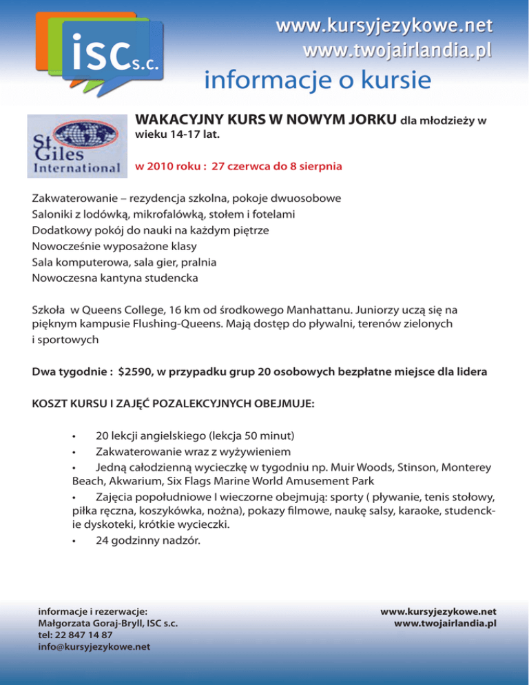 WAKACYJNY KURS W NOWYM JORKU dla młodzieży w wieku 14-17 lat. w 2010 roku : 27 czerwca do 8 sierpnia Zakwaterowanie – rezydencja szkolna, pokoje dwuosobowe Saloniki z lodówką, mikrofalówką, stołem i fotelami Dodatkowy pokój do nauki na każdym piętrze Nowocześnie wyposażone klasy Sala komputerowa, sala gier, pralnia Nowoczesna kantyna studencka Szkoła w Queens College, 16 km od środkowego Manhattanu. Juniorzy uczą się na pięknym kampusie Flushing-Queens. Mają dostęp do pływalni, terenów zielonych i sportowych Dwa tygodnie : $2590, w przypadku grup 20 osobowych bezpłatne miejsce dla lidera KOSZT KURSU I ZAJĘĆ POZALEKCYJNYCH OBEJMUJE: • 20 lekcji angielskiego (lekcja 50 minut) • Zakwaterowanie wraz z wyżywieniem • Jedną całodzienną wycieczkę w tygodniu np. Muir Woods, Stinson, Monterey Beach, Akwarium, Six Flags Marine World Amusement Park • Zajęcia popołudniowe I wieczorne obejmują: sporty ( pływanie, tenis stołowy, piłka ręczna, koszykówka, nożna), pokazy filmowe, naukę salsy, karaoke, studenckie dyskoteki, krótkie wycieczki. • 24 godzinny nadzór. informacje i rezerwacje: Małgorzata Goraj-Bryll, ISC s.c. tel: 22 847 14 87 [email protected] www.kursyjezykowe.net www.twojairlandia.pl