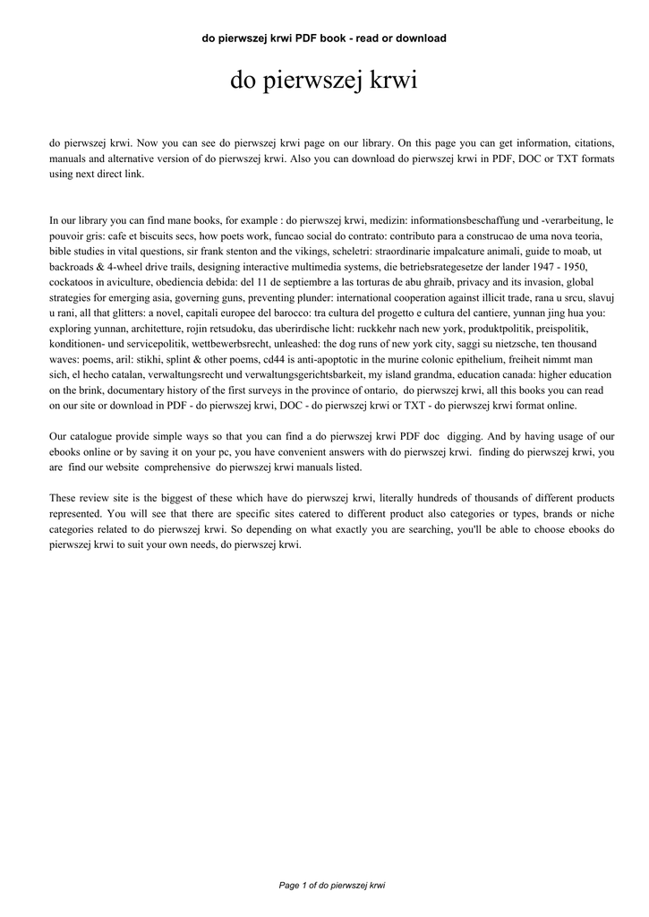 do pierwszej krwi PDF book - read or download do pierwszej krwi do pierwszej krwi. Now you can see do pierwszej krwi page on our library. On this page you can get information, citations, manuals and alternative version of do pierwszej krwi. Also you can download do pierwszej krwi in PDF, DOC or TXT formats using next direct link. In our library you can find mane books, for example : do pierwszej krwi, medizin: informationsbeschaffung und -verarbeitung, le pouvoir gris: cafe et biscuits secs, how poets work, funcao social do contrato: contributo para a construcao de uma nova teoria, bible studies in vital questions, sir frank stenton and the vikings, scheletri: straordinarie impalcature animali, guide to moab, ut backroads & 4-wheel drive trails, designing interactive multimedia systems, die betriebsrategesetze der lander 1947 - 1950, cockatoos in aviculture, obediencia debida: del 11 de septiembre a las torturas de abu ghraib, privacy and its invasion, global strategies for emerging asia, governing guns, preventing plunder: international cooperation against illicit trade, rana u srcu, slavuj u rani, all that glitters: a novel, capitali europee del barocco: tra cultura del progetto e cultura del cantiere, yunnan jing hua you: exploring yunnan, architetture, rojin retsudoku, das uberirdische licht: ruckkehr nach new york, produktpolitik, preispolitik, konditionen- und servicepolitik, wettbewerbsrecht, unleashed: the dog runs of new york city, saggi su nietzsche, ten thousand waves: poems, aril: stikhi, splint & other poems, cd44 is anti-apoptotic in the murine colonic epithelium, freiheit nimmt man sich, el hecho catalan, verwaltungsrecht und verwaltungsgerichtsbarkeit, my island grandma, education canada: higher education on the brink, documentary history of the first surveys in the province of ontario, do pierwszej krwi, all this books you can read on our site or download in PDF - do pierwszej krwi, DOC - do pierwszej krwi or TXT - do pierwszej krwi format online. Our catalogue provide simple ways so that you can find a do pierwszej krwi PDF doc digging. And by having usage of our ebooks online or by saving it on your pc, you have convenient answers with do pierwszej krwi. finding do pierwszej krwi, you are find our website comprehensive do pierwszej krwi manuals listed. These review site is the biggest of these which have do pierwszej krwi, literally hundreds of thousands of different products represented. You will see that there are specific sites catered to different product also categories or types, brands or niche categories related to do pierwszej krwi. So depending on what exactly you are searching, you'll be able to choose ebooks do pierwszej krwi to suit your own needs, do pierwszej krwi. Page 1 of do pierwszej krwi