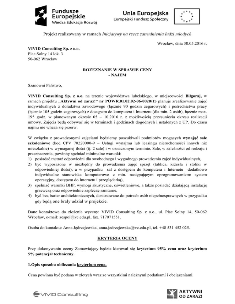Projekt realizowany w ramach Inicjatywy na rzecz zatrudnienia ludzi młodych Wrocław, dnia 30.05.2016 r. VIVID Consulting Sp. z o.o. Plac Solny 14 lok. 3 50-062 Wrocław ROZEZNANIE W SPRAWIE CENY - NAJEM Szanowni Państwo, VIVID Consulting Sp. z o.o. na terenie województwa lubelskiego, w miejscowości Biłgoraj, w ramach projektu „Aktywni od zaraz!” nr POWR.01.02.02-06-0020/15 planuje zrealizowanie zajęć indywidualnych z doradztwa zawodowego (łącznie 90 godzin zegarowych) i pośrednictwa pracy (łącznie 105 godzin zegarowych) z dostępem do komputera i Internetu (dla min. 2 osób), łącznie max. 195 godz. w planowanym okresie 05 – 10.2016 r. z możliwością przesunięcia okresu realizacji umowy. Zajęcia będą odbywać się w terminach i godzinach dogodnych i ustalonych z UP. Do czasu najmu nie wlicza się przerw. W związku z prowadzonymi zajęciami będziemy poszukiwali podmiotów mogących wynająć sale szkoleniowe (kod CPV 70220000-9 – Usługi wynajmu lub leasingu nieruchomości innych niż mieszkalne) w wymaganej ilości (tj. 2 sale) i w oznaczonym terminie. Sale, w zależności od rodzaju i przeznaczenia, powinny spełniać minimalne warunki: 1) posiadać metraż odpowiedni dla swobodnego i wygodnego prowadzenia zajęć indywidualnych, 2) być wyposażone w niezbędny do prowadzenia zajęć sprzęt (tablica, krzesła i stoliki w odpowiedniej ilości), a w przypadku sal z dostępem do komputera i Internetu dodatkowo indywidualne stanowiska komputerowe z min. następującym oprogramowaniem: system operacyjny, dostępem do Internetu i przeglądarką), 3) spełniać warunki BHP, wymogi akustyczne, oświetleniowe, a także posiadać działającą instalację grzewczą oraz odpowiednie zaplecze sanitarne, 4) być bez barier architektonicznych, dostosowane do potrzeb osób niepełnosprawnych w przypadku gdy będą one brały udział w projekcie. Dane kontaktowe do złożenia wyceny: VIVID Consulting Sp. z o.o., ul. Plac Solny 14, 50-062 Wrocław, e-mail: [email protected], fax. 717071551. Osoba do kontaktu: Anna Jędrzejewska, [email protected], tel. +48 531 452 025. KRYTERIA OCENY Przy dokonywaniu oceny Zamawiający będzie kierował się kryterium 95% cena oraz kryterium 5% potencjał techniczny. 1.Opis sposobu obliczania kryterium cena. Cena powinna być podana w złotych wraz ze wszystkimi należnymi podatkami i obciążeniami. Projekt realizowany w ramach Inicjatywy na rzecz zatrudnienia ludzi młodych Punkty przyznawane za kryterium cena będą liczone wg następującego wzoru: C = (Cmin : C0) x 95 gdzie: C – liczba punktów przyznana danej ofercie, Cmin – najniższa cena spośród ważnych ofert, C0 – cena obliczona badanej oferty. Maksymalna liczba punktów do uzyskania przez Wykonawcę w kryterium cena wynosi 95. Wszystkie obliczenia będą dokonywane z dokładnością do dwóch miejsc po przecinku. 2.Opis sposobu obliczania kryterium potencjał techniczny. Przez potencjał techniczny Wykonawcy rozumie się dysponowanie salą szkoleniową/salami szkoleniowymi spełniającymi normy budownictwa energooszczędnego/pasywnego zgodnie z zasadą zrównoważonego rozwoju. Ocena spełnienia tego warunku dla danej sali będzie dokonywana na podstawie oświadczenia Wykonawcy. Punkty przyznawane za kryterium potencjał techniczny będą liczone następująco: Każdy Wykonawca dysponujący salą szkoleniową/salami szkoleniowymi spełniającymi normy budownictwa energooszczędnego/pasywnego zgodnie z zasadą zrównoważonego rozwoju otrzyma dodatkowo 5 punktów za spełnienie kryterium potencjał techniczny dla danej sali. Każdy Wykonawca, który nie dysponuje salą szkoleniową/salami szkoleniowymi spełniającymi normy budownictwa energooszczędnego/pasywnego zgodnie z zasadą zrównoważonego rozwoju otrzyma 0 punktów za spełnienie kryterium potencjał techniczny dla danej sali. Maksymalna liczba punktów do uzyskania przez Wykonawcę w kryterium potencjał techniczny dla danej sali wynosi 5. Ważna wycena, która uzyska najwyższą liczbę punktów za daną salę (suma kryteriów cena + potencjał techniczny) uznana zostanie za najkorzystniejszą. DODATKOWE INFORMACJE Informujemy, iż w umowie najmu, poza powyższymi wymaganiami, zawarte zostaną postanowienia dotyczące: - obowiązku świadczenia usługi z należytą starannością i wysokimi standardami przyjętymi na rynku, - możliwości zmiany liczby godzin najmu, - obowiązku archiwizacji dokumentów związanych z realizacją umowy na zasadach określonych przez Najemcę, - obowiązku oznaczenia sal oraz budynków, w których będą prowadzone zajęcia zgodnie z zasadami PO WER 2014-2020, Projekt realizowany w ramach Inicjatywy na rzecz zatrudnienia ludzi młodych - obowiązku zapłaty na rzecz Najemcy kar umownych w przypadku nieprzestrzegania harmonogramów, świadczenia usługi bez zachowania należytej staranności (w tym zapisy o możliwości potrącania naliczonych kar umownych z wynagrodzenia Wynajmującego; zastrzegające Najemcy możliwość dochodzenia od Wynajmującego odszkodowania przenoszącego wysokość kar umownych, na zasadach ogólnych; zakazujące Wynajmującemu dokonywania cesji wierzytelności należności wynikających z tytułu realizacji umowy na banki, firmy ubezpieczeniowe, inne podmioty gospodarcze czy osoby fizyczne lub prawne), - obowiązku poddania się kontroli dokonywanej przez Najemcę, Instytucję Pośredniczącą oraz inne uprawnione podmioty w zakresie prawidłowości realizacji Projektu, - możliwości występowania opóźnień w płatnościach wynagrodzenia Wynajmującemu, które uzależnione będzie od terminu wpłynięcia na konto W środków przeznaczonych na pokrycie wydatków związanych realizacją umowy na etapie, w którym uczestniczył w nim Wynajmujący Informujemy, iż niniejsze rozeznanie w sprawie ceny ma charakter informacyjny i nie zobowiązuje Zamawiającego do zawarcia umowy na określonych warunkach i z określonym podmiotem oraz nie rodzi po stroni