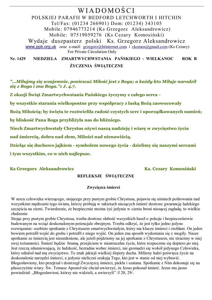 WIADOMOŚCI POLSKIEJ PARAFII W BEDFORD LETCHWORTH I HITCHIN Tel/Fax: (01234 266901) Dom: (01234) 343105 Mobile: 07946773214 (Ks Grzegorz Aleksandrowicz) Mobile: 07519059276 (Ks Cezary Komosi ński) Wydaje duszpasterz polski Ks. Grzegorz Aleksandrowicz www.ppb.org.uk oraz e-mail: [email protected] i [email protected] (Ks Cezary) For Private Circulation Only Nr. 1429 NIEDZIELA ZMARTWYCHWSTANIA PAŃSKIEGO - WIELKANOC ROK B ŻYCZENIA ŚWIĄTECZNE "...Miłujmy się wzajemnie, ponieważ Miłość jest z Boga; a każdy kto Miłuje narodził się z Boga i zna Boga."1 J. 4.7. Z okazji Świąt Zmartwychwstania Pańskiego życzymy z całego serca by wszystkie starania wielkopostne przy współpracy z łaską Bożą zaowocowały Bożą Miłością; by święta te rozświeliła radość czystych serc i uporządkowanych sumień; by bliskość Pana Boga przybliżyła nas do bliźniego. Niech Zmartwychwstały Chrystus ożywi naszą nadzieję i wiarę w zwycięstwo życia nad śmiercią, dobra nad złem, Miłości nad nienawiścią. Dzieląc się duchowo jajkiem - symbolem nowego życia - dzielimy się naszymi sercami i tym wszystkim, co w nich najlepsze. Ks Grzegorz Aleksandrowicz Ks. Cezary Komosiński REFLEKSJE ŚWIĄTECZNE Zwycięzca śmierci W sercu człowieka wierzącego, stojącego przy pustym grobie Chrystusa, pojawia się uśmiech politowania nad wszystkimi mędrcami tego świata, którzy próbują w rakietach niosących śmierć dostrzec gwarancję ludzkiego szczęścia na ziemi. Twierdzenie, że bezpiecznie można żyć jedynie w cieniu broni niosącej zagładę, to wielkie złudzenie. Stojąc przy pustym grobie Chrystusa, trzeba dostrzec słabość wszystkich haseł o pokoju i bezpieczeństwie budowanym na wciąż doskonalonym potencjale zbrojnym. Trzeba odkryć, że jest tylko jedno jedyne rozwiązanie: osobiste spotkanie z Chrystusem zmartwychwstałym, który ma klucze śmierci i otchłani. On jeden bowiem potrafił wejść do grobu i potrafił z niego wyjść. On jeden zna sposób wydostania się z mogiły. Nasze spotkanie ze śmiercią jest nieuniknione, ale jeżeli pójdziemy na jej spotkanie z Chrystusem, nie stracimy w niej swej tożsamości. Śmierć będzie bramą, przejściem w nieutracalne życie, które rozpocznie się dopiero po niej. Jest rzeczą zdumiewającą, że ludzkość, bezradna wobec śmierci, nie gromadzi się wokół jedynego Człowieka, który odniósł nad nią zwycięstwo. To znak jakiejś wielkiej ślepoty ducha. Miliony ludzi poświęca życie na doskonalenie narzędzi śmierci, a jedynie nieliczni szukają Tego, kto jest w stanie od niej wybawić. Błogosławiony, kto przejrzał i dostrzegł Zwycięzcę śmierci, piekła i szatana. Spotkanie z Nim dokonuje się na płaszczyźnie wiary. Św. Tomasz Apostoł nie chciał uwierzyć, że Jezus pokonał śmierć. Jezus mu jasno powiedział: „Błogosławieni, którzy nie widzieli, a uwierzyli” /J 20, 29/. MSZE ŚWIĘTE I NABOŻEŃSTWA w BEDFORD: Charity Reg.No.1119423 - NIEDZIELA ZMARTWYCHWSTANIA PAŃSKIEGO – WIELKANOC Godz. 9.30 - W INTENCJI PARAFIAN. Godz.11.00 - W INTENCJI PARAFIAN Godz.19.00 - W INTENCJI PARAFIAN Poniedziałek, 6.04. - PONIEDZIAŁEK WIELKANOCNY. Godz. 9.30 - O błog. Boże dla Lucyny i Mariana Jurkowskich z okazji 18-ej rocznicy ślubu. Godz.11.00 - O błog. Boże dla Zofii Sułkowskiej z ok. 1-ej rocznicy urodzin – int. rodziców. Godz.19.00 - za dusze ś.p. zmarłych z rodzin Drzymałów, Kołodziejów i Kwiatkowkich int. Pani Teresy Drzymała Wtorek, 7.04.2015 Godz. 9.30 - Intencja wolna. Godz.19.00 - Intencja wolna. Środa, 8.04.2015 Godz. 9.30 - Intencja wolna. Godz.19.00 - za dusze ś.p. zmarłych z rodzin Aliny i Edwarda Grochowskich i za dusze w czyśćcu cierpiące - int. rodziny. Czwartek, 9.04.2015 Godz. 9.30 - Msza święta żałobna i Pogrzeb ś.p. Wandy Ireny Sarad. Godz.19.00 - Intencja wolna. Piątek, 10.04.2015 Godz.15.00 - Intencja wolna. KORONKA DO MIŁOSIERDZIA BOŻEGO. Godz.19.00 - Intencja wolna. Sobota, 11.04.2015 Godz. 9.30 - Intencja wolna. Godz.10.00 - ADORACJA NAJŚWIĘTSZEGO SAKRAMENTU. Godz.19.00 - za dusze ś.p.Arkadiusza Stanilewicza w 6-tą rocznicę śmierci–int. matki z rodziną Niedziela,12.04.2015 DRUGA NIEDZIELA WIELKANOCY – MIŁOSIERDZIA BOŻEGO Godz. 9.30 - O wierność powołania dla osób konsekrowanych za wstawiennictwem św. siostry Faustyny z okazji święta Miłosierdzia Bożego – int. rodziny. Godz.11.00 - za dusze w czyśćcu cierpiące. Godz.19.00 - O błog. Boże i opiekę Matki Bożej dla Pawła z okazji urodzin – int. rodziny. Poniedziałek, 13.04 Godz. 9.30 - Intencja wolna Godz.19.00 - Intencja wolna. Wtorek. 14.04.2015 Godz. 9.30 - Intencja wolna Godz.19.00 - Intencja wolna. Środa, 15.04.2015 Godz. 9.30 - Intencja wolna. Godz.19.00 - Intencja wolna. Czwartek,16.04.2015 Godz. 9.30 - Intencja wolna Godz.19.00 - Intencja wolna. Piątek, 17.04.2015 Godz.15.00 - Intencja wolna KORONKA DO MIŁOSIERDZIA BOŻEGO Godz.19.00 - Intencja wolna. Sobota, 18.04.2015 Godz. 9.30 - Intencja wolna. Godz.10.00 - ADORACJA NAJŚWIĘTSZEGO SAKRAMENTU. Godz.19.00 - Intencja wolna. OGŁOSZENIA PARAFIALNE: 1. Od najbliższego tygodnia rozpoczynamy nowy rozkład codziennych Mszy św. Odtąd będą odprawiane codziennie Msze św rano o godz.9.30 z wyjątkiem piątku o godz.15.00 i codziennie wieczorem o godz19.00 2. Przez cały najbliższy tydzień odprawiamy codziennie Koronkę do Miłosierdzia Bożego. 3. Najbliższy Kurs Przedmałżeński odbędzie się w dniach: 12, 19 i 26 kwietnia po Mszy św – godz.19.00 4. W niedzielę 26 kwietnia w Domu Polskim o godz. 15.00 odbędzie się tradycyjne Święcone Parafialne. 5. Są do nabycia „Gość Niedzielny,” „Mały Gość Niedzielny,” „Różaniec”, „Tak Rodzinie” i „Anioł Stróż.” 6. W dniach od 12 do 19 czerwca 2015 r. organizowana jest z naszej parafii w Bedford Pielgrzymka do Francji do Sanktuariów Maryjnych ( Lourdes i La Salette ). Koszt pielgrzymki wynosi Ł 470 POGRZEB: W środę