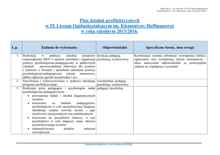 Załącznik nr 2 do uchwały nr 24/15 rady pedagogicznej Zespołu Szkół nr 125 w Warszawie z dnia 31sierpnia 2015 r. Plan działań profilaktycznych w IX Liceum Ogólnokształcącym im. Klementyny Hoffmanowej w roku szkolnym 2015/2016. L.p. 1. 2. 3. Zadania do wykonania Odpowiedzialni Realizacja w praktyce szkolnej przepisów rozporządzenia MEN w sprawie udzielania i organizacji pomocy psychologiczno-pedagogicznej w publicznych szkołach – upowszechnianie informacji dla uczniów i rodziców o formach i sposobach udzielania pomocy psychologiczno-pedagogicznej (strona internetowa, tablice ogłoszeń, gazetki uczniowskie i in.) Nowelizacja i wykorzystywanie w praktyce szkolnego programu profilaktycznego. Realizacja przez pedagogów i psychologów zadań psychologiczno-pedagogicznych: • prowadzenie badań i działań diagnostycznych uczniów, • kierowanie na badania pedagogicznopsychologiczne w celu specjalistycznej diagnozy aktualnego stopnia rozwoju ucznia i jego możliwości emocjonalnych oraz intelektualnych • kierowanie do specjalistów (lekarzy, w tym psychiatrów) w celu diagnozy stanu zdrowia psychofizycznego uczniów • minimalizowanie skutków zaburzeń rozwojowych dyrekcja, pedagog, psycholog, wychowawcy wicedyrektor, pedagog, psycholog, wychowawcy pedagog i psycholog Działania profilaktyczne w roku szkolnym 2015/2016. Specyficzne formy, inne uwagi: Koordynacja systemu informacji wewnętrznej (tablice, ogłoszenia) oraz zewnętrznej (strona internetowa) – także nauczyciele odpowiedzialni za poszczególne zadania we współpracy z uczniami • 4. 5. 6. 7. 8. udzielanie pomocy i wsparcia uczniom w adaptacji do nowego środowiska oraz w radzeniu sobie z wyzwaniami szkolnoedukacyjnymi i zapobiegania zaburzeniom zachowania, • inicjowanie i prowadzenie działań mediacyjnych i interwencyjnych w sytuacjach kryzysowych, • pomoc rodzicom i nauczycielom w rozpoznawaniu i rozwijaniu możliwości, predyspozycji i uzdolnień uczniów. Współpraca z poradniami psychologiczno- pedagog, psycholog pedagogicznymi, poradnią TOP, innymi poradniami specjalistycznymi, Dzielnicowym Centrum Integracji Profilaktyka uzależnień od tytoniu, alkoholu, środków pedagog, psycholog, psychoaktywnych wychowawcy, pielęgniarka szkolna Kierowanie osób potrzebujących specjalistycznej pomocy, kontakt z instytucjami i monitorowanie efektów Realizacja projektów klasowych o tematyce związanej z uzależnieniami (np. dzień bez papierosa), działania profilaktyczne ze strony gabinetu lekarskopielęgniarskiego psycholog, Realizacja projektów klasowych (np. nt. cyberprzemocy) Zapobieganie zachowaniom agresywnym i przestępczym, oraz szkodliwemu wykorzystywaniu cyberprzestrzeni Zapewnienie uczniom bezpieczeństwa poprzez m. in. • całoroczną współpracę z patrolem szkolnym (policjanci, strażnicy miejscy) w zakresie kontroli, reagowania i podejmowania interwencji oraz rozpoznawania zagrożeń, • aktywne i skuteczne pełnienie dyżurów nauczycielskich, • monitoring obiektu szkolnego pedagog, wychowawcy Przygotowywanie uczniów do wypełniania w dorosłym życiu obowiązków rodzinnych, ról społecznych i obywatelskich w oparciu o system uniwersalnych wartości. wszyscy nauczyciele, Projekty klasowe, zajęcia z wychowawcą, przedmiot pedagog, psycholog, „wychowanie do życia w rodzinie” nauczyciele prowadzący przedmiot „wychowanie do życia w rodzinie” dyrekcja, pedagog, psycholog, wychowawcy, Działania profilaktyczne w roku szkolnym 2015/2016. 9. 10. 11. 12. 13. Zajęcia, wycieczki i wyjazdy integracyjne dla uczniów kl. I w celu m. in. rozwijania pozytywnych nawyków i umiejętności: • zasady uczestnictwa w grupie rówieśniczej, budowanie udanych relacji i postaw prospołecznych, • konstruktywne rozwiązywanie konfliktów i odreagowywanie napięć, • propagowanie wzorców zdrowego stylu życia i spędzania wolnego czasu, • motywowanie uczniów do własnego rozwoju • indywidualne wsparcie dla osób z trudnościami w adaptacji w nowym środowisku Wykorzystywanie programów profilaktycznych Ośrodka Rozwoju Edukacji dotyczących profilaktyki uzależnień oraz agresji i przemocy, w tym także w rodzinie. Współpraca ze Strażą Miejską w realizacji jej programów profilaktycznych dotyczących odpowiedzialności prawnej nieletnich oraz zachowań ryzykownych: program „Decyduję odpowiedzialnie”. Współpraca z Warszawskim Centrum Pomocy Rodzinie oraz z dzielnicowymi Centrami Pomocy Społecznej w zakresie udzielania stosownego wsparcia młodzieży (opłacanie posiłków uczniom z rodzin uprawnionych). Realizacja programu promocji zdrowia m. st. Warszawy „Zdrowy Uczeń” w zakresie tematycznym: • Higiena i jej wpływ na zdrowie fizyczne i psychiczne, • Zdrowe i racjonalne odżywianie, • Pierwsza pomoc i bezpieczeństwo zdrowotne, • Wczesne wykrywanie chorób nowotworowych, • Profilaktyka chorób układu krążenia. 14. Współpraca z rodzicami – pedagogizacja rodziców w zakresie: - profilaktyki uzależnień i niedostosowania wychowawcy oddziałów kl. I, pedagog, psycholog pedagog, wychowawcy psycholog, Wybór programów profilaktycznych adekwatnych wobec oczekiwań i potrzeb młodzieży LO pedagog, wychowawcy psycholog, pedagog, psycholog lekarz, pielęgniarka nauczyciele wychowawcy, pedagog, psycholog, rada rodziców Działania profilaktyczne w roku szkolnym 2015/2016. Także edukacja rówieśnicza realizowana przez studentów pierwszych lat medycyny (profilaktyka zaburzeń odżywiania) oraz projekty klasowe dotyczące problematyki promocji zdrowia i profilaktyki chorób i zaburzeń 15. 16. 17. 18. społecznego, - kształtowania właściwych postaw, - rozwiązywania bieżących problemów rodzinnych • Warsztaty technik radzenia ze stresem egzaminacyjnym oraz skuteczne sposoby przygotowania do zdawania egzaminów zewnętrznych – oddziały klasy III • Przygotowanie do przyszłych wyborów edukacyjnych/zawodowych – testy predyspozycji, konsul