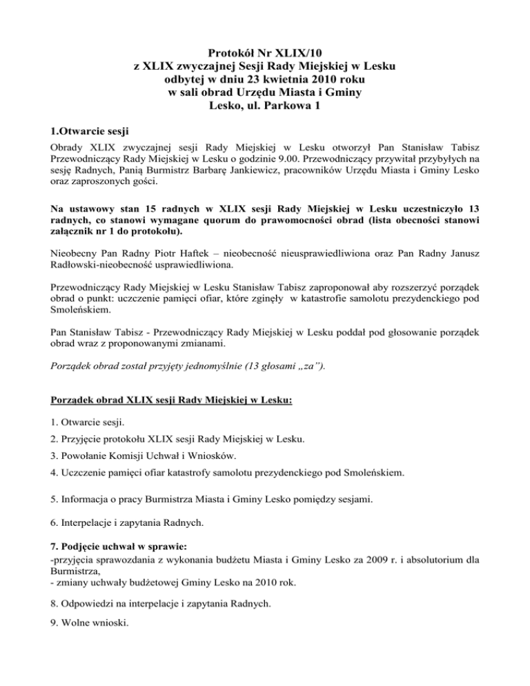 Protokół Nr XLIX/10 z XLIX zwyczajnej Sesji Rady Miejskiej w Lesku odbytej w dniu 23 kwietnia 2010 roku w sali obrad Urzędu Miasta i Gminy Lesko, ul. Parkowa 1 1.Otwarcie sesji Obrady XLIX zwyczajnej sesji Rady Miejskiej w Lesku otworzył Pan Stanisław Tabisz Przewodniczący Rady Miejskiej w Lesku o godzinie 9.00. Przewodniczący przywitał przybyłych na sesję Radnych, Panią Burmistrz Barbarę Jankiewicz, pracowników Urzędu Miasta i Gminy Lesko oraz zaproszonych gości. Na ustawowy stan 15 radnych w XLIX sesji Rady Miejskiej w Lesku uczestniczyło 13 radnych, co stanowi wymagane quorum do prawomocności obrad (lista obecności stanowi załącznik nr 1 do protokołu). Nieobecny Pan Radny Piotr Haftek – nieobecność nieusprawiedliwiona oraz Pan Radny Janusz Radłowski-nieobecność usprawiedliwiona. Przewodniczący Rady Miejskiej w Lesku Stanisław Tabisz zaproponował aby rozszerzyć porządek obrad o punkt: uczczenie pamięci ofiar, które zginęły w katastrofie samolotu prezydenckiego pod Smoleńskiem. Pan Stanisław Tabisz - Przewodniczący Rady Miejskiej w Lesku poddał pod głosowanie porządek obrad wraz z proponowanymi zmianami. Porządek obrad został przyjęty jednomyślnie (13 głosami „za”). Porządek obrad XLIX sesji Rady Miejskiej w Lesku: 1. Otwarcie sesji. 2. Przyjęcie protokołu XLIX sesji Rady Miejskiej w Lesku. 3. Powołanie Komisji Uchwał i Wniosków. 4. Uczczenie pamięci ofiar katastrofy samolotu prezydenckiego pod Smoleńskiem. 5. Informacja o pracy Burmistrza Miasta i Gminy Lesko pomiędzy sesjami. 6. Interpelacje i zapytania Radnych. 7. Podjęcie uchwał w sprawie: -przyjęcia sprawozdania z wykonania budżetu Miasta i Gminy Lesko za 2009 r. i absolutorium dla Burmistrza, - zmiany uchwały budżetowej Gminy Lesko na 2010 rok. 8. Odpowiedzi na interpelacje i zapytania Radnych. 9. Wolne wnioski. 10. Sprawozdanie Komisji Uchwał i Wniosków. 11.Zakończenie obrad sesji Rady Miejskiej w Lesku. 2. Przyjęcie protokołu z XLVIII sesji Rady Miejskiej w Lesku Pan Stanisław Tabisz - Przewodniczący Rady Miejskiej przypomniał, że protokół z poprzedniej sesji wyłożony był w Biurze Rady, oraz zwrócił się do Radnych z zapytaniem czy zgłaszają uwagi do protokołu. Wobec braku uwag Przewodniczący Rady Miejskiej w Lesku poddał pod głosowanie przyjęcie protokołu Nr XLVIII/10 z dnia 31 marca 2010 r. Protokół z sesji Nr XVIII/10 z dnia 31 marca 2010 r. został przyjęty jednomyślnie (13 głosów „za”). 3. Powołanie Komisji Uchwał i Wniosków Pan Stanisław Tabisz - Przewodniczący Rady Miejskiej zaproponował, aby w skład Komisji Uchwał i Wniosków weszli następujący radni: 1. Pan Radny Edward Klaczak 2. Pani Radna Lucyna Otta 3. Pani Radna Maria Pękalska. W wyniku głosowania zaproponowany skład Komisji Uchwał i Wniosków został przyjęty jednomyślnie (13 głosów „za”). 4. Uczczenie pamięci ofiar katastrofy samolotu prezydenckiego pod Smoleńskiem. Po krótkim przemówieniu Przewodniczącego Rady Miejskiej w Lesku Stanisława Tabisza ks. Piotr Przeszłowski poprowadził modlitwę za ofiary katastrofy samolotu prezydenckiego, które zginęły pod Smoleńskiem. Następnie Pan Roman Wolan odegrał na trąbce „Ciszę” podczas której nastąpiła chwila zadumy. 5. Informacje o pracy Burmistrza między sesjami 1/ Droga Krzyżowa Samorządowców na Tarnicę- 2 kwietnia 2010r. 2/Spotkanie z Prezesem Sądu w sprawie zatrudnienia skazanych- 7 kwietnia 2010r. 3/ Odbiór parku- 9 kwietnia 2010r. 4/ Powiatowa Rada Zatrudnienia- 9 kwietnia 2010r. 5/ Lokalna Grupa Działania- 14 kwietnia 2010 r. 6/ Rada Budowy- 15 kwietnia 2010r. 7/ Spotkanie Kebek- 15 kwietnia 2010r. 8/ Objazd dróg gminnych- 16 kwietnia 2010r. 9/ Tworzenei fundacji – szpital-Starostwo Powiatowe w Lesku-19 kwietnia 2010r. 10/ Ostanie pożegnanie Tomasza Merty oraz Leszka Deptuły- 20 kwietnia 2010r. 11/ Spotkanie z dziećmi Specjalnego Ośrodka Szkolno - Wychowawczego w Lesku- 22 kwietnia 2010 r. 12/ Wspólnoty Mieszkaniowe- 22 kwietnia 2010r. 6. Interpelacje i zapytania radnych Pani Aniceta Baran Radna Rady Miejskiej w Lesku zwróciła się z pytaniem do Pani Burmistrz odnośnie ul. Piłsudskiego, ponieważ ruch został wzmożony a droga coraz bardziej zaczyna się pochylać. Zapytała czy było coś zrobione aby poprawić tą nawierzchnię. Pani Radna Aniceta Baran zapytała również czy byłaby możliwość postawienia na osiedlu Smolki większego kosza na plastiki lub częstszego opróżniania pojemników na plastik. Pani Barbara Jankiewicz Burmistrz Miasta i Gminy Lesko wyjaśniła, że jeżeli chodzi o ul. Piłsudskiego to jest to droga krajowa. Kilkakrotnie odbyło się spotkanie w związku z koniecznością przebudowy tej drogi. Na chwilę obecną badania geologiczne wykazały, że nie jest to miejsce osuwiskowe. Zły stan tej drogi jest efektem braku odwodnienia. Pani Burmistrz poinformowała, że będzie w tej sprawie interweniowała. Odnośnie pytania drugiego Pani Burmistrz zaproponowała dokupienie dwóch dodatkowych pojemników i dostawienie ich na osiedlu. 7. Podjęcie uchwał Pani Małgorzata Kormosz Skarbnik Gminy Lesko oraz Pani Barbara Jankiewicz Burmistrz Miasta i Gminy Lesko przedstawiły szczegółowe informacje finansowe i opisowe dotyczące sprawozdania budzetu Miasta i Gminy Lesko za 2009 rok. Pani Skarbnik wyjaśniła, że po dokonanych zmianach budżet Miasta i Gminy Lesko na 2009 r. wyniósł 26.922.897 zł. Dochody budżetowe wykonano w kwocie 26.917.642 zł co stanowi 100 % planu. Plan wydatków budżetu w 2009 roku wyniósł 31.422.897 zł. Wydatki budżetowe wykonano w kwocie 29.150.269 zł, co stanowi 92,8 % planu. Zadłużenie Gminy na koniec 2009 r. wyniosło 9.419.274 zł, co stanowi 35 % planowanych i wykonanych dochodów. Największy udział w dochodach ogółem stanowiły dochody własne Gminy (10.045.715 zł-37,3 %); drugim co do wielkości źródłem dochodów były subwencje ogólne z budżetu państwa ( 9.339.541 zł-34,