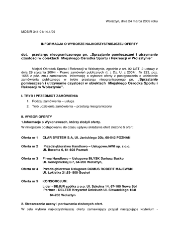 Wolsztyn, dnia 24 marca 2009 roku MOSIR 341 01/14.1/09 INFORMACJA O WYBORZE NAJKORZYSTNIEJSZEJ OFERTY dot. przetargu nieograniczonego pn. „Sprz tanie pomieszcze i utrzymanie czysto ci w obiektach Miejskiego O rodka Sportu i Rekreacji w Wolsztynie” Miejski O rodek Sportu i Rekreacji w Wolsztynie, zgodnie z art. 92 UST. 2 ustawy z dnia 29 stycznia 2004r - Prawo zamówie publicznych (t. j. Dz. U. z 2007r., Nr 223, poz. 1655 z pó . zm.) zamieszcza informacj o wyborze oferty z post powania o udzielenie zamówienia publicznego w trybie przetargu nieograniczonego pn. „Sprz tanie pomieszcze i utrzymanie czysto ci w obiektach Miejskiego O rodka Sportu i Rekreacji w Wolsztynie”. I. TRYB I PRZEDMIOT ZAMÓWIENIA 1. Rodzaj zamówienia – usługa 2. Tryb udzielenia zamówienia – przetarg nieograniczony II. WYBÓR OFERTY 1.Informacje o Wykonawcach, którzy zło yli oferty. W niniejszym post powaniu do czasu upływu składania ofert zło ono 5 ofert: Oferta nr 1 CLAR SYSTEM S.A, Ul. Janickiego 20b, 60-542 POZNA Oferta nr 2 Przedsi biorstwo Handlowo – UsługoweJAWI sp. z o.o. Ul. Boranta 6, 61-608 Pozna Oferta nr 3 Firma Handlowo – Usługowa BŁYSK Dariusz Bu ko Ul. Konopnickiej 6/7, 64-200 Wolsztyn, Oferta nr 4 Przedsi biorstwo Usługowe DOMUS ROBERT MAJEWSKI Ul. Łokietka 21,63- 800 Gosty Oferta nr 5 KONSORCJUM: Lider - BEJUR spółka z o.o. Ul. Szkolna 14, 67-100 Nowa Sól Partner - DELTER Krzysztof Dele uch Ul. Słowackiego 12/8 64-200 Wolsztyn 2. Streszczenie oceny i porównania zło onych ofert. W celu wyboru najkorzystniejszej oferty zamawiaj cy przyj ł nast puj ce kryterium - przypisuj c mu odpowiednio wag procentow : cena oferty brutto 100% Streszczenie oceny : Lp. 1. 2. 3. 4. 5. Nazwa Wykonawcy CLAR SYSTEM S.A Ul. Janickiego 20b, 60-542 POZNA Przedsi biorstwo Handlowo – UsługoweJAWI sp. z o.o. Ul. Boranta 6, 61-608 Pozna Firma Handlowo – Usługowa BŁYSK Dariusz Bu ko Ul. Konopnickiej 6/7, 64-200 Wolsztyn Przedsi biorstwo Usługowe DOMUS ROBERT MAJEWSKI Ul. Łokietka 21, 63- 800 Gosty KONSORCJUM: Lider - BEJUR spółka z o.o. Ul. Szkolna 14, 67-100 Nowa Sól Partner - DELTER Krzysztof Dele uch Ul. Słowackiego 12/8, 64-200 Wolsztyn Przyznana ilo punktów w kryterium cena Ł czna punktacja przyznana przez członków Komisji (417.126,91 zł / 529.949,70 zł) x 100 % x 100 pkt = 78,71 pkt (417.126,91 zł/ 417.126,91 zł) x 100 % x 100 pkt = 100,00 pkt (417.126,91 zł / 482.988,24 100 % x 100 pkt = 86,36 pkt zł) x (417.126,91 zł / 550.830,00 100 % x 100 pkt = 75,73 pkt zł) x (417.126,91 zł / 942.944,10 100 % x 100 pkt = 44,24 pkt zł) x 300,00 3.Informacja o wyborze najkorzystniejszej oferty Do realizacji zamówienia wybrano ofert , któr zło yła firma: Przedsi biorstwo Handlowo – UsługoweJAWI sp. z o.o. Ul. Boranta 6, 61-608 Pozna Cena oferty wybranej: 417.126,91 zł Słownie: czterysta siedemna cie tysi cy sto dwadzie cia sze złotych 91/100 4.Uzasadnienie wyboru: Wykonawca spełnił wszystkie warunki udziału w post powaniu zawarte w SIWZ i w ustawie – Prawo zamówie publicznych, zło ył ofert nie podlegaj c odrzuceniu oraz otrzymałmaksymaln ilo punktów w ocenie ofert.