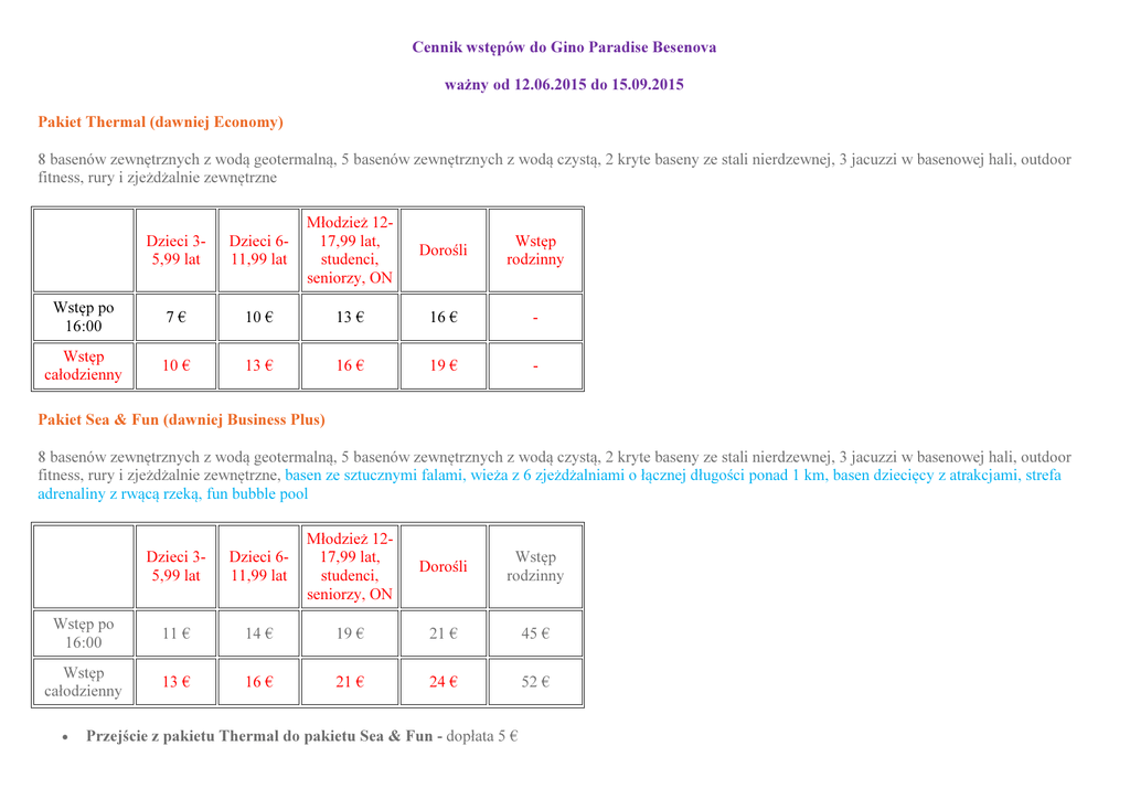 Cennik wstępów do Gino Paradise Besenova ważny od 12.06.2015 do 15.09.2015 Pakiet Thermal (dawniej Economy) 8 basenów zewnętrznych z wodą geotermalną, 5 basenów zewnętrznych z wodą czystą, 2 kryte baseny ze stali nierdzewnej, 3 jacuzzi w basenowej hali, outdoor fitness, rury i zjeżdżalnie zewnętrzne Dzieci 35,99 lat Dzieci 611,99 lat Młodzież 1217,99 lat, studenci, seniorzy, ON Dorośli Wstęp rodzinny Wstęp po 16:00 7€ 10 € 13 € 16 € - Wstęp całodzienny 10 € 13 € 16 € 19 € - Pakiet Sea & Fun (dawniej Business Plus) 8 basenów zewnętrznych z wodą geotermalną, 5 basenów zewnętrznych z wodą czystą, 2 kryte baseny ze stali nierdzewnej, 3 jacuzzi w basenowej hali, outdoor fitness, rury i zjeżdżalnie zewnętrzne, basen ze sztucznymi falami, wieża z 6 zjeżdżalniami o łącznej długości ponad 1 km, basen dziecięcy z atrakcjami, strefa adrenaliny z rwącą rzeką, fun bubble pool Dzieci 35,99 lat Dzieci 611,99 lat Młodzież 1217,99 lat, studenci, seniorzy, ON Dorośli Wstęp rodzinny Wstęp po 16:00 11 € 14 € 19 € 21 € 45 € Wstęp całodzienny 13 € 16 € 21 € 24 € 52 € • Przejście z pakietu Thermal do pakietu Sea & Fun - dopłata 5 € Cennik dodatkowy: cena Nurkowanie (10 minut z instruktorem 01.07.2015 - 31.08.2015) 15 € Masaż tajski (30 minut) 26 € Sejf 4€ Kaucja za klucz do sejfu 10 € Wypożyczenie szlafroka 5€ Strata (zgubienie) chipu** 40 € **Strata chipu: opłata 40 € (po stracie chipu ośrodek nie ponosi odpowiedzialności za kredyt na nim) Ważne informacje: Senior: od lat 60, wstęp na podstawie ważnego dokumentu ze zdjęciem. Dziecko: do 2,99 lat wstęp gratis (maksymalnie dwoje dzieci na jedną osobę dorosłą). Dzieci 3-11,99 na podstawie ważnego dokumentu ze zdjęciem. Młodzież: od 12 do 18 lat na podstawie ważnego dokumentu ze zdjęciem. (ON) Osoba niepełnosprawna: na podstawie odpowiedniego dokumentu ze zdjęciem. Wstęp rodzinny: 2 osoby dorosłe + 1 dziecko w wieku 3-11,99 lat. Dodatkowe dzieci płacą po 8 € /wstęp. Maksymalna liczba dzieci na 2 osoby dorosłe to 4. Debet na chipie - 30 € (na usługi gastronomiczne, masaże itp.). Kwotę na chipie należy uregulować przy wyjściu z aquaparku. Zakup wstępu po godzinie 16:00 możliwy jest wyłącznie w kasie aquaparku. Grupy w aquaparku: Zniżki grupowe na pakiety Thermal oraz Sea & Fun: • każda 21 osoba w grupie gratis • • 10% zniżki dla grup liczących powyżej 20 osób 20% zniżki dla grup liczących powyżej 40 osób Inne zniżki: • • • • • • • Posiadacz kart Euro26, ISIC lub ITIC - 10% zniżka na całodzienne wejście w pakietach Economy, Business Plus, VIP Plus Opiekun osoby niepełnosprawnej płaci jak senior (jedna osoba). Posiadacz ważnej Karty Liptov zniżki 5 - 20% - więcej informacji na stronie www.visitliptov.sk Zniżek nie można łączyć. Ceny podane są w EUR i zawierają podatek VAT. Każdy gość wstępujący na teren kąpieliska powinien zapoznać się z regulaminem Gino Paradise Besenova i go przestrzegać. Zmiana pogody nie upoważnia do zwrotu biletów. Zastrzega się możliwość zmiany cennika.