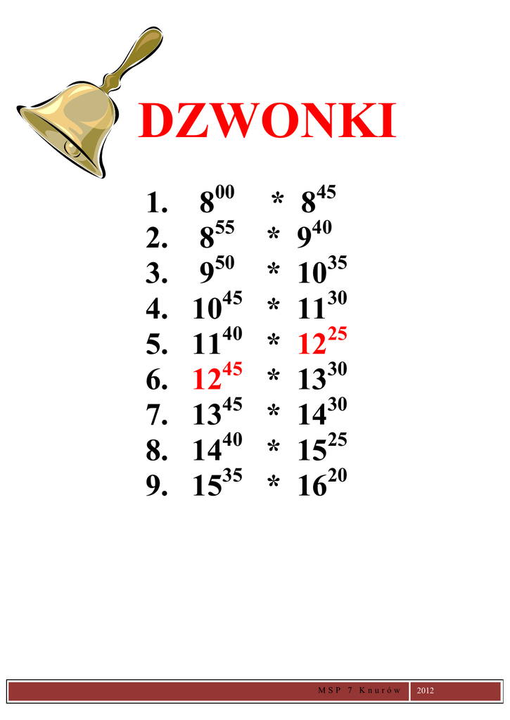 DZWONKI 1. 2. 3. 4. 5. 6. 7. 8. 9. 00 8 55 8 50 9 45 10 40 11 45 12 45 13 40 14 35 15 * * * * * * * * * 45 8 40 9 35 10 30 11 25 12 30 13 30 14 25 15 20 16 MSP 7 Knurów 2012