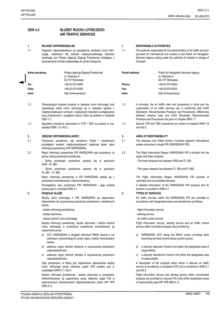 GEN 3.3-1 AIP POLSKA AIP POLAND AIRAC effective date GEN 3.3 08 JAN 2015 SŁUŻBY RUCHU LOTNICZEGO AIR TRAFFIC SERVICES 1. WŁADZE ODPOWIEDZIALNE 1. RESPONSIBLE AUTHORITIES 1.1 Organem odpowiedzialnym za zarządzanie służbami ruchu lotniczego, ustalonymi dla potrzeb międzynarodowego lotnictwa cywilnego jest Polska Agencja Żeglugi Powietrznej działająca z upoważnienia ministra właściwego do spraw transportu. 1.1 The authority responsible for the administration of air traffic services provided for international civil aviation is the Polish Air Navigation Services Agency acting under the authority of minister in charge of transport. Adres pocztowy: Polska Agencja Żeglugi Powietrznej ul. Wieżowa 8 02-147 Warszawa Postal address: Polish Air Navigation Services Agency ul. Wieżowa 8 02-147 Warszawa Tel.: +48-22-574-5000 Phone: +48-22-574-5000 Faks: +48-22-574-5005 Fax: +48-22-574-5005 www: http://www.pansa.pl www: http://www.pansa.pl 1.2 Obowiązujące krajowe przepisy w zakresie ruchu lotniczego oraz organizacja służb ruchu lotniczego są w zasadzie zgodne z międzynarodowymi normami i zalecanymi metodami postępowania oraz procedurami z wyjątkiem różnic, które są podane w rozdziale GEN 1.7. 1.2 In principle, the air traffic rules and procedures in force and the organization of air traffic services are in conformity with ICAO Standards, Recommended Practices and Procedures. Differences between national rules and ICAO Standards, Recommended Practices and Procedures are given in chapter GEN 1.7. 1.3 Specjalne procedury stosowane w CTR i TMA są podane w rozdziałach ENR 1.6 i AD 2. 1.3 Special CTR and TMA procedures are shown in chapters ENR 1.6 and AD 2. 2. OBSZAR ODPOWIEDZIALNOŚCI 2. AREA OF RESPONSIBILITY 2.1 Przestrzeń powietrzna nad terytorium Polski i określonymi przyległymi wodami międzynarodowymi obejmuje jeden rejon informacji powietrznej (FIR WARSZAWA). 2.1 The airspace over Polish territory including adjacent international waters comprises a single FIR (WARSZAWA FIR). 2.2 Rejon informacji powietrznej FIR WARSZAWA jest podzielony na górną i dolną przestrzeń powietrzną. 2.2 The Flight Information Region WARSZAWA FIR is divided into the upper and lower airspace. 3. - Dolna przestrzeń powietrzna zawiera się w granicach GND - FL 285. - The lower airspace lies between GND and FL 285. - Górna przestrzeń powietrzna zawiera się w granicach FL 285 - FL 660. - The upper airspace lies between FL 285 and FL 660. Rejon informacji powietrznej w FIR WARSZAWA składa się z przestrzeni kontrolowanej i niekontrolowanej. The Flight Information Region WARSZAWA FIR consists of controlled and uncontrolled airspace. Szczegółowy opis przestrzeni FIR WARSZAWA i jego podział podany jest w rozdziale ENR 2.1. A detailed description of the WARSZAWA FIR airspace and its division is provided in ENR 2.1. RODZAJE SŁUŻB Służby ruchu lotniczego w FIR WARSZAWA są zapewniane odpowiednio do wyznaczonej przestrzeni powietrznej i określonych lotnisk: 3. TYPES OF SERVICES Air traffic services within the WARSZAWA FIR are provided in accordance with designated areas and aerodromes as follows: - służba informacji powietrznej, - flight information service, - służba alarmowa, - alerting service, - służba kontroli ruchu lotniczego. - air traffic control service. Służba informacji powietrznej, służba alarmowa i służba kontroli ruchu lotniczego w przestrzeni powietrznej kontrolowanej są zapewniane przez: Flight information service, alerting service and air traffic control service within controlled airspace are provided by: a) ACC WARSZAWA w drogach lotniczych RNAV łącznie z ich odcinkami przechodzącymi przez rejony (strefy) kontrolowane lotnisk; a) WARSZAWA ACC along the RNAV routes including parts traversing terminal control areas (control zones); b) właściwy organ kontroli zbliżania w wyznaczonej przestrzeni odpowiedzialności; b) a relevant Approach Control Unit within the designated area of responsibility; c) właściwy organ kontroli lotniska w wyznaczonej przestrzeni odpowiedzialności; c) a relevant Aerodrome Control Unit within the designated area of responsibility; Opis przestrzeni, w której jest zapewniana odpowiednia służba ruchu lotniczego przez właściwy organ ATS podany jest w rozdziałach ENR 2.1 i AD 2. A description of the airspace within which a relevant air traffic service is provided by a competent ATS unit is contained in ENR 2.1 and AD 2. Służba informacji powietrznej i służba alarmowa w przestrzeni niekontrolowanej są zapewniane przez właściwy organ FIS w wyznaczonych przestrzeniach odpowiedzialności (patrz AIP VFR GEN 4.1). Flight information service and alerting service within uncontrolled airspace are provided by relevant FIS units within designated areas of responsibility (see AIP VFR GEN 4.1). POLSKA AGENCJA ŻEGLUGI POWIETRZNEJ POLISH AIR NAVIGATION SERVICES AGENCY AIRAC AMDT 158 GEN 3.3-2 AIP POLSKA AIP POLAND AIRAC effective date 31 MAR 2016 4. KOORDYNACJA MIĘDZY UŻYTKOWNIKAMI A ATS 4. 5. MINIMALNA WYSOKOŚĆ BEZWZGLĘDNA LOTU 5. TEREN GÓRZYSTY W FIR WARSZAWA 7. MINIMUM FLIGHT ALTITUDE Minimum flight altitudes for IFR flights have been established in accordance with ICAO Doc 8168 - Procedures for Air Navigation Services - Aircraft Operations, Vol. II, in a way which provides the required minimum obstacle clearance. Minimalne wysokości bezwzględne lotu dla lotów IFR zostały wyznaczone zgodnie z dokumentem ICAO Doc 8168 - Procedury służb żeglugi powietrznej - Operacje statków powietrznych, tom II, w taki sposób, aby zapewnić minimalne wymagane przewyższenie nad przeszkodami. 6. COORDINATION BETWEEN THE OPERATORS AND ATS Coordination between the operators and air traffic services is effected in accordance with Item 2.16 of Annex 11 to the Convention on International Civil Aviation - Air Traffic Services. Koordynacja między użytkownikami i służbami ruchu lotniczego dokonywana jest zgodnie z punktem 2.16 Załącznika