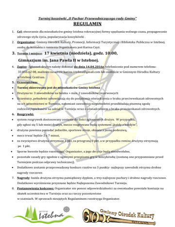 Turniej koszówki „O Puchar Przewodniczącego rady Gminy” REGULAMIN 1. Cel: stworzenie dla mieszkańców gminy Istebna rekreacyjnej formy spędzania wolnego czasu, propagowanie zdrowego stylu życia, popularyzacja koszykówki . 2. Organizator: Gminny Ośrodek Kultury, Promocji, Informacji Turystycznej i Biblioteka Publiczna w Istebnej. osobą do kontaktu z ramienia Organizatora jest Karina Czyż. 3. Termin i miejsce: 17 kwietnia (niedziela), godz. 10:00, Gimnazjum im. Jana Pawła II w Istebnej. 4. Zapisy: Zgłoszeń drużyn należy dokonać do dnia 14.04.2016r. telefonicznie pod numerem telefonu: 33 855 62 08, mailowo na adres: [email protected] lub osobiście w Gminnym Ośrodku Kultury w Istebnej Centrum. 5. Uczestnictwo: Turniej skierowany jest do mieszkańców Gminy Istebna Drużyna to: 3 zawodników na boisku + max. 2 zawodników rezerwowych Uczestnicy, pełnoletni zobowiązują się do podpisania oświadczenia o braku przeciwwskazań zdrowotnych na ich uczestnictwo w Turnieju, natomiast zawodnicy niepełnoletni przedkładają pisemną zgodę rodziców/opiekunów na udział w Turnieju wraz z oświadczeniem o braku przeciwskazań zdrowotnych. 6. Rozgrywki: system rozgrywek dostosowany zostanie do ilości zgłoszonych drużyn. W przypadku, gdy zgłosi się 5 lub mniej drużyn, mecze rozgrywane będą systemem „każdy z każdym”, drużyna powinna posiadać jednolite, sportowe stroje, obuwie z jasną podeszwą, mecz trwać będzie 2 x 7 minut, za zwycięstwo drużyna otrzymuje 3 pkt, za przegraną 0 pkt, a w przypadku remisu drużyny otrzymują po 1 pkt. Sporne kwestie będzie rozstrzygać Organizator, a jego decyzje będą nieodwołalne, pozostałe zasady gry zgodnie z ogólnymi przepisami gry w koszykówkę (zostaną one przypomniane przed Turniejem podczas odprawy technicznej). Dodatkowo zostanie przeprowadzony konkurs rzutów na 3 punkty- najlepszy zawodnik otrzyma drobne nagrody rzeczowe. 7. Nagrody: każda drużyna otrzyma pamiątkowy dyplom, a trzy najlepsze puchary i drobne nagrody rzeczowe. Dodatkowe wyróżnienie przyznane będzie Najlepszemu Zawodnikowi Turnieju. 8. Postanowienia końcowe: Organizator nie ponosi odpowiedzialności za ewentualne powstałe kontuzje na skutek uczestnictwa w Turnieju oraz za rzeczy pozostawione w szatniach. W sprawach nieujętych Regulaminem rozstrzyga Organizator.