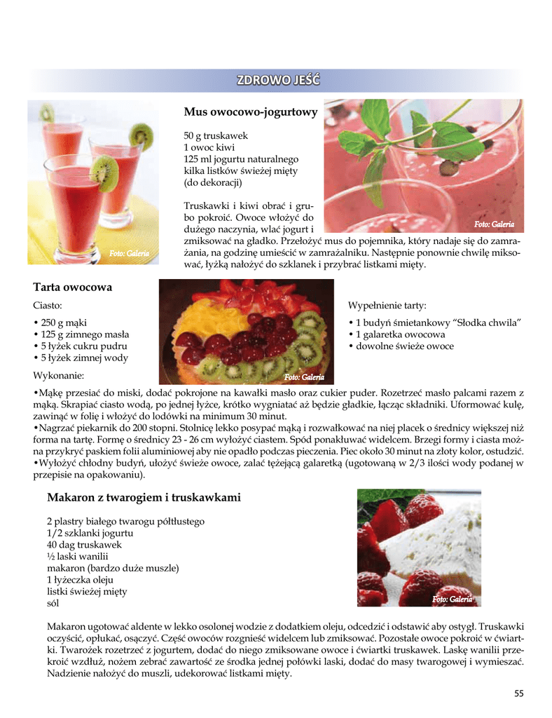ZDROWO JEŚĆ Mus owocowo-jogurtowy 50 g truskawek 1 owoc kiwi 125 ml jogurtu naturalnego kilka listków świeżej mięty (do dekoracji) Foto: Galeria Truskawki i kiwi obrać i grubo pokroić. Owoce włożyć do Foto: Galeria dużego naczynia, wlać jogurt i zmiksować na gładko. Przełożyć mus do pojemnika, który nadaje się do zamrażania, na godzinę umieścić w zamrażalniku. Następnie ponownie chwilę miksować, łyżką nałożyć do szklanek i przybrać listkami mięty. Tarta owocowa Ciasto: Wypełnienie tarty: • 250 g mąki • 125 g zimnego masła • 5 łyżek cukru pudru • 5 łyżek zimnej wody • 1 budyń śmietankowy “Słodka chwila” • 1 galaretka owocowa • dowolne świeże owoce Wykonanie: Foto: Galeria •Mąkę przesiać do miski, dodać pokrojone na kawałki masło oraz cukier puder. Rozetrzeć masło palcami razem z mąką. Skrapiać ciasto wodą, po jednej łyżce, krótko wygniatać aż będzie gładkie, łącząc składniki. Uformować kulę, zawinąć w folię i włożyć do lodówki na minimum 30 minut. •Nagrzać piekarnik do 200 stopni. Stolnicę lekko posypać mąką i rozwałkować na niej placek o średnicy większej niż forma na tartę. Formę o średnicy 23 - 26 cm wyłożyć ciastem. Spód ponakłuwać widelcem. Brzegi formy i ciasta można przykryć paskiem folii aluminiowej aby nie opadło podczas pieczenia. Piec około 30 minut na złoty kolor, ostudzić. •Wyłożyć chłodny budyń, ułożyć świeże owoce, zalać tężejącą galaretką (ugotowaną w 2/3 ilości wody podanej w przepisie na opakowaniu). Makaron z twarogiem i truskawkami 2 plastry białego twarogu półtłustego 1/2 szklanki jogurtu 40 dag truskawek ½ laski wanilii makaron (bardzo duże muszle) 1 łyżeczka oleju listki świeżej mięty sól Foto: Galeria Makaron ugotować aldente w lekko osolonej wodzie z dodatkiem oleju, odcedzić i odstawić aby ostygł. Truskawki oczyścić, opłukać, osączyć. Część owoców rozgnieść widelcem lub zmiksować. Pozostałe owoce pokroić w ćwiartki. Twarożek rozetrzeć z jogurtem, dodać do niego zmiksowane owoce i ćwiartki truskawek. Laskę wanilii przekroić wzdłuż, nożem zebrać zawartość ze środka jednej połówki laski, dodać do masy twarogowej i wymieszać. Nadzienie nałożyć do muszli, udekorować listkami mięty. 55
