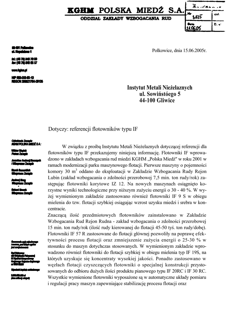 Polkowice, dnia 15.06.2005r. Instytut Metali Nieżelaznych ul. Sowiństóego 5 44-100 Gliwice Dotyczy: referencji flotowników typu IF W związku z prośbą Instytutu Metali Nieżelaznych dotyczącej referencji dla flotowników typu IF przekazujemy niniejszą informację. Flotowniki IF wprowadzono w zakładach wzbogacania rud miedzi KGHM „Polska Miedź" w roku 2001 w ramach modernizacji parku maszynowego flotacji. Pierwsze maszyny o pojemności komory 30 m3 oddano do eksploatacji w Zakładzie Wzbogacania Rudy Rejon Lubin (zakład wzbogacania o zdolności przerobowej 7,5 min. ton rudy/rok) zastępując flotowniki korytowe IZ 12. Na nowych maszynach osiągnięto korzystne wyniki technologiczne przy niższym zużyciu energii o 30 - 40 %. W wyżej wymienionym zakładzie zastosowano również flotowniki IF 9 S w obiegu mielenia do tzw. flotacji szybkiej osiągając wzrost uzysku miedzi i srebra w koncentracie. Znaczącą ilość przedmiotowych flotowników zainstalowano w Zakładzie Wzbogacania Rud Rejon Rudna - zakład wzbogacania o zdolności przerobowej 15 min. ton rudy/rok (ilość rudy kierowanej do flotacji 45-50 tyś. ton rudy/dobę). Flotowniki IF 57 R zastosowane do flotacji głównej pozwoliły na poprawę efektywności procesu flotacji oraz zmniejszenie zużycia energii o 25-30 % w stosunku do maszyn dotychczas stosowanych. W wymienionym zakładzie wprowadzono również flotowniki do flotacji szybkiej w obiegu mielenia typ IF 19S, na których uzyskuje się koncentraty wysokiej jakości. Ponadto zastosowano w węzłach flotacji czyszczących flotowniki o specjalnej konstrukcji przystosowanych do odbioru dużych ilości produktu pianowego typu IF 20RC i IF 30 RC. Wszystkie wymienione flotowniki wyposażone są w automatyczne układy pomiaru i regulacji pracy maszyn zapewniające stabilizację procesu flotacji oraz układy dozowania odczynników flotacyjnych. Dotychczas zainstalowano 64 maszyny o pojemności blisko 2400 m3. Stwierdzamy, że flototowniki nowej generacji typu IF w porównaniu do dotychczas stosowanych cechuje: • wysoka efektywność technologiczna pozwalająca na uzyskiwanie optymalnych wskaźników w zakresie uzysku i jakości koncentratów, • niskie koszty inwestycyjne i eksploatacyjne, szczególnie w zakresie zużycia energii oraz wytrzymałości ściernej poszczególnych elementów maszyn, • najnowsze rozwiązania w zakresie automatyzacji i stabilizacji procesu flotacji oraz możliwość stabilizacji parametrów nadawy kierowanej do flotacji W załączeniu przesyłamy zestawienie flotownikówzakupionych w Instytucie Metali Nieżelaznych pracujących w naszych zakładach wzbogacania. Zestawienie Flotowników typu IF zakupionych dotychczas przez O/Zakłady Wzbogacania Rud lp Typ Operacja 1. IF-30 Flotacja w obiegu domielania, rada Cu KGHM P M S.A. Zakład Wzbogacania Lubin w Lubinie 2 2001 2. IF-30 Flotacja główna frakcji węglanowej, ruda Cu KGHM P M S. A. Zakład Wzbogacania Lubin w Lubinie 9 2001 3. IF-9S Flotacja w obiegu I mielenia, ruda Cu KGHM P M S.A. Zakład Wzbogacania Lubin w Lubinie 3 2002 4. IF-19S Flotacja w obiegu I mielenia, rada Cu KGHM P M S. A. Zakład Wzbogacania Rudna w Polkowicach 5 2002 5. IF-20RC Flotacja czyszcząca, ruda Cu KGHM P M S. A. Zakład Wzbogacania Rudna w Polkowicach 1 2002 1 2002 7 2003 Flotacja czyszcząca, ruda Cu KGHM P M S. A. Zakład Wzbogacania Rudna w Polkowicach 2 2003 Flotacja w obiegu I mielenia, ruda Cu KGHM P M S. A. Zakład Wzbogacania Rudna w Polkowicach 4 2003 Flotacja gł. frakcji węglanowej, rada Cu KGHM P M S.A. Zakład Wzbogacania Rudna w Polkowicach 7 2004 16 2004 7 2005 Flotacja w obiegu I czyszczenia węglanów, ruda Cu 6. IF-30RC KGHM P M S. A. Zakład Wzbogacania Rudna w Polkowi- 7. IF-57R 8. IF-20RC 9. IF-19S 10. IF-57R 11. IF-30 12. IF-57 R cach Flotacja główna frakcji piaskowcowej, ruda Cu KGHM P M S. A. Zakład Wzbogacania Rudna w Polkowicach Flotacja w obiegu chemicznej obróbki półproduktów, rada Cu. KGHM PM S. A. Zakład Wzbogacania Polkowice w Polkowicach Flotacja główna frakcji węglanowej, rad a Cu KGHM P M S. A. Zakład Wzbogacania Rudna w Polkowicach Ilość Dostawa