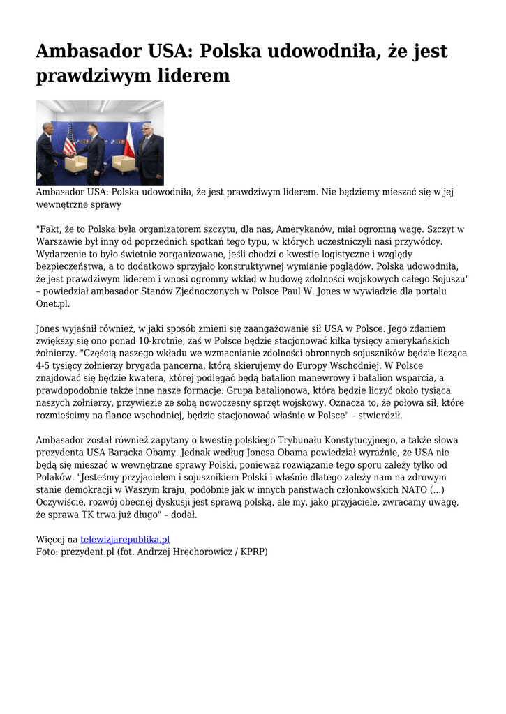 Ambasador USA: Polska udowodniła, że jest prawdziwym liderem Ambasador USA: Polska udowodniła, że jest prawdziwym liderem. Nie będziemy mieszać się w jej wewnętrzne sprawy "Fakt, że to Polska była organizatorem szczytu, dla nas, Amerykanów, miał ogromną wagę. Szczyt w Warszawie był inny od poprzednich spotkań tego typu, w których uczestniczyli nasi przywódcy. Wydarzenie to było świetnie zorganizowane, jeśli chodzi o kwestie logistyczne i względy bezpieczeństwa, a to dodatkowo sprzyjało konstruktywnej wymianie poglądów. Polska udowodniła, że jest prawdziwym liderem i wnosi ogromny wkład w budowę zdolności wojskowych całego Sojuszu" – powiedział ambasador Stanów Zjednoczonych w Polsce Paul W. Jones w wywiadzie dla portalu Onet.pl. Jones wyjaśnił również, w jaki sposób zmieni się zaangażowanie sił USA w Polsce. Jego zdaniem zwiększy się ono ponad 10-krotnie, zaś w Polsce będzie stacjonować kilka tysięcy amerykańskich żołnierzy. "Częścią naszego wkładu we wzmacnianie zdolności obronnych sojuszników będzie licząca 4-5 tysięcy żołnierzy brygada pancerna, którą skierujemy do Europy Wschodniej. W Polsce znajdować się będzie kwatera, której podlegać będą batalion manewrowy i batalion wsparcia, a prawdopodobnie także inne nasze formacje. Grupa batalionowa, która będzie liczyć około tysiąca naszych żołnierzy, przywiezie ze sobą nowoczesny sprzęt wojskowy. Oznacza to, że połowa sił, które rozmieścimy na flance wschodniej, będzie stacjonować właśnie w Polsce" – stwierdził. Ambasador został również zapytany o kwestię polskiego Trybunału Konstytucyjnego, a także słowa prezydenta USA Baracka Obamy. Jednak według Jonesa Obama powiedział wyraźnie, że USA nie będą się mieszać w wewnętrzne sprawy Polski, ponieważ rozwiązanie tego sporu zależy tylko od Polaków. "Jesteśmy przyjacielem i sojusznikiem Polski i właśnie dlatego zależy nam na zdrowym stanie demokracji w Waszym kraju, podobnie jak w innych państwach członkowskich NATO (...) Oczywiście, rozwój obecnej dyskusji jest sprawą polską, ale my, jako przyjaciele, zwracamy uwagę, że sprawa TK trwa już długo" – dodał. Więcej na telewizjarepublika.pl Foto: prezydent.pl (fot. Andrzej Hrechorowicz / KPRP)
