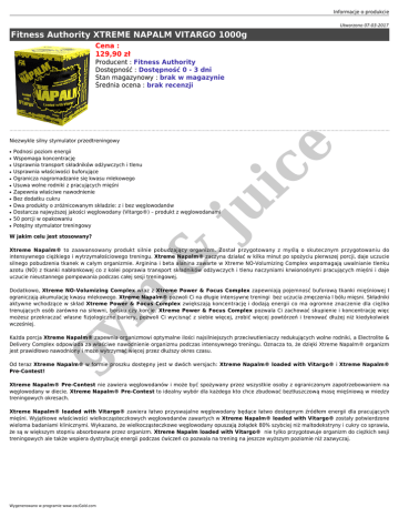 Informacje o produkcie Utworzono 07-03-2017 Fitness Authority XTREME NAPALM VITARGO 1000g Cena : 129,90 zł Producent : Fitness Authority Dostępność : Dostępność 0 - 3 dni Stan magazynowy : brak w magazynie Średnia ocena : brak recenzji ● ● ● ● ● ● ● ● ● ● ● ● ju ic e Niezwykle silny stymulator przedtreningowy Podnosi poziom energii Wspomaga koncentrację Usprawnia transport składników odżywczych i tlenu Usprawnia właściwości buforujące Ogranicza nagromadzanie się kwasu mlekowego Usuwa wolne rodniki z pracujących mięśni Zapewnia właściwe nawodnienie Bez dodatku cukru Dwa produkty o zróżnicowanym składzie: z i bez węglowodanów Dostarcza najwyższej jakości węglowodany (Vitargo®) – produkt z węglowodanami 50 porcji w opakowaniu Potężny stymulator treningowy W jakim celu jest stosowany? & Xtreme Napalm® to zaawansowany produkt silnie pobudzający organizm. Został przygotowany z myślą o skutecznym przygotowaniu do intensywnego ciężkiego i wytrzymałościowego treningu. Xtreme Napalm® zaczyna działać w kilka minut po spożyciu pierwszej porcji, daje uczucie silnego pobudzenia tkanek w całym organizmie. Arginina i beta alanina zawarte w Xtreme NO-Volumizing Complex wspomagają uwalnianie tlenku azotu (NO) z tkanki nabłonkowej co z kolei poprawia transport składników odżywczych i tlenu naczyniami krwionośnymi pracujących mięśni i daje uczucie nieustannego pompowania podczas całej sesji treningowej. gy m Dodatkowo, Xtreme NO-Volumizing Complex wraz z Xtreme Power & Focus Complex zapewniają pojemnosć buforową tkanki mięśniowej I ograniczają akumulację kwasu mlekowego. Xtreme Napalm® pozwoli Ci na długie intensywne treningi bez uczucia zmęczenia I bólu mięsni. Składniki aktywne wchodzące w skład Xtreme Power & Focus Complex zwiększają koncentrację i dodają energii co ma ogromne znaczenie dla ciężko trenujących osób zarówno na siłowni, boisku czy korcie. Xtreme Power & Focus Complex pozwala Ci zachować skupienie i koncentrację więc możesz przekraczać własne fizjologiczne bariery, pozwoli Ci wycisnąć z siebie więcej, zrobić więcej powtórzeń i trenować dłużej niż kiedykolwiek wcześniej. Każda porcja Xtreme Napalm® zapewnia organizmowi optymalne ilości najsilniejszych przeciwutleniaczy redukujących wolne rodniki, a Electrolite & Delivery Complex odpowiada za właściwe nawodnienie organizmu podczas intensywnego treningu. Oznacza to, że dzięki Xtreme Napalm® organizm jest prawidłowo nawodniony i może wytrzymać więcej przez dłuższy okres czasu. Od teraz Xtreme Napalm® w formie proszku dostępny jest w dwóch wersjach: Xtreme Napalm® loaded with Vitargo® i Xtreme Napalm® Pre-Contest! Xtreme Napalm® Pre-Contest nie zawiera węglowodanów i może być spożywany przez wszystkie osoby z ograniczonym zapotrzebowaniem na węglowodany w diecie. Xtreme Napalm® Pre-Contest to idealny wybór dla każdego kto chce zbudować beztłuszczową masę mięśniową w miedzy treningowych okresach. Xtreme Napalm® loaded with Vitargo® zawiera łatwo przyswajalne węglowodany będące łatwo dostępnym źródłem energii dla pracujących mięśni. Wyjątkowe właściwości wielkocząsteczkowych węglowodanów zawartych w Xtreme Napalm® loaded with Vitargo® zostały potwierdzone wieloma badaniami klinicznymi. Wykazano, że wielkocząsteczkowe węglowodany opuszają żołądek 80% szybciej niż maltodekstryny i cukry co sprawia, że są w większym stopniu absorbowane przez organizm. Xtreme Napalm loaded with Vitargo® nie tylko przygotowuje organizm do ciężkich sesji treningowych ale także wspiera dystrybucję energii podczas ćwiczeń co pozwala na trening na jeszcze wyższym poziomie niż zazwyczaj. Wygenerowano w programie www.oscGold.com Wartości odżywcze Porcja: 2 miarki (20 g) Ilość porcji w opakowaniu: 50 Zawartość: 1000 g Wartość energetyczna w porcji 159 kJ / 23 kcal Białko 0 g ZDS ** Węglowodany 9,5 g Tłuszcz 0 g ** ** Sód (selenian sodu, wodorowęglan sodu) 0,05 g ** Witamina C (kwas L-askorbinowy) 200 mg 250 % Niacyna (amid kwasu nikotynowego) 20 mg 125 % Witamina B6 (chlorowodorek pirydoksyny) 8 mg 571 % Witamina B12 (cyjanokobalamina) 10 µg 400 % Selen (selenian sodu) 55 µg 100 % Fosfor (fosforan magnezu i potasu) 110 mg 16 % Alfaketoglutaran argininy ** Beta alanina XTREME POWER & FOCUS COMPLEX 3100 mg Tauryna ** ju ic e NAPALM PROPRIETARY FORMULA XTREME NO-VULUMIZING COMPLEX 6000 mg ** ** Kofeina bezwodna ** Jabłczan cytruliny ** Glukuronolakton ** ELECTROLITE & DELIVERY COMPLEX 10460 mg ** Skrobia jęczmienna Vitargo® ** Wodorowęglan sodu ** Fosforan potasu ** Fosforan magnezu ** & % ZDS – procent realizacji zalecanego dziennego spożycia ** - zalecane dzienne spożycie nie zostało ustalone m POZOSTAŁE SKŁADNIKI: Aromat, substancja słodząca (sukraloza), barwnik (E110). ZALECANE SPOŻYCIE: Zmieszać 2 miarki Xtreme Napalm® loaded with Vitargo® z 200-300 ml zimnego płynu. Spożywać jedną porcję 30 minut przed treningiem. Dostępne opcje Fitness Authority XTREME NAPALM VITARGO 1000g gy » smak: pomarańcza.