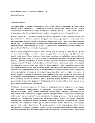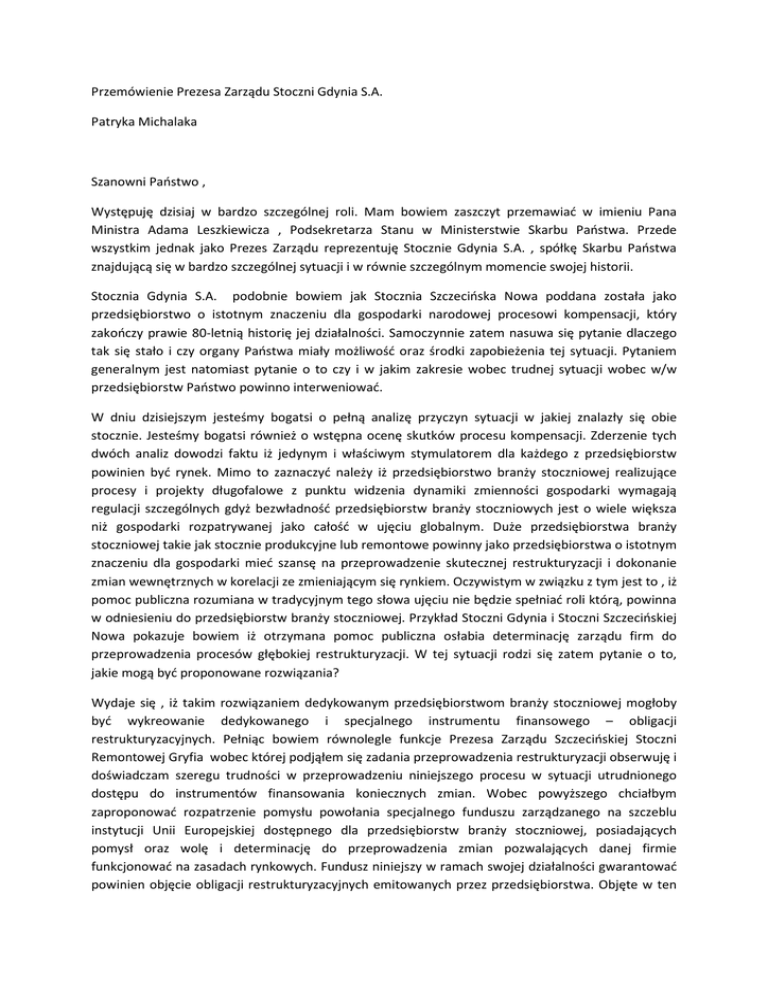 Przemówienie Prezesa Zarządu Stoczni Gdynia S.A. Patryka Michalaka Szanowni Państwo , Występuję dzisiaj w bardzo szczególnej roli. Mam bowiem zaszczyt przemawiać w imieniu Pana Ministra Adama Leszkiewicza , Podsekretarza Stanu w Ministerstwie Skarbu Państwa. Przede wszystkim jednak jako Prezes Zarządu reprezentuję Stocznie Gdynia S.A. , spółkę Skarbu Państwa znajdującą się w bardzo szczególnej sytuacji i w równie szczególnym momencie swojej historii. Stocznia Gdynia S.A. podobnie bowiem jak Stocznia Szczecińska Nowa poddana została jako przedsiębiorstwo o istotnym znaczeniu dla gospodarki narodowej procesowi kompensacji, który zakończy prawie 80-letnią historię jej działalności. Samoczynnie zatem nasuwa się pytanie dlaczego tak się stało i czy organy Państwa miały możliwość oraz środki zapobieżenia tej sytuacji. Pytaniem generalnym jest natomiast pytanie o to czy i w jakim zakresie wobec trudnej sytuacji wobec w/w przedsiębiorstw Państwo powinno interweniować. W dniu dzisiejszym jesteśmy bogatsi o pełną analizę przyczyn sytuacji w jakiej znalazły się obie stocznie. Jesteśmy bogatsi również o wstępna ocenę skutków procesu kompensacji. Zderzenie tych dwóch analiz dowodzi faktu iż jedynym i właściwym stymulatorem dla każdego z przedsiębiorstw powinien być rynek. Mimo to zaznaczyć należy iż przedsiębiorstwo branży stoczniowej realizujące procesy i projekty długofalowe z punktu widzenia dynamiki zmienności gospodarki wymagają regulacji szczególnych gdyż bezwładność przedsiębiorstw branży stoczniowych jest o wiele większa niż gospodarki rozpatrywanej jako całość w ujęciu globalnym. Duże przedsiębiorstwa branży stoczniowej takie jak stocznie produkcyjne lub remontowe powinny jako przedsiębiorstwa o istotnym znaczeniu dla gospodarki mieć szansę na przeprowadzenie skutecznej restrukturyzacji i dokonanie zmian wewnętrznych w korelacji ze zmieniającym się rynkiem. Oczywistym w związku z tym jest to , iż pomoc publiczna rozumiana w tradycyjnym tego słowa ujęciu nie będzie spełniać roli którą, powinna w odniesieniu do przedsiębiorstw branży stoczniowej. Przykład Stoczni Gdynia i Stoczni Szczecińskiej Nowa pokazuje bowiem iż otrzymana pomoc publiczna osłabia determinację zarządu firm do przeprowadzenia procesów głębokiej restrukturyzacji. W tej sytuacji rodzi się zatem pytanie o to, jakie mogą być proponowane rozwiązania? Wydaje się , iż takim rozwiązaniem dedykowanym przedsiębiorstwom branży stoczniowej mogłoby być wykreowanie dedykowanego i specjalnego instrumentu finansowego – obligacji restrukturyzacyjnych. Pełniąc bowiem równolegle funkcje Prezesa Zarządu Szczecińskiej Stoczni Remontowej Gryfia wobec której podjąłem się zadania przeprowadzenia restrukturyzacji obserwuję i doświadczam szeregu trudności w przeprowadzeniu niniejszego procesu w sytuacji utrudnionego dostępu do instrumentów finansowania koniecznych zmian. Wobec powyższego chciałbym zaproponować rozpatrzenie pomysłu powołania specjalnego funduszu zarządzanego na szczeblu instytucji Unii Europejskiej dostępnego dla przedsiębiorstw branży stoczniowej, posiadających pomysł oraz wolę i determinację do przeprowadzenia zmian pozwalających danej firmie funkcjonować na zasadach rynkowych. Fundusz niniejszy w ramach swojej działalności gwarantować powinien objęcie obligacji restrukturyzacyjnych emitowanych przez przedsiębiorstwa. Objęte w ten sposób obligacje jako instrumenty finansowe mogłyby być wprowadzane przez Fundusz do obrotu na zasadach ogólnych. W ten sposób dokonywana byłaby przez rynek wycena zdolności i celowości przeprowadzanej przez poszczególne firmy restrukturyzacji. Dodać należy, iż warunki objęcia emitowanych papierów powinny być transparentne i równe dla wszystkich. Wdrożenie takiego instrumentu minimalizowałoby konieczność dokonywania interwencji na szczeblu państwowym mających na celu ratowanie przedsiębiorstw, to jest, jak pokazuje historia, dotowania przez państwo nierentownej produkcji oraz nierentownych i niezdolnych do restrukturyzacji firm. Obserwując zmiany które zaszły w Stoczni Gdynia na bazie jej aktywów zakupionych w procesie kompensacji przez firmy , które zaprezentowały spójny i zorientowany rynkowo pomysł na ich wykorzystanie , wierzę iż jest możliwe prowadzenie działalności stoczniowej w sposób rentowny i niewymagający interwencji Państwa. Wierzę także , że kreowane w sposób rynkowy pomysły taki sam skutek odniosą w Szczecinie oraz innych kierowanych przeze mnie przedsiębiorstwach. Patryk Michalak Prezes Zarządu Stoczni Gdynia S.A.