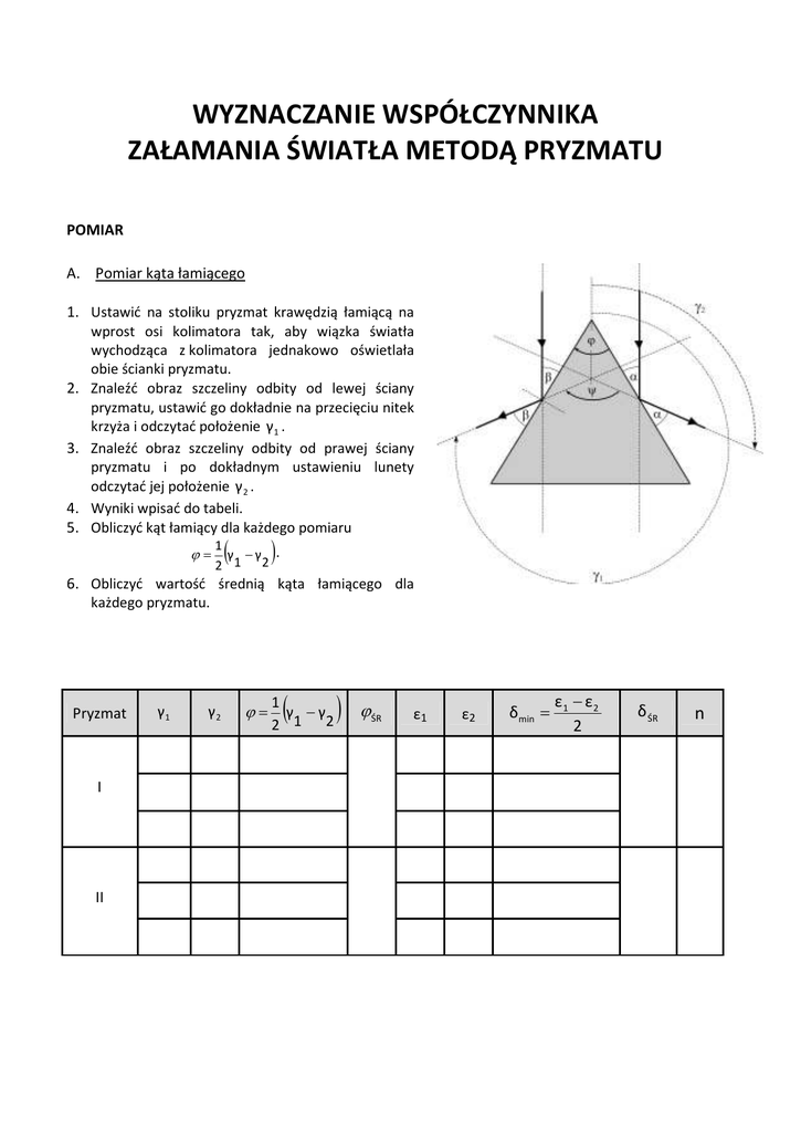wyznaczanie współczynnika załamania światła metodą pryzmatu