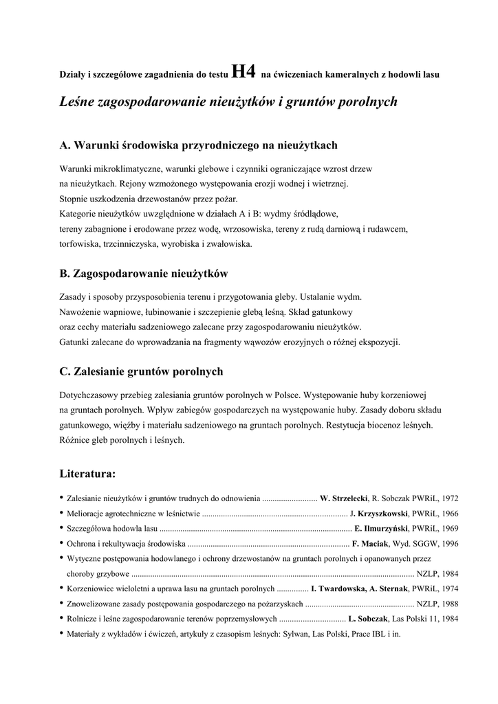 Działy i szczegółowe zagadnienia do testu H4 na ćwiczeniach kameralnych z hodowli lasu Leśne zagospodarowanie nieużytków i gruntów porolnych A. Warunki środowiska przyrodniczego na nieużytkach Warunki mikroklimatyczne, warunki glebowe i czynniki ograniczające wzrost drzew na nieużytkach. Rejony wzmożonego występowania erozji wodnej i wietrznej. Stopnie uszkodzenia drzewostanów przez pożar. Kategorie nieużytków uwzględnione w działach A i B: wydmy śródlądowe, tereny zabagnione i erodowane przez wodę, wrzosowiska, tereny z rudą darniową i rudawcem, torfowiska, trzcinniczyska, wyrobiska i zwałowiska. B. Zagospodarowanie nieużytków Zasady i sposoby przysposobienia terenu i przygotowania gleby. Ustalanie wydm. Nawożenie wapniowe, łubinowanie i szczepienie glebą leśną. Skład gatunkowy oraz cechy materiału sadzeniowego zalecane przy zagospodarowaniu nieużytków. Gatunki zalecane do wprowadzania na fragmenty wąwozów erozyjnych o różnej ekspozycji. C. Zalesianie gruntów porolnych Dotychczasowy przebieg zalesiania gruntów porolnych w Polsce. Występowanie huby korzeniowej na gruntach porolnych. Wpływ zabiegów gospodarczych na występowanie huby. Zasady doboru składu gatunkowego, więźby i materiału sadzeniowego na gruntach porolnych. Restytucja biocenoz leśnych. Różnice gleb porolnych i leśnych. Literatura: • Zalesianie nieużytków i gruntów trudnych do odnowienia .......................... W. Strzelecki, R. Sobczak PWRiL, 1972 • Melioracje agrotechniczne w leśnictwie ..................................................................... J. Krzyszkowski, PWRiL, 1966 • Szczegółowa hodowla lasu ............................................................................................ E. Ilmurzyński, PWRiL, 1969 • Ochrona i rekultywacja środowiska ............................................................................. F. Maciak, Wyd. SGGW, 1996 • Wytyczne postępowania hodowlanego i ochrony drzewostanów na gruntach porolnych i opanowanych przez choroby grzybowe ....................................................................................................................................... NZLP, 1984 • Korzeniowiec wieloletni a uprawa lasu na gruntach porolnych ............... I. Twardowska, A. Sternak, PWRiL, 1974 • Znowelizowane zasady postępowania gospodarczego na pożarzyskach .................................................... NZLP, 1988 • Rolnicze i leśne zagospodarowanie terenów poprzemysłowych ............................... L. Sobczak, Las Polski 11, 1984 • Materiały z wykładów i ćwiczeń, artykuły z czasopism leśnych: Sylwan, Las Polski, Prace IBL i in. Działy i szczegółowe zagadnienia do testu H5 na ćwiczeniach kameralnych z hodowli lasu Uprawa plantacyjna gatunków i odmian drzewiastych A. Projektowanie plantacji Cele gospodarki plantacyjnej. Gatunki drzew leśnych oraz odmiany topoli i wierzby stosowane w uprawie plantacyjnej. Uwarunkowania klimatyczne i glebowe przy wprowadzaniu różnych gatunków (odmian) na plantacje. Wybór gatunku, wieku rębności, więźby sadzenia i cech pokrojowych dla określonego celu produkcji. Przyrost miąższości (biomasy) i zapas drzew na plantacjach. B. Zakładanie plantacji Zasady wyboru gruntów pod nowe plantacje: kategoria użytkowania, żyzność gleb, poziom wody gruntowej. Sposoby przysposobienia terenu i przygotowania gleby. Wiek, forma i pochodzenie materiału sadzeniowego. Pora i technika sadzenia. Palikowanie, formowanie strzałek, ochrona przed zwierzyną, nawożenie zielone. C. Pielęgnowanie i użytkowanie plantacji Celowość, terminy, okresy i sposoby nawożenia, pielęgnowania gleby, indywidualnego pielęgnowania drzew oraz cięć rozluźniających. Uprawy uzupełniające. Przebudowa plantacji. Pora użytkowania. Literatura: Notatki z wykładów i ćwiczeń oraz literatura i materiały pomocnicze przedstawione na zajęciach, a także Szczegółowe zagadnienia do sprawdzianu H6 na ćwiczeniach kameralnych z hodowli lasu Planowanie czynności hodowlanych • Elementy opisujące obiekt planowania hodowlanego • Ustalanie celu hodowlanego (cele cząstkowe, cel finalny) • Odnowienie naturalne i sztuczne • Cięcia odnowieniowe • Pielęgnowanie upraw i młodników • Trzebieże wczesne i późne • Przebudowa drzewostanów (całkowita, częściowa) • Dolesienia • Wprowadzanie dolnych warstw Literatura: Notatki z wykładów i ćwiczeń, a ponadto pozycje zalecane do sprawdzianów T3, T4, H1 i H2