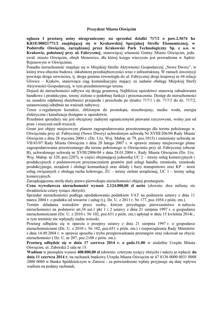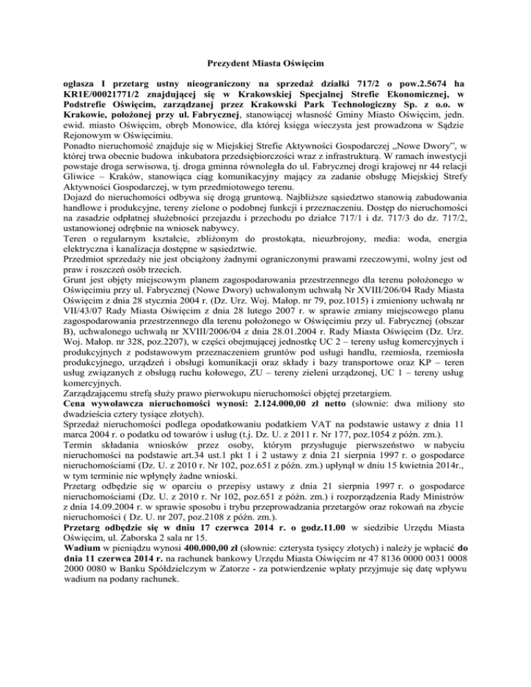 Prezydent Miasta Oświęcim ogłasza I przetarg ustny nieograniczony na sprzedaż działki 717/2 o pow.2.5674 ha KR1E/00021771/2 znajdującej się w Krakowskiej Specjalnej Strefie Ekonomicznej, w Podstrefie Oświęcim, zarządzanej przez Krakowski Park Technologiczny Sp. z o.o. w Krakowie, położonej przy ul. Fabrycznej, stanowiącej własność Gminy Miasto Oświęcim, jedn. ewid. miasto Oświęcim, obręb Monowice, dla której księga wieczysta jest prowadzona w Sądzie Rejonowym w Oświęcimiu. Ponadto nieruchomość znajduje się w Miejskiej Strefie Aktywności Gospodarczej „Nowe Dwory”, w której trwa obecnie budowa inkubatora przedsiębiorczości wraz z infrastrukturą. W ramach inwestycji powstaje droga serwisowa, tj. droga gminna równoległa do ul. Fabrycznej drogi krajowej nr 44 relacji Gliwice – Kraków, stanowiąca ciąg komunikacyjny mający za zadanie obsługę Miejskiej Strefy Aktywności Gospodarczej, w tym przedmiotowego terenu. Dojazd do nieruchomości odbywa się drogą gruntową. Najbliższe sąsiedztwo stanowią zabudowania handlowe i produkcyjne, tereny zielone o podobnej funkcji i przeznaczeniu. Dostęp do nieruchomości na zasadzie odpłatnej służebności przejazdu i przechodu po działce 717/1 i dz. 717/3 do dz. 717/2, ustanowionej odrębnie na wniosek nabywcy. Teren o regularnym kształcie, zbliżonym do prostokąta, nieuzbrojony, media: woda, energia elektryczna i kanalizacja dostępne w sąsiedztwie. Przedmiot sprzedaży nie jest obciążony żadnymi ograniczonymi prawami rzeczowymi, wolny jest od praw i roszczeń osób trzecich. Grunt jest objęty miejscowym planem zagospodarowania przestrzennego dla terenu położonego w Oświęcimiu przy ul. Fabrycznej (Nowe Dwory) uchwalonym uchwałą Nr XVIII/206/04 Rady Miasta Oświęcim z dnia 28 stycznia 2004 r. (Dz. Urz. Woj. Małop. nr 79, poz.1015) i zmieniony uchwałą nr VII/43/07 Rady Miasta Oświęcim z dnia 28 lutego 2007 r. w sprawie zmiany miejscowego planu zagospodarowania przestrzennego dla terenu położonego w Oświęcimiu przy ul. Fabrycznej (obszar B), uchwalonego uchwałą nr XVIII/2006/04 z dnia 28.01.2004 r. Rady Miasta Oświęcim (Dz. Urz. Woj. Małop. nr 328, poz.2207), w części obejmującej jednostkę UC 2 – tereny usług komercyjnych i produkcyjnych z podstawowym przeznaczeniem gruntów pod usługi handlu, rzemiosła, rzemiosła produkcyjnego, urządzeń i obsługi komunikacji oraz składy i bazy transportowe oraz KP – teren usług związanych z obsługą ruchu kołowego, ZU – tereny zieleni urządzonej, UC 1 – tereny usług komercyjnych. Zarządzającemu strefą służy prawo pierwokupu nieruchomości objętej przetargiem. Cena wywoławcza nieruchomości wynosi: 2.124.000,00 zł netto (słownie: dwa miliony sto dwadzieścia cztery tysiące złotych). Sprzedaż nieruchomości podlega opodatkowaniu podatkiem VAT na podstawie ustawy z dnia 11 marca 2004 r. o podatku od towarów i usług (t.j. Dz. U. z 2011 r. Nr 177, poz.1054 z późn. zm.). Termin składania wniosków przez osoby, którym przysługuje pierwszeństwo w nabyciu nieruchomości na podstawie art.34 ust.1 pkt 1 i 2 ustawy z dnia 21 sierpnia 1997 r. o gospodarce nieruchomościami (Dz. U. z 2010 r. Nr 102, poz.651 z późn. zm.) upłynął w dniu 15 kwietnia 2014r., w tym terminie nie wpłynęły żadne wnioski. Przetarg odbędzie się w oparciu o przepisy ustawy z dnia 21 sierpnia 1997 r. o gospodarce nieruchomościami (Dz. U. z 2010 r. Nr 102, poz.651 z późn. zm.) i rozporządzenia Rady Ministrów z dnia 14.09.2004 r. w sprawie sposobu i trybu przeprowadzania przetargów oraz rokowań na zbycie nieruchomości ( Dz. U. nr 207, poz.2108 z późn. zm.). Przetarg odbędzie się w dniu 17 czerwca 2014 r. o godz.11.00 w siedzibie Urzędu Miasta Oświęcim, ul. Zaborska 2 sala nr 15. Wadium w pieniądzu wynosi 400.000,00 zł (słownie: czterysta tysięcy złotych) i należy je wpłacić do dnia 11 czerwca 2014 r. na rachunek bankowy Urzędu Miasta Oświęcim nr 47 8136 0000 0031 0008 2000 0080 w Banku Spółdzielczym w Zatorze - za potwierdzenie wpłaty przyjmuje się datę wpływu wadium na podany rachunek. Postąpienie nie może wynosić mniej niż 1% ceny wywoławczej, z zaokrągleniem w górę do pełnych dziesiątek złotych. W przetargu może wziąć udział osoba, która wpłaci wadium w wyznaczonym terminie oraz przedłoży komisji przetargowej oświadczenie o zapoznaniu się ze stanem prawnym, technicznym i faktycznym nieruchomości oraz z warunkami przetargu i przyjęciu ich bez zastrzeżeń. Nieruchomość jest sprzedawana wg stanu wynikającego z ewidencji gruntów i ksiąg wieczystych. Cudzoziemców nabywających nieruchomości obowiązują przepisy ustawy z dnia 24 marca 1920r. o nabywaniu nieruchomości przez cudzoziemców (tj. Dz. U. z 2004r. nr 167, poz.1758 z późn. zm.). Cena sprzedaży podlega zapłacie nie później niż do dnia zawarcia umowy przenoszącej własność gruntu. Za dzień zapłaty przyjmuje się datę wpływu ww. należności na rachunek bankowy urzędu. Koszty umowy notarialnej ponosi nabywca wyłoniony w drodze przetargu. Jeżeli osoba ustalona jako nabywca nieruchomości nie przystąpi bez usprawiedliwienia do zawarcia umowy w miejscu i terminie podanym w zawiadomieniu, Prezydent Miasta Oświęcim może odstąpić od zawarcia umowy, a wpłacone wadium nie podlega zwrotowi. Prezydent Miasta Oświęcim zastrzega sobie prawo odwołania przetargu z ważnych powodów. Informacji w sprawie przetargu można zasięgnąć w Wydziale Mienia Komunalnego Referacie Gospodarki Nieruchomościami Urzędu Miasta Oświęcim, ul. Jagiełły 23 pok. nr 18, tel. 33 8429218.