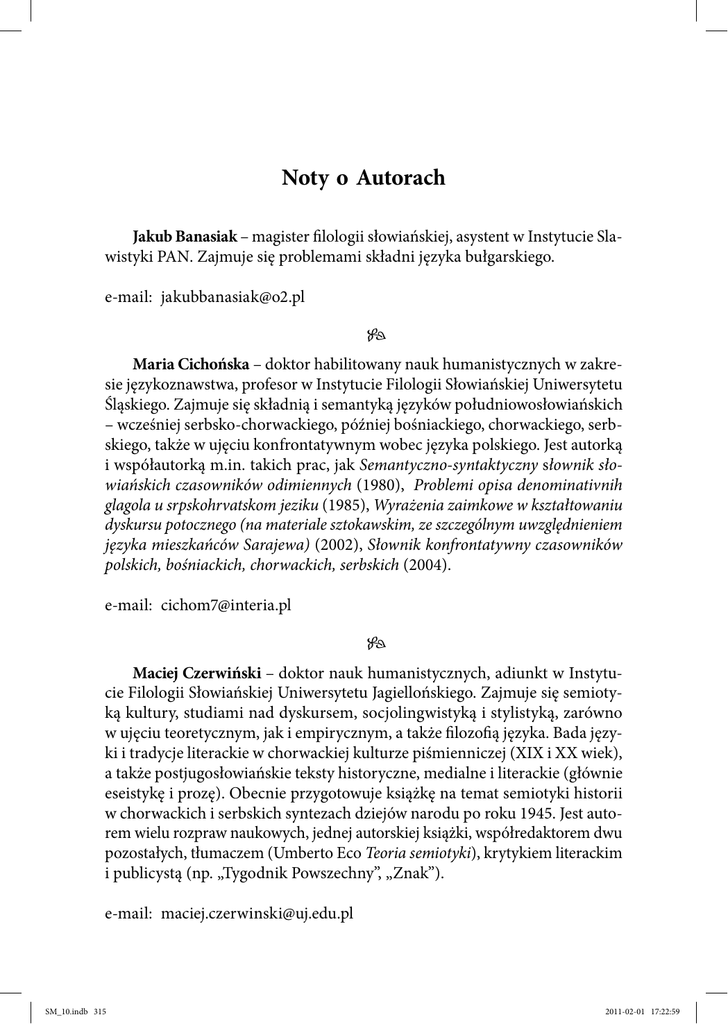 Noty o Autorach Jakub Banasiak – magister filologii słowiańskiej, asystent w Instytucie Sla‑ wistyki PAN. Zajmuje się problemami składni języka bułgarskiego. e-mail: [email protected] • Maria Cichońska – doktor habilitowany nauk humanistycznych w zakre‑ sie językoznawstwa, profesor w Instytucie Filologii Słowiańskiej Uniwersytetu Śląskiego. Zajmuje się składnią i semantyką języków południowosłowiańskich – wcześniej serbsko-chorwackiego, później bośniackiego, chorwackiego, serb‑ skiego, także w ujęciu konfrontatywnym wobec języka polskiego. Jest autorką i współautorką m.in. takich prac, jak Semantyczno-syntaktyczny słownik sło‑ wiańskich czasowników odimiennych (1980), Problemi opisa denominativnih glagola u srpskohrvatskom jeziku (1985), Wyrażenia zaimkowe w kształtowaniu dyskursu potocznego (na materiale sztokawskim, ze szczególnym uwzględnieniem języka mieszkańców Sarajewa) (2002), Słownik konfrontatywny czasowników polskich, bośniackich, chorwackich, serbskich (2004). e-mail: [email protected] • Maciej Czerwiński – doktor nauk humanistycznych, adiunkt w Instytu‑ cie Filologii Słowiańskiej Uniwersytetu Jagiellońskiego. Zajmuje się semioty‑ ką kultury, studiami nad dyskursem, socjolingwistyką i stylistyką, zarówno w ujęciu teoretycznym, jak i empirycznym, a także filozofią języka. Bada języ‑ ki i tradycje literackie w chorwackiej kulturze piśmienniczej (XIX i XX wiek), a także postjugosłowiańskie teksty historyczne, medialne i literackie (głównie eseistykę i prozę). Obecnie przygotowuje książkę na temat semiotyki historii w chorwackich i serbskich syntezach dziejów narodu po roku 1945. Jest auto‑ rem wielu rozpraw naukowych, jednej autorskiej książki, współredaktorem dwu pozostałych, tłumaczem (Umberto Eco Teoria semiotyki), krytykiem literackim i publicystą (np. „Tygodnik Powszechny”, „Znak”). e-mail: [email protected] SM_10.indb 315 2011‑02‑01 17:22:59 316 Noty o Autorach Karolina Dargiel – magister filologii bałkańskiej, studentka IV roku stu‑ dium doktoranckiego w zakresie językoznawstwa w Zakładzie Języków Sło‑ wiańskich i Bałkanistyki Instytutu Filologii Słowiańskiej Uniwersytetu Miko‑ łaja Kopernika w Toruniu. Interesuje się zarówno akustyczną stroną języka (badania eksperymentalne nad językiem) i jej praktycznymi zastosowaniami w kryminalistyce, jak również historycznym rozwojem języka albańskiego w różnych jego dialektach. e-mail: [email protected] • Natalia Długosz – doktor nauk humanistycznych, adiunkt w Zakładzie Ję‑ zyków Południowosłowiańskich Instytutu Filologii Słowiańskiej Uniwersytetu im. Adama Mickiewicza w Poznaniu. Jej zainteresowania badawcze wiążą się z bułgarsko-polskim słowotwórstwem porównawczym. e-mail: [email protected] • Jacek Duda – magister, doktorant w Instytucie Slawistyki Zachodniej i Po‑ łudniowej Uniwersytetu Warszawskiego. Zainteresowania badawcze: analiza ję‑ zyka mediów, zwłaszcza sportowych, teoria i praktyka przekładu na języki obce. e-mail: [email protected] • Marcin Grygiel – doktor nauk humanistycznych, adiunkt w Zakładzie Językoznawstwa Porównawczego Instytutu Filologii Rosyjskiej Uniwersytetu Rzeszowskiego. Jest autorem dwóch monografii: Main trends in historical se‑ mantics (z G. Kleparskim, 2007), From semantic change to conceptual blending. Semantic development of English historical near-synonyms of man – male human being (2008) i artykułów z zakresu językoznawstwa kognitywnego, semantyki historycznej i opisu gramatycznego języków słowiańskich w konfrontacji z an‑ gielskim. Obecnie prowadzi badania dotyczące semantyki afirmacji w językach słowiańskich i angielskim. e-mail: [email protected] SM_10.indb 316 2011‑02‑01 17:23:00 Noty o Autorach 317 • Milka Ivić – emerytowany profesor Uniwersytetu w Nowym Sadzie, czło‑ nek Serbskiej Akademii Nauk, członek zagraniczny norweskiej i saksońskiej akademii nauk. Autorka licznych prac z zakresu językoznawstwa ogólnego, syntaksy i semantyki języków słowiańskich, m.in.: Pravci u lingvistici (1963), Lingvistički ogledi (1983, 1995), O jeziku Vukovom i vukovskom (1990), O zele nom konju. Novi lingvistički ogledi (1995), Lingvisički ogledi tri (2000), Red reči. Lingvistički ogledi četiri (2002), O rečima. Lingvistički ogledi pet (2005), Jezik o nama. Lingvistički ogledi šest (2006). W 2008 r. pod redakcją P. Pipera i M. Radovanovicia ukazała się poświęcona jej książka Lingvistika Milke Ivić. • Artur Karasiński – magister, doktorant na ostatnim roku studiów dok‑ toranckich w zakresie językoznawstwa w Instytucie Filologii Słowiańskiej Uniwersytetu Mikołaja Kopernika w Toruniu. Zajmuje się problemami słowo‑ twórstwa albańskiego. Prowadzi badania dotyczące derywatów przymiotniko‑ wych w języku albańskim. Przygotowuje rozprawę doktorską Słowotwórstwo przymiotników albańskich. e-mail: [email protected] • Małgorzata Korytkowska – profesor zwyczajny doktor habilitowany, kie‑ rownik Katedry Slawistyki Południowej Uniwersytetu Łódzkiego. Zajmuje się problemami składni predykatowo-argumentowej oraz badaniami konfron‑ tatywnymi języka bułgarskiego i polskiego. Autorka m.in. książek: Z proble‑ matyki składni konfrontatywnej – na przykładzie bułgarskich i polskich zdań bezpodmiotowych (1990), Typy pozycji predykatowo-argumentowych (1992), Modalność imperceptywna (z R. Roszko, GKBP t. 6, cz. 2, 1997), Od zdania złożonego do zdania pojedynczego. Dopuszczalność nominalizacji argumentu propozycjonalnego w języku polskim i bułgarskim (z V. Maldijevą, 2002), Mo‑ dalność interrogatywna (GKBP t. 6, cz. 4, 2004), Polsko-bułgarska gramatyka konfrontatywna (z V. Koseską, R. Roszko, 2007). e-mail: [email protected] • SM_10.indb 317 2011‑02‑01 17:23:00 318 Noty o Autorach Violetta Koseska-Toszewa – profesor 