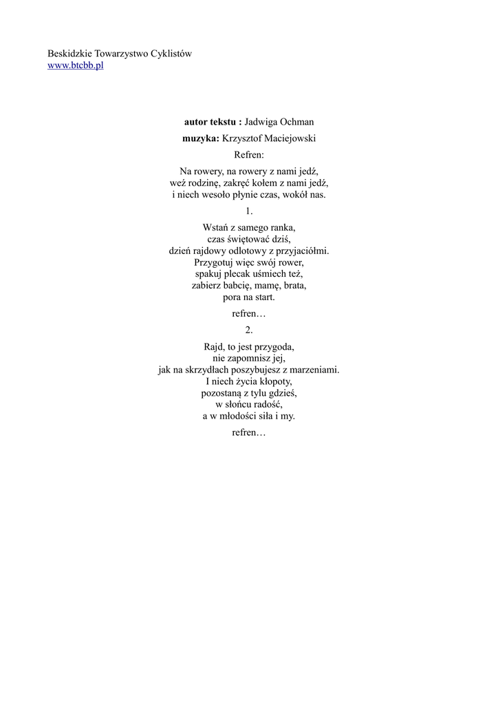 Beskidzkie Towarzystwo Cyklistów www.btcbb.pl autor tekstu : Jadwiga Ochman muzyka: Krzysztof Maciejowski Refren: Na rowery, na rowery z nami jedź, weź rodzinę, zakręć kołem z nami jedź, i niech wesoło płynie czas, wokół nas. 1. Wstań z samego ranka, czas świętować dziś, dzień rajdowy odlotowy z przyjaciółmi. Przygotuj więc swój rower, spakuj plecak uśmiech też, zabierz babcię, mamę, brata, pora na start. refren… 2. Rajd, to jest przygoda, nie zapomnisz jej, jak na skrzydłach poszybujesz z marzeniami. I niech życia kłopoty, pozostaną z tylu gdzieś, w słońcu radość, a w młodości siła i my. refren…