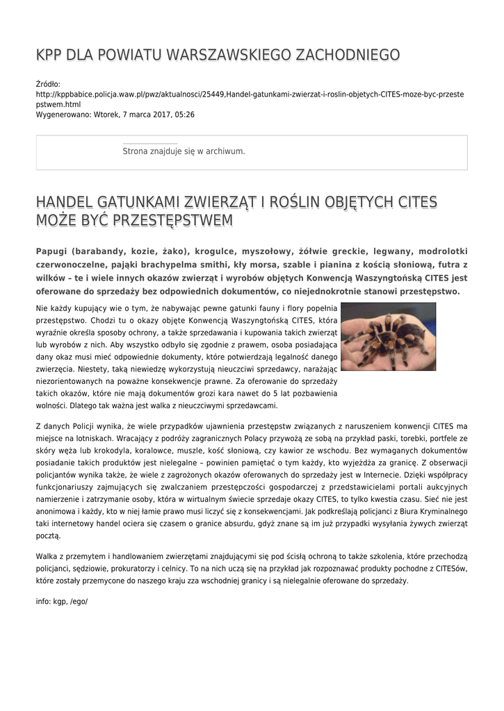 KPP DLA POWIATU WARSZAWSKIEGO ZACHODNIEGO Źródło: http://kppbabice.policja.waw.pl/pwz/aktualnosci/25449,Handel-gatunkami-zwierzat-i-roslin-objetych-CITES-moze-byc-przeste pstwem.html Wygenerowano: Wtorek, 7 marca 2017, 05:26 Strona znajduje się w archiwum. HANDEL GATUNKAMI ZWIERZĄT I ROŚLIN OBJĘTYCH CITES MOŻE BYĆ PRZESTĘPSTWEM Papugi (barabandy, kozie, żako), krogulce, myszołowy, żółwie greckie, legwany, modrolotki czerwonoczelne, pająki brachypelma smithi, kły morsa, szable i pianina z kością słoniową, futra z wilków – te i wiele innych okazów zwierząt i wyrobów objętych Konwencją Waszyngtońską CITES jest oferowane do sprzedaży bez odpowiednich dokumentów, co niejednokrotnie stanowi przestępstwo. Nie każdy kupujący wie o tym, że nabywając pewne gatunki fauny i flory popełnia przestępstwo. Chodzi tu o okazy objęte Konwencją Waszyngtońską CITES, która wyraźnie określa sposoby ochrony, a także sprzedawania i kupowania takich zwierząt lub wyrobów z nich. Aby wszystko odbyło się zgodnie z prawem, osoba posiadająca dany okaz musi mieć odpowiednie dokumenty, które potwierdzają legalność danego zwierzęcia. Niestety, taką niewiedzę wykorzystują nieuczciwi sprzedawcy, narażając niezorientowanych na poważne konsekwencje prawne. Za oferowanie do sprzedaży takich okazów, które nie mają dokumentów grozi kara nawet do 5 lat pozbawienia wolności. Dlatego tak ważna jest walka z nieuczciwymi sprzedawcami. Z danych Policji wynika, że wiele przypadków ujawnienia przestępstw związanych z naruszeniem konwencji CITES ma miejsce na lotniskach. Wracający z podróży zagranicznych Polacy przywożą ze sobą na przykład paski, torebki, portfele ze skóry węża lub krokodyla, koralowce, muszle, kość słoniową, czy kawior ze wschodu. Bez wymaganych dokumentów posiadanie takich produktów jest nielegalne – powinien pamiętać o tym każdy, kto wyjeżdża za granicę. Z obserwacji policjantów wynika także, że wiele z zagrożonych okazów oferowanych do sprzedaży jest w Internecie. Dzięki współpracy funkcjonariuszy zajmujących się zwalczaniem przestępczości gospodarczej z przedstawicielami portali aukcyjnych namierzenie i zatrzymanie osoby, która w wirtualnym świecie sprzedaje okazy CITES, to tylko kwestia czasu. Sieć nie jest anonimowa i każdy, kto w niej łamie prawo musi liczyć się z konsekwencjami. Jak podkreślają policjanci z Biura Kryminalnego taki internetowy handel ociera się czasem o granice absurdu, gdyż znane są im już przypadki wysyłania żywych zwierząt pocztą. Walka z przemytem i handlowaniem zwierzętami znajdującymi się pod ścisłą ochroną to także szkolenia, które przechodzą policjanci, sędziowie, prokuratorzy i celnicy. To na nich uczą się na przykład jak rozpoznawać produkty pochodne z CITESów, które zostały przemycone do naszego kraju zza wschodniej granicy i są nielegalnie oferowane do sprzedaży. info: kgp, /ego/ Ocena: 0/5 (0) Tweetnij