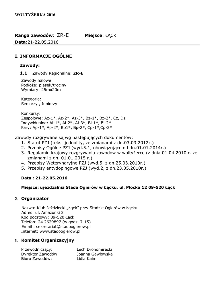 WOLTYŻERKA 2016 Ranga zawodów: ZR-E Miejsce: ŁĄCK Data:21-22.05.2016 I. INFORMACJE OGÓLNE Zawody: 1.1 Zawody Regionalne: ZR-E Zawody halowe: Podłoże: piasek/trociny Wymiary: 25mx20m Kategoria: Seniorzy , Juniorzy Konkursy: Zespołowe: Az-1*, Az-2*, Az-3*, Bz-1*, Bz-2*, Cz, Dz Indywidualne: Ai-1*, Ai-2*, Ai-3*, Bi-1*, Bi-2* Pary: Ap-1*, Ap-2*, Bp1*, Bp-2*, Cp-1*,Cp-2* Zawody rozgrywane są wg następujących dokumentów: 1. Statut PZJ (tekst jednolity, ze zmianami z dn.03.03.2012r.) 2. Przepisy Ogólne PZJ (wyd.5.1, obowiązujące od dn.01.01.2014r.) 3. Regulamin krajowy rozgrywania zawodów w woltyżerce (z dnia 01.04.2010 r. ze zmianami z dn. 01.01.2015 r.) 4. Przepisy Weterynaryjne PZJ (wyd.5, z dn.25.03.2010r.) 5. Przepisy antydopingowe PZJ (wyd.2, z dn.23.05.2010r.) Data : 21-22.05.2016 Miejsce: ujeżdżalnia Stada Ogierów w Łącku, ul. Płocka 12 09-520 Łąck Organizator Nazwa: Klub Jeździecki „Łąck” przy Stadzie Ogierów w Łącku Adres: ul. Amazonki 3 Kod pocztowy: 09-520 Łąck Telefon: 24 2629897 (w godz. 7-15) Email : [email protected] Internet: www.stadoogierow.pl Komitet Organizacyjny Przewodniczący: Dyrektor Zawodów: Biuro Zawodów: Lech Drohomirecki Joanna Gawłowska Lidia Kaim WOLTYŻERKA 2016 II. OSOBY OFICJALNE 1. Komisja Sędziowska: Przewodniczący: Elżbieta Dolińska Sędzia PZJ: Elżbieta Dolińska Członkowie: Karolina Salamon Sekretarze: Komisarze: Lek.wet.: Lek.med.: Zuzanna Heidrych, Diana Stefanowska (?) Joanna Gawłowska Maciej Florysiak TP-Trans III. WARUNKI TECHNICZNE Otwarcie stajni data 20.05.2016 Zebranie techniczne (sprawdzanie dokumentów) 20.05.2016 Początek konkursów 21.05.2016 godzina Plac konkursowy/hala: podłoże: piasek/trociny wymiary:25mx 20m Rozprężalnia: podłoże: piasek/trociny wymiary:2x 25mx 20m IV. WARUNKI UCZESTNICTWA 1.Uczestnictwo Zgodnie z Art. 18 p. 1-5 i Art. 29 p.1-2 Przepisów Ogólnych PZJ oraz Rozdział III Regulaminu krajowego rozgrywania zawodów w woltyżerce: 2. Zgłoszenia: Termin zgłoszeń ostatecznych: 18.05.2016 Zgłoszenia prosimy wysyłać na adres: [email protected] Zgłoszenia muszą zawierać: imię nazwisko zawodnika, zawodnika- lonżującego rok urodzenia, numer licencji PZJ/WZJ, imię konia i numer paszportu, numer konkursu i kategorię 3. Warunki finansowe: Boksy o wymiarach:3,5m x 3,5m - opłata za boks: 100 zł (pt-niedz.), 70 zł (jeden dzień) Wpisowe: 80 zł (od zawodnika) Startowe: 20 zł (za jeden konkurs) WOLTYŻERKA 2016 4. Zakwaterowanie i wyżywienie: Na koszt własny. Proponowane hotele: nocleg w Stadzie Ogierów w Łącku (40 zł-55 zł/os./db) Wyżywienie: Możliwość wykupienia wyżywienia śniadanie 15 zł, obiad 30 zł, kolacja 15 zł 5. Wymagana dokumentacja dla koni aktualne badania i szczepienia ochronne 6. Organizator nie ponosi odpowiedzialności za kradzieże, wypadki oraz inne szkody mogące mieć miejsce podczas zawodów i transportu V. KONKURSY ZAWODÓW OGÓLNOPOLSKICH Konkurs nr .1 Konkurs zespołowy Az-1* Program będzie wykonywany w jednej rundzie: -program obowiązkowy TEST 1 (galop w lewo), -program dowolny (galop w lewo) Konkurs nr. 2 Konkurs zespołowy Az-2* Program będzie wykonywany w jednej rundzie: -program obowiązkowy TEST 2 (galop w lewo), -program dowolny (galop w lewo) Konkurs nr. 3 Konkurs zespołowy Az-3* Program będzie wykonywany w jednej rundzie: -program obowiązkowy TEST 3 (galop w lewo), -program dowolny (galop w lewo) Konkurs nr. 4 Konkurs zespołowy Bz-1* Program będzie wykonywany w jednej rundzie: -program obowiązkowy TEST 1 (galop w lewo), -program dowolny (galop w lewo) Konkurs nr. 5 Konkurs zespołowy Bz-2* Program będzie wykonywany w jednej rundzie: -program obowiązkowy TEST 2 (galop w lewo), -program dowolny (galop w lewo) Konkurs nr. 6 Konkurs zespołowy Cz Program będzie wykonywany w jednej rundzie: -program obowiązkowy TEST C (galop w lewo), program dowolny TEST 1 (stęp w lewo ). Program dowolny wykonywany jest bezpośrednio po programie obowiązkowym. Obowiązuje dostosowanie długości wypinaczy do stępa. Program będzie wykonywany w jednej rundzie: -program obowiązkowy TEST C (stęp w lewo), -program dowolny TEST 1(stęp w lewo). Program dowolny wykonywany jest bezpośrednio po programie obowiązkowym. Program będzie wykonywany w jednej rundzie: -program obowiązkowy TEST 1 (galop w lewo), -program dowolny (galop w lewo) Konkurs nr. 7 Konkurs zespołowy Dz Konkurs nr. 8 Konkurs indywidualny (Ai-1*) WOLTYŻERKA 2016 Konkurs nr. 9 Konkurs indywidualny (Ai-2*) Program będzie wykonywany w jednej rundzie: -program obowiązkowy TEST 2 (galop w lewo), -program dowolny (galop w lewo) Konkurs nr. 10 Konkurs indywidualny (Ai-3*) Program będzie wykonywany w dwóch rundach. Runda I: -program obowiązkowy TEST 3 (galop w lewo), -program dowolny (galop w lewo) Runda II: program techniczny (galop w lewo) Program będzie wykonywany w jednej rundzie: -program obowiązkowy TEST 1 (galop w lewo), -program dowolny (galop w lewo) Konkurs nr. 11: Konkurs indywidualny (Bi-1*) Klasyfikacja zawodników i zawodniczek w konkursie nr 11 łączna. Konkurs nr. 12 Konkurs indywidualny (Bi-2*) Program będzie wykonywany w jednej rundzie: -program obowiązkowy TEST 2 (galop w lewo), -program dowolny (galop w lewo) Konkurs nr. 13 Konkurs par (Ap-1*) Program będzie wykonywany w jednej rundzie: -program obowiązkowy TEST 1 (galop w lewo), -program dowolny (galop w lewo) Konkurs nr. 14 Konkurs par (Ap-2*) Program będzie wykonywany w dwóch rundach I. program dowolny (galop w lewo), II. program dowolny (galop w lewo) -opcjonalnie Konkurs nr. 15 Konkurs par (Bp-1*) Program będzie wykonywany w jednej rundzie: -program obowiązkowy TEST 1 (galop w lewo), -program dowolny (galop w lewo) Konkurs nr. 16 Konkurs par (Bp-2*) Program będzie wykonywany w dwóch rundach I. program dowolny (galop w lewo), II. program dowolny (galop w lewo) -opcjonalnie Konkurs nr. 17 Konkurs par (Cp-1*) Program będzie wykonywany w jednej rundzie: -program obowiązkowy TEST