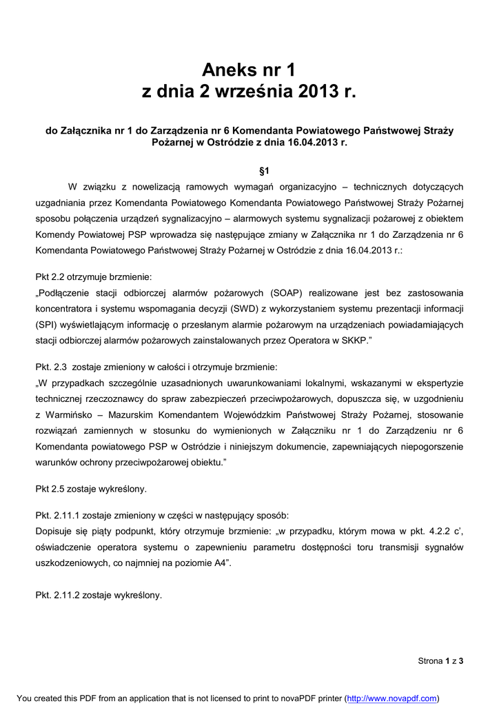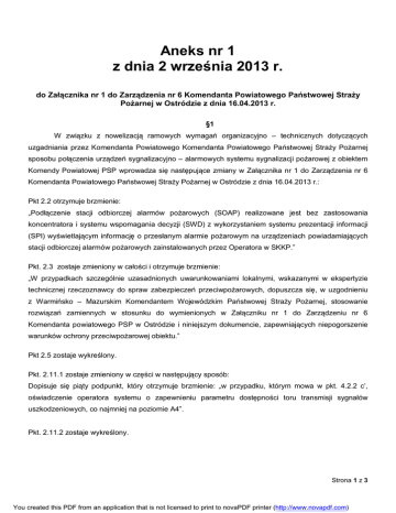 Aneks nr 1 z dnia 2 września 2013 r. do Załącznika nr 1 do Zarządzenia nr 6 Komendanta Powiatowego Państwowej Straży Pożarnej w Ostródzie z dnia 16.04.2013 r. §1 W związku z nowelizacją ramowych wymagań organizacyjno – technicznych dotyczących uzgadniania przez Komendanta Powiatowego Komendanta Powiatowego Państwowej Straży Pożarnej sposobu połączenia urządzeń sygnalizacyjno – alarmowych systemu sygnalizacji pożarowej z obiektem Komendy Powiatowej PSP wprowadza się następujące zmiany w Załącznika nr 1 do Zarządzenia nr 6 Komendanta Powiatowego Państwowej Straży Pożarnej w Ostródzie z dnia 16.04.2013 r.: Pkt 2.2 otrzymuje brzmienie: „Podłączenie stacji odbiorczej alarmów pożarowych (SOAP) realizowane jest bez zastosowania koncentratora i systemu wspomagania decyzji (SWD) z wykorzystaniem systemu prezentacji informacji (SPI) wyświetlającym informację o przesłanym alarmie pożarowym na urządzeniach powiadamiających stacji odbiorczej alarmów pożarowych zainstalowanych przez Operatora w SKKP.” Pkt. 2.3 zostaje zmieniony w całości i otrzymuje brzmienie: „W przypadkach szczególnie uzasadnionych uwarunkowaniami lokalnymi, wskazanymi w ekspertyzie technicznej rzeczoznawcy do spraw zabezpieczeń przeciwpożarowych, dopuszcza się, w uzgodnieniu z Warmińsko – Mazurskim Komendantem Wojewódzkim Państwowej Straży Pożarnej, stosowanie rozwiązań zamiennych w stosunku do wymienionych w Załączniku nr 1 do Zarządzeniu nr 6 Komendanta powiatowego PSP w Ostródzie i niniejszym dokumencie, zapewniających niepogorszenie warunków ochrony przeciwpożarowej obiektu.” Pkt 2.5 zostaje wykreślony. Pkt. 2.11.1 zostaje zmieniony w części w następujący sposób: Dopisuje się piąty podpunkt, który otrzymuje brzmienie: „w przypadku, którym mowa w pkt. 4.2.2 c’, oświadczenie operatora systemu o zapewnieniu parametru dostępności toru transmisji sygnałów uszkodzeniowych, co najmniej na poziomie A4”. Pkt. 2.11.2 zostaje wykreślony. Strona 1 z 3 You created this PDF from an application that is not licensed to print to novaPDF printer (http://www.novapdf.com) Pkt 2.13 zostaje zmieniony w tabeli w następujący sposób: Tabela nr 2 Lp. Skrócona nazwa obiektu (wyświetlana przez SOAP) Pełna nazwa obiektu Telefony kontaktowe do osób odpowiedzialnych w obiekcie za monitoring Uwagi (np. odłączony na czas remontu do dnia XX.XX.XXXX r., w okresie wypowiedzenia umowy do dnia XX.XX.XXXX r.) Do pkt 2.16 dopisuje się co następuje: „Polisa odpowiedzialności cywilnej powinna być zgodna z zakresem prowadzonej działalności gospodarczej , powinna przy tym obejmować roszczenia, które mogą powstać w wyniku przerwania pracy systemu monitoringu. Przy czym zakres polisy, określony w dokumencie potwierdzającym jej zawarcie, może być szerszy.” Pkt 2.17.4 zmienia się w części w następujący sposób : „Złożeniem kopii umowy pomiędzy abonentem będącym właścicielem, zarządcą lub użytkownikiem przyłączanego obiektu budowlanego, a operatorem o świadczenie usługi transmisji alarmów pożarowych, w zakresie wskazanym w pkt. 2.17.3, a także informacji o stosowanych torach transmisji alarmu pożarowego, ...” Pkt 2.17.6 otrzymuje brzmienie: Złożeniem wypełnionej „Karty informacji o obiekcie” zgodnej ze wzorem określonym przez Komendanta Powiatowego PSP w Ostródzie. Pkt 4.2.2 podpunkt c otrzymuje brzmienie: „W celu zapewnienia odpowiedniej niezawodności transmisji alarmów pożarowych do przesyłania alarmów pożarowych pomiędzy urządzeniami transmisji alarmów pożarowych a stacją odbiorczą alarmów pożarowych muszą być wykorzystywane, co najmniej dwa łącza transmisji określone, jako łącze podstawowe i łącze dodatkowe, zapewniające ogólną dostępność systemu określoną w tabeli 3; jako łącze podstawowe należy stosować łącze typu 1 wg tabeli 3 (specjalizowane tory transmisji); jako łącze dodatkowe może być stosowane łącze typu 1 lub typu 2 wg tabeli 3 (systemy łączności cyfrowej wykorzystujące publiczną sieć komutowaną); należy stosować dwa, fizycznie różne tory transmisji; transmisja w łączach podstawowym i dodatkowym musi być inicjowana równocześnie i odbywać się niezależnie,” Ponadto dopisuje się podpunkty: c’ – do przesyłania sygnałów uszkodzeniowych pomiędzy urządzeniami transmisji alarmów pożarowych a stacją odbiorczą sygnałów uszkodzenowych musi być wykorzystywany co najmniej jeden tor transmisji spełniający wymagania określone dla torów transmisji alarmów pożarowych, przy zapewnieniu parametru dostępności systemu co najmniej na poziomie A4. Strona 2 z 3 You created this PDF from an application that is not licensed to print to novaPDF printer (http://www.novapdf.com) c” – jeżeli dla toru transmisji sygnałów uszkodzeniowych nie została osiągnięta dostępność na poziomie A4 (patrz PN-EN 54-21:2009, Tablica A1), wymaganie dotyczące redundancji/podwojenia łączy transmisyjnych musi być stosowane, Poza tym definicja dostępności systemu transmisji alarmów zawarta w pkt 4.2.2 podpunkt h otrzymuje brzmienie: Dostępność systemu transmisji alarmów – określona jako procent czasu, w którym system transmitujący stanu alarmu jest – dla transmisji stanów alarmu – rozpoznawany jako dostępny z każdego systemu alarmowego połączonego z z wyznaczonym alarmowym centrum(ami) odbiorczym(i), bez zaburzeń i w wymaganym czasie transmisji, przy czym systemy alarmowe różnych rodzajów mogą oprócz komunikatu alarmowego wywyłać inne typy komunikatów, tj. komunikaty o uszkodzeniu i komunikaty statusowe; komunikaty te są rozpoznawane również jako element transmisji alarmu; Z pkt 4.2.3 podpunkt a zostaje wykreślone następujące zdanie „ W skład systemu prezentacji informacji wchodzi: system wspomagania decyzji SWD. §2 Aneks wchodzi w życie z dniem 02.09.2013 r. Strona 3 z 3 You created this PDF from an applic