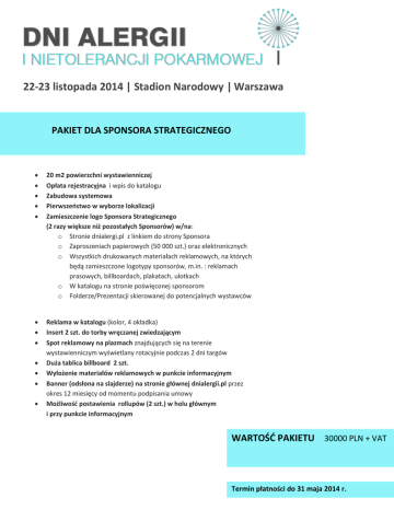 22-23 listopada 2014 | Stadion Narodowy | Warszawa PAKIET DLA SPONSORA STRATEGICZNEGO 20 m2 powierzchni wystawienniczej Opłata rejestracyjna i wpis do katalogu Zabudowa systemowa Pierwszeństwo w wyborze lokalizacji Zamieszczenie logo Sponsora Strategicznego (2 razy większe niż pozostałych Sponsorów) w/na: o Stronie dnialergi.pl z linkiem do strony Sponsora o Zaproszeniach papierowych (50 000 szt.) oraz elektronicznych o Wszystkich drukowanych materiałach reklamowych, na których będą zamieszczone logotypy sponsorów, m.in. : reklamach prasowych, billboardach, plakatach, ulotkach o W katalogu na stronie poświęconej sponsorom o Folderze/Prezentacji skierowanej do potencjalnych wystawców Reklama w katalogu (kolor, 4 okładka) Insert 2 szt. do torby wręczanej zwiedzającym Spot reklamowy na plazmach znajdujących się na terenie wystawienniczym wyświetlany rotacyjnie podczas 2 dni targów Duża tablica billboard 2 szt. Wyłożenie materiałów reklamowych w punkcie informacyjnym Banner (odsłona na slajderze) na stronie głównej dnialergii.pl przez okres 12 miesięcy od momentu podpisania umowy Możliwość postawienia rollupów (2 szt.) w holu głównym i przy punkcie informacyjnym WARTOŚĆ PAKIETU 30000 PLN + VAT Termin płatności do 31 maja 2014 r. PAKIET DLA SPONSORA 22-23 listopada 2014 | Stadion Narodowy | Warszawa PAKIET DLA SPONSORA 10 m2 powierzchni wystawienniczej Opłata rejestracyjna i wpis do katalogu Zabudowa systemowa Pierwszeństwo w wyborze lokalizacji Zamieszczenie logo Sponsora w/na: o Stronie dnialergi.pl z linkiem do strony Sponsora o Zaproszeniach papierowych (50 000 szt.) oraz elektronicznych o Wszystkich drukowanych materiałach reklamowych, na których będą zamieszczone logotypy sponsorów, m.in. : reklamach prasowych, billboardach, plakatach, ulotkach o W katalogu na stronie poświęconej sponsorom o Folderze/Prezentacji skierowanej do potencjalnych wystawców Reklama w katalogu (kolor, prawa strona) Insert 2 szt. do torby wręczanej zwiedzającym Spot reklamowy na plazmach znajdujących się na terenie wystawienniczym wyświetlany rotacyjnie podczas 2 dni targów Wyłożenie materiałów reklamowych w punkcie informacyjnym Banner na stronie głównej (odsłona na slajd erze)dnialergii.pl przez okres 6 miesięcy od momentu podpisania umowy WARTOŚĆ PAKIETU 15000 PLN + VAT Termin płatności do 31 maja 2014 r. PAKIET DLA SPONSORA