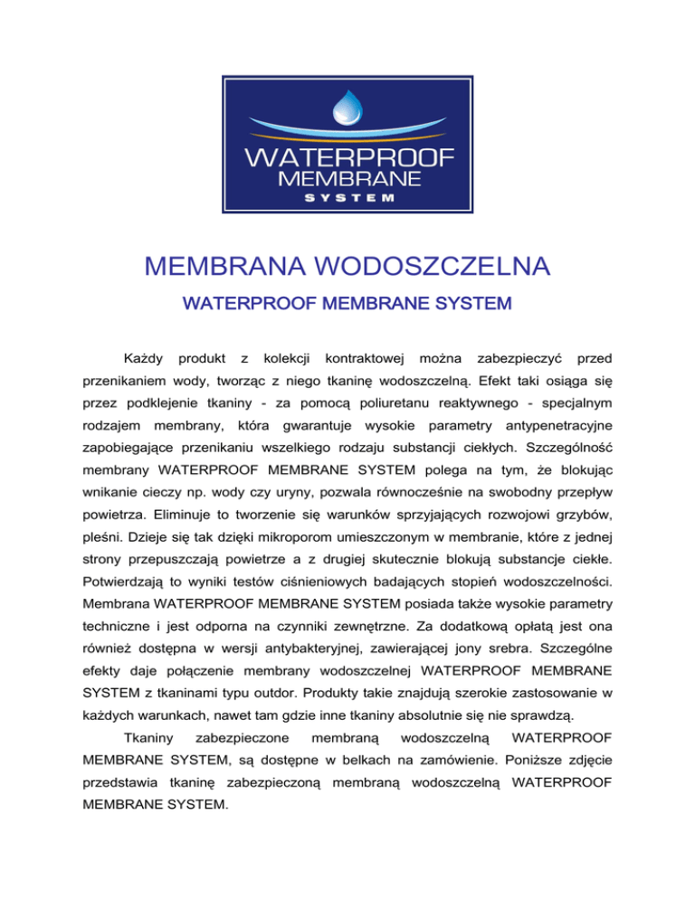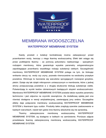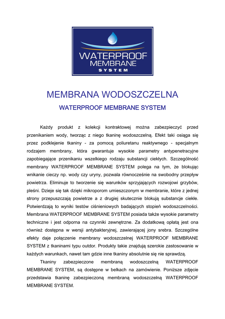 MEMBRANA WODOSZCZELNA WATERPROOF MEMBRANE SYSTEM Każdy produkt z kolekcji kontraktowej można zabezpieczyć przed przenikaniem wody, tworząc z niego tkaninę wodoszczelną. Efekt taki osiąga się przez podklejenie tkaniny - za pomocą poliuretanu reaktywnego - specjalnym rodzajem membrany, która gwarantuje wysokie parametry antypenetracyjne zapobiegające przenikaniu wszelkiego rodzaju substancji ciekłych. Szczególność membrany WATERPROOF MEMBRANE SYSTEM polega na tym, że blokując wnikanie cieczy np. wody czy uryny, pozwala równocześnie na swobodny przepływ powietrza. Eliminuje to tworzenie się warunków sprzyjających rozwojowi grzybów, pleśni. Dzieje się tak dzięki mikroporom umieszczonym w membranie, które z jednej strony przepuszczają powietrze a z drugiej skutecznie blokują substancje ciekłe. Potwierdzają to wyniki testów ciśnieniowych badających stopień wodoszczelności. Membrana WATERPROOF MEMBRANE SYSTEM posiada także wysokie parametry techniczne i jest odporna na czynniki zewnętrzne. Za dodatkową opłatą jest ona również dostępna w wersji antybakteryjnej, zawierającej jony srebra. Szczególne efekty daje połączenie membrany wodoszczelnej WATERPROOF MEMBRANE SYSTEM z tkaninami typu outdor. Produkty takie znajdują szerokie zastosowanie w każdych warunkach, nawet tam gdzie inne tkaniny absolutnie się nie sprawdzą. Tkaniny zabezpieczone membraną wodoszczelną WATERPROOF MEMBRANE SYSTEM, są dostępne w belkach na zamówienie. Poniższe zdjęcie przedstawia tkaninę zabezpieczoną membraną wodoszczelną WATERPROOF MEMBRANE SYSTEM.