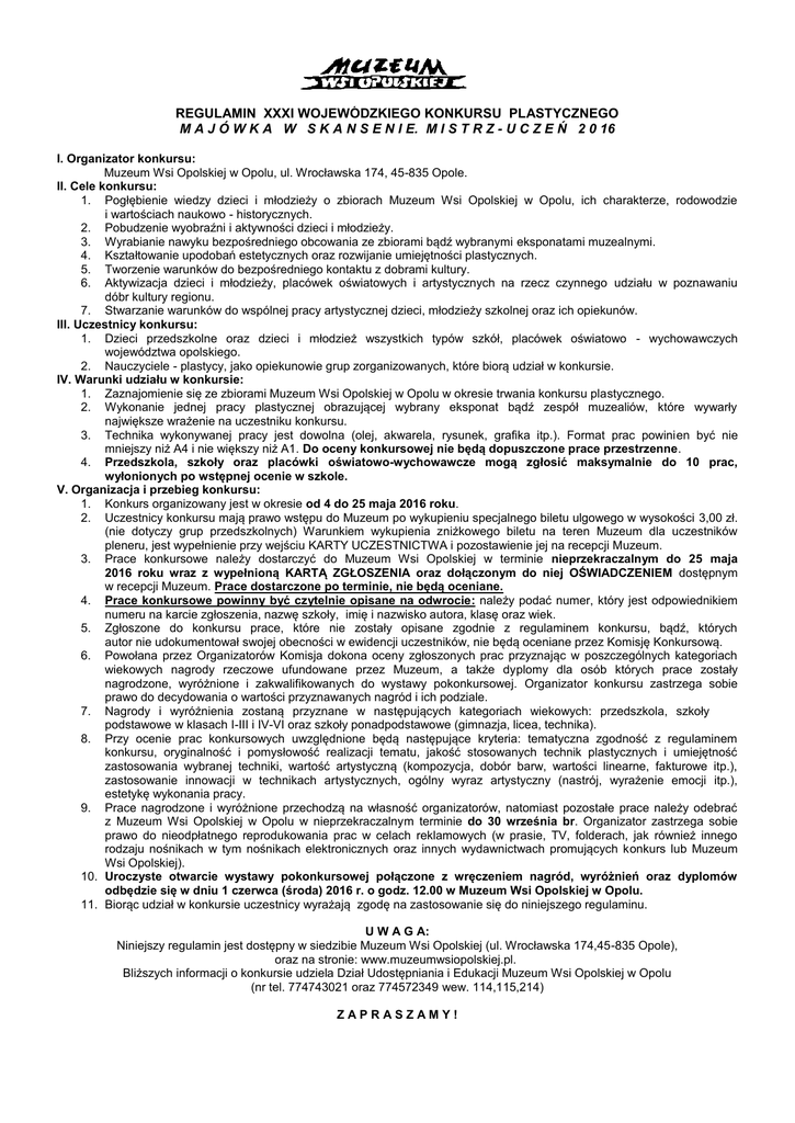 REGULAMIN XXXI WOJEWÓDZKIEGO KONKURSU PLASTYCZNEGO M A J Ó W K A W S K A N S E N I E. M I S T R Z - U C Z E Ń 2 0 16 I. Organizator konkursu: Muzeum Wsi Opolskiej w Opolu, ul. Wrocławska 174, 45-835 Opole. II. Cele konkursu: 1. Pogłębienie wiedzy dzieci i młodzieży o zbiorach Muzeum Wsi Opolskiej w Opolu, ich charakterze, rodowodzie i wartościach naukowo - historycznych. 2. Pobudzenie wyobraźni i aktywności dzieci i młodzieży. 3. Wyrabianie nawyku bezpośredniego obcowania ze zbiorami bądź wybranymi eksponatami muzealnymi. 4. Kształtowanie upodobań estetycznych oraz rozwijanie umiejętności plastycznych. 5. Tworzenie warunków do bezpośredniego kontaktu z dobrami kultury. 6. Aktywizacja dzieci i młodzieży, placówek oświatowych i artystycznych na rzecz czynnego udziału w poznawaniu dóbr kultury regionu. 7. Stwarzanie warunków do wspólnej pracy artystycznej dzieci, młodzieży szkolnej oraz ich opiekunów. III. Uczestnicy konkursu: 1. Dzieci przedszkolne oraz dzieci i młodzież wszystkich typów szkół, placówek oświatowo - wychowawczych województwa opolskiego. 2. Nauczyciele - plastycy, jako opiekunowie grup zorganizowanych, które biorą udział w konkursie. IV. Warunki udziału w konkursie: 1. Zaznajomienie się ze zbiorami Muzeum Wsi Opolskiej w Opolu w okresie trwania konkursu plastycznego. 2. Wykonanie jednej pracy plastycznej obrazującej wybrany eksponat bądź zespół muzealiów, które wywarły największe wrażenie na uczestniku konkursu. 3. Technika wykonywanej pracy jest dowolna (olej, akwarela, rysunek, grafika itp.). Format prac powinien być nie mniejszy niż A4 i nie większy niż A1. Do oceny konkursowej nie będą dopuszczone prace przestrzenne. 4. Przedszkola, szkoły oraz placówki oświatowo-wychowawcze mogą zgłosić maksymalnie do 10 prac, wyłonionych po wstępnej ocenie w szkole. V. Organizacja i przebieg konkursu: 1. Konkurs organizowany jest w okresie od 4 do 25 maja 2016 roku. 2. Uczestnicy konkursu mają prawo wstępu do Muzeum po wykupieniu specjalnego biletu ulgowego w wysokości 3,00 zł. (nie dotyczy grup przedszkolnych) Warunkiem wykupienia zniżkowego biletu na teren Muzeum dla uczestników pleneru, jest wypełnienie przy wejściu KARTY UCZESTNICTWA i pozostawienie jej na recepcji Muzeum. 3. Prace konkursowe należy dostarczyć do Muzeum Wsi Opolskiej w terminie nieprzekraczalnym do 25 maja 2016 roku wraz z wypełnioną KARTĄ ZGŁOSZENIA oraz dołączonym do niej OŚWIADCZENIEM dostępnym w recepcji Muzeum. Prace dostarczone po terminie, nie będą oceniane. 4. Prace konkursowe powinny być czytelnie opisane na odwrocie: należy podać numer, który jest odpowiednikiem numeru na karcie zgłoszenia, nazwę szkoły, imię i nazwisko autora, klasę oraz wiek. 5. Zgłoszone do konkursu prace, które nie zostały opisane zgodnie z regulaminem konkursu, bądź, których autor nie udokumentował swojej obecności w ewidencji uczestników, nie będą oceniane przez Komisję Konkursową. 6. Powołana przez Organizatorów Komisja dokona oceny zgłoszonych prac przyznając w poszczególnych kategoriach wiekowych nagrody rzeczowe ufundowane przez Muzeum, a także dyplomy dla osób których prace zostały nagrodzone, wyróżnione i zakwalifikowanych do wystawy pokonkursowej. Organizator konkursu zastrzega sobie prawo do decydowania o wartości przyznawanych nagród i ich podziale. 7. Nagrody i wyróżnienia zostaną przyznane w następujących kategoriach wiekowych: przedszkola, szkoły podstawowe w klasach I-III i IV-VI oraz szkoły ponadpodstawowe (gimnazja, licea, technika). 8. Przy ocenie prac konkursowych uwzględnione będą następujące kryteria: tematyczna zgodność z regulaminem konkursu, oryginalność i pomysłowość realizacji tematu, jakość stosowanych technik plastycznych i umiejętność zastosowania wybranej techniki, wartość artystyczną (kompozycja, dobór barw, wartości linearne, fakturowe itp.), zastosowanie innowacji w technikach artystycznych, ogólny wyraz artystyczny (nastrój, wyrażenie emocji itp.), estetykę wykonania pracy. 9. Prace nagrodzone i wyróżnione przechodzą na własność organizatorów, natomiast pozostałe prace należy odebrać z Muzeum Wsi Opolskiej w Opolu w nieprzekraczalnym terminie do 30 września br. Organizator zastrzega sobie prawo do nieodpłatnego reprodukowania prac w celach reklamowych (w prasie, TV, folderach, jak również innego rodzaju nośnikach w tym nośnikach elektronicznych oraz innych wydawnictwach promujących konkurs lub Muzeum Wsi Opolskiej). 10. Uroczyste otwarcie wystawy pokonkursowej połączone z wręczeniem nagród, wyróżnień oraz dyplomów odbędzie się w dniu 1 czerwca (środa) 2016 r. o godz. 12.00 w Muzeum Wsi Opolskiej w Opolu. 11. Biorąc udział w konkursie uczestnicy wyrażają zgodę na zastosowanie się do niniejszego regulaminu. U W A G A: Niniejszy regulamin jest dostępny w siedzibie Muzeum Wsi Opolskiej (ul. Wrocławska 174,45-835 Opole), oraz na stronie: www.muzeumwsiopolskiej.pl. Bliższych informacji o konkursie udziela Dział Udostępniania i Edukacji Muzeum Wsi Opolskiej w Opolu (nr tel. 774743021 oraz 774572349 wew. 114,115,214) ZAPRASZAMY!
