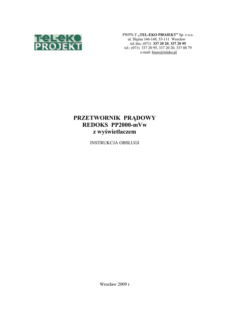 PWPN-T „TEL-EKO PROJEKT” Sp. z o.o. ul. Ślężna 146-148, 53-111 Wrocław tel./fax: (071) 337 20 20, 337 20 95 tel.: (071) 337 20 95, 337 20 20, 337 08 79 e-mail: [email protected] PRZETWORNIK PRĄDOWY REDOKS PP2000-mVw z wyświetlaczem INSTRUKCJA OBSŁUGI Wrocław 2009 r SPIS TREŚCI 1. Przeznaczenie przyrządu 3 2. Dane techniczne 3 3. Instalacja 3 4. Ustawianie zakresu pomiarowego i programowanie układu wyświetlacza 7 5. Kalibracja 9 6. Konserwacja 10 7. Kontrola dokładności pomiarów 10 8. Przekazanie przetwornika do naprawy 10 WYKAZ RYSUNKÓW Rys.1 Przetwornik PP 2000-mVw – listwy montażowe, elementy regulacyjne 4 Rys.1a Podłączenie kabla wyjściowego do przetwornika PP 2000-mVw 5 Rys. 2 Układ połączeń przetwornika z elektrodą zespoloną 6 Rys. 3 Układ połączeń przetwornika z oddzielną elektrodą wskaźnikową i odniesienia 6 2 1. PRZEZNACZENIE PRZYRZĄDU Dwuprzewodowy przetwornik prądowy redoks PP2000-mVw, wraz ze współpracującą z nim elektrodą, jest przeznaczony do dokładnych pomiarów potencjału redoks roztworów i mieszanin wodnych. Przetwornik można stosować do pomiarów potencjału redoks w zestawach kontrolnopomiarowych oraz zestawach automatyki i sterowania. Przetwornik PP2000-mVw jest wyposażony w wyświetlacz, co umożliwia lokalny odczyt wartości mierzonej oraz ułatwia jego kalibrację. Przetwornik potencjału redoks typu PP2000-mVw może znaleźć zastosowanie w przemyśle, ochronie środowiska i gospodarce wodno-ściekowej. 2. DANE TECHNICZNE Pomiar potencjału redoks Przetwornik potencjału redoks typu PP2000-mVw umożliwia pomiary w zakresie -1400 ÷ +1400 mV. Minimalna szerokość wybranego zakresu wynosi 400 mV. Zakres pomiarowy można zmieniać przy pomocy mikroprzełączników dostępnych dla użytkownika. Mierzona wartość potencjału redoks jest wyświetlana na polu odczytowym (wyświetlaczu). Zakres wyświetlanych wartości można zaprogramować (posługując się specjalnymi klawiszami dostępnymi dla użytkownika), ale musi on odpowiadać ustalonemu zakresowi pomiarowemu przetwornika. Niedokładność przetwarzania przetwornika Niedokładność przetwarzania (mV na prąd) wynosi ± 0,25 %, dla zakresu -1400 ÷ +1400 mV. Błąd dodatkowy od zmian temperatury otoczenia jest ≤ 0,25 % zakresu /10 °C. Wyjście prądowe • wyjście przeznaczone do pracy w systemie pomiarowym • separacja galwaniczna wejście - wyjście 4 ÷ 20 mA ≥ 600 V DC Współpracujące elektrody Przetwornik prądowy potencjału redoks PP2000-mVw może współpracować z dowolnymi elektrodami redoks, zarówno elektrodami zespolonymi jak i zestawem elektrody wskaźnikowej i odniesienia. Znamionowe warunki pracy Zasilanie Rezystancja obciążenia Robc Temperatura otoczenia Wilgotność względna otoczenia 18 ÷ 38 V DC 0 ÷ 800 Ω, Robc = (Uz – 18V) / 20mA -10 ÷ + 55 °C 5 ÷ 95 %. Obudowa Stopień ochrony Wymiary zewnętrzne: IP 65 120x122x75 mm 3. INSTALACJA Przetwornik należy montować na obiekcie w miejscu nie narażonym na wysokie temperatury, zwiększoną wilgotność, wibracje, zabrudzenia i uszkodzenia mechaniczne. Przewody instalacyjne powinny być ułożone i zamocowane bez naprężeń, w sposób nie pozwalający na przypadkowe ich zerwanie. Listwy zaciskowe są dostosowane do przewodów giętkich o przekrojach żył nie większych niż 0,5 mm2. 3 Instalacja urządzenia obejmuje: - podłączenie do przetwornika elektrody redoks (zwykle mocowanej w głowicy pomiarowej) - podłączenie zasilania (Uz) i obwodu prądu wyjściowego I (4 ÷ 20 mA) przeznaczonego do pracy w systemie pomiarowym. - Podłączenie zespolonej elektrody redoks należy wykonać zgodnie ze schematem pokazanym na rys.2. Podłączenie zestawu elektrody wskaźnikowej redoks i elektrody odniesienia należy wykonać zgodnie ze schematem pokazanym na rys. 3. Na rysunku 1 pokazano położenie złącz montażowych LZ1, LZ2, do których podłącza się czujniki pomiarowe, rozmieszczenie mikroprzełączników SW1 i SW2 przeznaczonych do wybierania zakresu pomiarowego mV, jak również lokalizację klawiszy K1 i K2, którymi programuje się zakres wartości wyświetlanych na wyświetlaczu. - Zasilanie przetwornika należy podłączyć do listwy LZ2, zgodnie z rys. 2 (3). - Obwód prądu wyjściowego I = 4 ÷ 20 mA należy podłączyć do listwy LZ2, zgodnie z rys. 2 (3). Rys. 1 Przetwornik PP2000-mVw – listwy montażowe, elementy regulacyjne 4 Złącza elektryczne do podłączeń zewnętrznych są umieszczone wewnątrz obudowy przetwornika. Żeby uzyskać do nich dostęp należy odkręcić cztery śruby mocujące i zdjąć pokrywę. Po otwarciu obudowy należy zachować ostrożność, aby nie uszkodzić podzespołów elektronicznych. Przewody wprowadza się do przetwornika poprzez dławiki uszczelniające. Należy zapewnić szczelność dławików oraz zadbać o szczelny montaż obudowy. Uwaga: 1. Zalecana odległość przetwornika od czujników wynosi 3 m (nie powinna przekraczać 10 m). 2. Do podłączenia zasilania 18 ÷ 38 VDC i wyjścia prądowego zaleca się stosowanie przewodu LIYCY 2x0,5 mm2 (rys. 1a). 3. Zacisk uziemiający podłączyć do ziemi możliwie krótkim przewodem. 4. Zaleca się zabezpieczenie przetwornika przed bezpośrednim działaniem warunków atmosferycznych. Rys. 1a Podłączenie kabla wyjściowego do przetwornika PP 2000-mVw Podłączenie zasilania (złącze LZ2): 6 - wejście napięcia zasilania 18 ÷ 38 VDC 7 - wyjście prądowe 4 ÷ 20 mA 8 - wyjście kontrolne prądu 4 ÷ 20 mA (patrz procedura kalibracji p. 5) Podłączenie elektrody pomiarowej (złącze LZ1): 1 - masa pomiarowa (ekran elektrody pomiarowej) 2 - rezystor zakresowy 3 - rezystor zakresowy 4 - wejście elektrody odniesienia (ekran elektrody zespolonej) 5 - wejście pomiarowe (elektrody redoks) - zacisk uziemiający 5 Na rysunku 2 i 3 pokazano podłączenie czujników pomiarowych do przetwornika. Rys. 2 Układ połączeń przetwornika z elektrodą zespoloną Rys. 3 Układ połączeń 