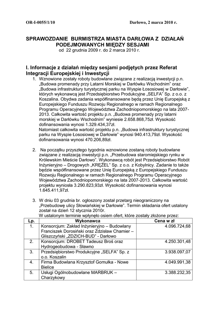 OR-I-0055/1/10 Darłowo, 2 marca 2010 r. SPRAWOZDANIE BURMISTRZA MIASTA DARŁOWA Z DZIAŁAŃ PODEJMOWANYCH MIĘDZY SESJAMI od 22 grudnia 2009 r. do 2 marca 2010 r. I. Informacje z działań między sesjami podjętych przez Referat Integracji Europejskiej i Inwestycji 1. Wznowione zostały roboty budowlane związane z realizacją inwestycji p.n. „Budowa promenady przy Latarni Morskiej w Darłówku Wschodnim” oraz „Budowa infrastruktury turystycznej parku na Wyspie Łososiowej w Darłowie”, których wykonawcą jest Przedsiębiorstwo Produkcyjne „SELFA” Sp. z o.o. z Koszalina. Obydwa zadania współfinansowane będą przez Unię Europejską z Europejskiego Funduszu Rozwoju Regionalnego w ramach Regionalnego Programu Operacyjnego Województwa Zachodniopomorskiego na lata 20072013. Całkowita wartość projektu p.n. „Budowa promenady przy latarni morskiej w Darłówku Wschodnim” wyniesie 2.658.868,75zł. Wysokość dofinansowania wynosi 1.329.434,37zł. Natomiast całkowita wartość projektu p.n. „Budowa infrastruktury turystycznej parku na Wyspie Łososiowej w Darłowie” wynosi 940.413,79zł. Wysokość dofinansowania wynosi 470.206,89zł. 2. Na początku przyszłego tygodnia wznowione zostaną roboty budowlane związane z realizacją inwestycji p.n. „Przebudowa staromiejskiego rynku w Królewskim Mieście Darłowo”. Wykonawcą robót jest Przedsiębiorstwo Robót Inżynieryjno – Drogowych „KRĘŻEL” Sp. z o.o. z Kobylnicy. Zadanie to także będzie współfinansowane przez Unię Europejską z Europejskiego Funduszu Rozwoju Regionalnego w ramach Regionalnego Programu Operacyjnego Województwa Zachodniopomorskiego na lata 2007-2013. Całkowita wartość projektu wyniosła 3.290.823,93zł. Wysokość dofinansowania wynosi 1.645.411,97zł. 3. W dniu 03 grudnia br. ogłoszony został przetarg nieograniczony na „Przebudowę ulicy Słowiańskiej w Darłowie”. Termin składania ofert ustalony został na dzień 12 stycznia 2010r. W ustalonym terminie wpłynęło osiem ofert, które zostały złożone przez: Lp. Wykonawca Cena w zł 1. Konsorcjum: Zakład Inżynieryjno – Budowlany 4.096.724,68 Franciszek Dorosiński oraz Zdzisław Chamier – Gliszczyński „ZDZICH-BUD” - Darłowo 2. Konsorcjum: DROBET Tadeusz Broś oraz 4.250.301,48 Hydrogeobudowa - Sławno 3. Przedsiębiorstwo Produkcyjne „SELFA” Sp. z 3.938.097,07 o.o. Koszalin 4. Firma Budowlana Krzysztof Gomułka - Nowe 4.049.991,38 Bielice 5. Usługi Ogólnobudowlane MARBRUK – 3.388.232,35 Charzykowy 6. 7. 8. Przedsiębiorstwo Robót InżynieryjnoDrogowych „KRĘŻEL” - Kobylnica Przedsiębiorstwo Robót Inżynieryjnych i Budowlanych INFRABUD - Koszalin Zakład Usługowy DROGBUD - Piła 2.923.486,00 4.090.492,62 3.495.842,97 Wykonawcą robót zostało Przedsiębiorstwo Robót Inżynieryjno-Drogowych „KRĘŻEL” – Kobylnica. Plac budowy przekazany został wykonawcy 29 stycznia br. Prace rozpoczną się na początku przyszłego tygodnia. Będą one realizowane w ramach Narodowego Projektu Przebudowy Dróg Lokalnych 2008-2011. Całkowita wartość projektu wyniesie 2.973.486,00zł. Wysokość dofinansowania wyniesie 1.486.743,00zł. 4. Pod koniec lutego rozpoczęte zostały roboty budowlane związane z realizacją inwestycji p.n. „Budowa deptaka w Darłówku Zachodnim – ulica Władysława IV”, których wykonawcą jest Firma Budowlana Krzysztofa Gomułki z Nowych Bielic. Zadanie to także będzie współfinansowane przez Unię Europejską z Europejskiego Funduszu Rozwoju Regionalnego w ramach Regionalnego Programu Operacyjnego Województwa Zachodniopomorskiego na lata 20072013. Całkowita wartość projektu wyniosła 1.495.407,75zł. Wysokość dofinansowania wynosi 747.703,87zł. 5. W dniu 19 lutego br. ogłoszony został przetarg nieograniczony na „Przebudowę ulic Gdyńskiej, Chińskiej oraz Puckiej w Darłowie”. Termin składania ofert ustalony został na dzień 17 marca br. Prace budowlane będą realizowane w okresie od sierpnia do listopada br. Ponadto Miasto Darłowo przygotowuje się do realizacji projektu p.n. „BUDOWA TURYSTYCZNEGO CIĄGU KOMUNIKACYJNEGO W DARŁÓWKU ZACHODNIM – ETAP II”. Realizacja w ramach: RPO WZ -podziałania 2.1.2. Lokalna Infrastruktura Drogowa. Wartość projektu przed przetargiem: 4 598 816, 60 zł Dofinansowanie dla projektu: zgodnie z zapisami regulaminu konkursu wynosi do 50% wartości inwestycji lecz nie więcej niż 1 500 000, 00 zł. W przypadku projektu miasta Darłowo otrzymamy 1 500 000 zł. Opis funkcjonalności rozwiązań zastosowanych w projekcie. Zgodnie z opracowaną dokumentacją techniczną dla projektu, w wyniku jego realizacji: Ulica Plażowa Posiadać będzie nawierzchnię z kostki betonowej gr. 8cm o szerokości 5,0m na całym odcinku opracowania. Przy krawędziach jezdni zaprojektowano krawężniki betonowe w świetle 4cm, a na przejściach dla pieszych o wymiarze w świetle 2cm. Chodniki zaprojektowano z kostki betonowej gr. 6cm na podsypce cementowo piaskowej. Wzdłuz ulicy zaprojektowano zatoki postojowe o szerokości 2,5m na długości 76,5m oraz 63,5m. Ulica Władysława IV Posiadać będzie nawierzchnię z kostki betonowej gr. 8cm o szerokości 5,5m na całym odcinku opracowania. Przy krawędziach jezdni zaprojektowano krawężniki betonowe o wymiarze w świetle 12cm, a na przejściach dla pieszych o wymiarze w świetle 2cm. Chodniki zaprojektowano z kostki betonowej gr. 6cm na podsypce cementowo piaskowej oraz warstwie odsączającej z piasku. Ulica Wilków Morskich Posiadać będzie nawierzchnię z kostki betonowej gr. 8cm o szerokości 6,0m na całym odcinku opracowania. Przy krawędziach jezdni zaprojektowano krawężniki betonowe na ławie betonowej z oporem o wymiarze w świetle 12cm, natomiast na zjazdach zaprojektowano krawężniki najazdowe o wysokości w świetle 4cm, a na przejściach dla pieszych o wysokości w świetle 2cm. Chodniki zaprojektowano z kostki betonowej gr. 6cm na podsypce cementowo piaskowej
