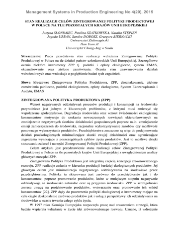 Management Systems in Production Engineering No 4(20), 2015 STAN REALIZACJI CELÓW ZINTEGROWANEJ POLITYKI PRODUKTOWEJ W POLSCE NA TLE POZOSTAŁYCH KRAJÓW UNII EUROPEJSKIEJ Justyna SŁONIMIEC, Paulina SZATKOWSKA, Natalia STĘPIEŃ Jagoda URBAN, Sandra DOBOSZ, Grzegorz BIERNACKI Uniwersytet Zielonogórski Han Yeon JI Uniwersytet Chung-Ang w Seulu Streszczenie: Praca przedstawia stan realizacji wdrażania Zintegrowanej Polityki Produktowej w Polsce na tle działań państw członkowskich Unii Europejskiej. Szczegółowo ocenia niektóre instrumenty ZPP tj. podatki i opłaty ekologiczne, system EMAS, ekoznakowanie oraz zielone zamówienia. Ocenia stan zaawansowania działań wdrożeniowych oraz wnioskuje o pogłębienie badań tych zagadnień. Słowa kluczowe: Zintegrowana Polityka Produktowa, ZPP, ekoznakowanie, zielone zamówienia publiczne, podatki ekologicznem, opłaty ekologiczne, System Ekozarządzania i Audytu, EMAS ZINTEGROWANA POLITYKA PRODUKTOWA (ZPP) Wzrost negatywnych oddziaływań procesów produkcji i konsumpcji na środowisko przyrodnicze jest jednym z kluczowych problemów, z którymi musi zmierzyć się współczesne społeczeństwo. Degradacja środowiska oraz wzrost świadomości ekologicznej konsumentów motywuje do szukania nowoczesnych rozwiązań ukierunkowanych na zmniejszenie negatywnych skutków działalności gospodarczych poprzez m.in. zmniejszanie emisji zanieczyszczeń do środowiska, racjonalne wykorzystywanie zasobów czy możliwość ponownego wykorzystania produktów. Przedsiębiorstwa zmuszone są więc do podejmowania działań proekologicznych minimalizujące skutki swojej działalności oraz ograniczające zagrożenia wynikające z poszczególnych cyklów życia produktów. Jest to możliwe dzięki stosowaniu zaleceń i narzędzi Zintegrowanej Polityki Produktowej (ZPP). Celem artykułu jest przedstawienie stanu realizacji celów Zintegrowanej Polityki Produktowej w Polsce na tle pozostałych krajów Unii Europejskiej z uwzględnieniem analizy głównych narzędzi ZPP. Zintegrowana Polityka Produktowa jest integralną częścią koncepcji zrównoważonego rozwoju. ZPP realizuje zadania w kierunku produkcji bardziej ekologicznych produktów. Jej głównym celem jest minimalizacja negatywnego oddziaływania na środowisko przez przedsiębiorstwa. Polityka ta skierowana jest zarówno do przedsiębiorstw jak i do konsumentów, poprzez promowanie produktów, które w mniejszym stopniu negatywnie oddziaływają na środowisko naturalne oraz są przyjazna środowisku. ZPP w szczególności zwraca uwagę na projektowanie produktów, wytwarzanie oraz promowanie ich wśród konsumentów [22]. ZPP dąży do poszerzenia polityki ekologicznej o instrumenty mające na celu ciągłe doskonalenie zarówno produktów jak i usług z perspektywy ich oddziaływania na środowisko w czasie trwania całego cyklu życia. W 1997 roku Komisja Europejska rozpoczęła pracę nad stworzeniem strategii, która będzie wspierała wdrażanie w życie idei zrównoważonego rozwoju. Uznano, iż wdrożenie Management Systems in Production Engineering No 4(20), 2015 koncepcji będzie możliwe dzięki poprawieniu procesów wytwórczych oraz minimalizacji negatywnego oddziaływania na środowisko procesów produkcyjnych wyrobów oraz samych produktów na każdym etapie cyklu życia. Komisja Europejska 18 czerwca 2003 roku przyjęła komunikat „Zintegrowana Polityka Produktowa – podejście oparte na cyklu życia produktów w środowisku”. Dokument zawierał opis instrumentów, dzięki którym możliwa jest minimalizacja negatywnych skutków działalności przedsiębiorstwa, a także działania umożliwiające wdrożenie strategii. Za istotne uznano również opracowanie mechanizmu popierającego ZPP oraz propagowanie działań naukowych, które przedstawiałyby zjawiska mające negatywny wpływ na środowisko naturalne [27]. W lutym 2005 roku Ministerstwo Środowisko przygotowało „Strategie Wdrożenia Zintegrowanej Polityki Produktowej w Polsce”. Dokument zawierał m.in. omówienie wybranych instrumentów Zintegrowanej Polityki Produktowej, stan prac wdrażanej polityki w Unii Europejskiej oraz Polsce. Dodatkowo w dokumencie przedstawiono zadania dla przedsiębiorstw, organizacji konsumenckich i administracji państwowej związane z realizacją ZPP oraz rekomendacje dla dalszych działań w zakresie realizacji polityki [23]. Zintegrowana Polityka Produktowa zawiera narzędzia, które powszechnie stosowane są już w ochronie środowiska, ale jednocześnie uznawane są za najbardziej skuteczne. Do jej narzędzi należą [13]: wdrażanie i promowanie systemów zarządzania ekologicznego m.in.: Systemu Ekozarządzania i Audytu (EMAS), ISO 14001, Program Czystszej Produkcji, znakowanie ekologiczne, instrumenty finansowe (podatki i opłaty ekologiczne), upowszechnianie deklaracji środowiskowych, analiza cyklu życia wyrobów, zapewnienie dostępu do informacji środowiskowych związanych z produktem, stosowanie kryteriów ekologicznych przy przetargach (Zielone zamówienia), dobrowolne porozumienia finansowe. Wszystkie narzędzia Zintegrowanej Polityki Produktowej powinny wpływać na ciągłe doskonalenie produktów jak i usług, aby we właściwy sposób minimalizować ich negatywny wpływ na środowisko przyrodnicze. INSTRUMENTY ZINTEGROWANEJ POLITYKI PRODUKTOWEJ Podatki i opłaty ekologiczne Opłaty i podatki ekologiczne są jednym z ważniejszych instrumentów Zintegrowanej Polityki Produktowej. Odgrywają one znaczącą rolę w polityce ochrony środowiska każdego z krajów Unii Europejskiej, a ich głównym zadaniem jest przede wszystkim motywowanie przedsiębiorstw do szukania rozwiązań, które w sposób skuteczny ograniczą szkody spowodowane działalnością człowieka [20]. Podatki i opłaty ekologiczne zachęcają przedsiębiorstwa do internalizacji negatywnych skutków swojej działalności, natomiast władzom publicznym daje możliwość kreowania i finansowania poli