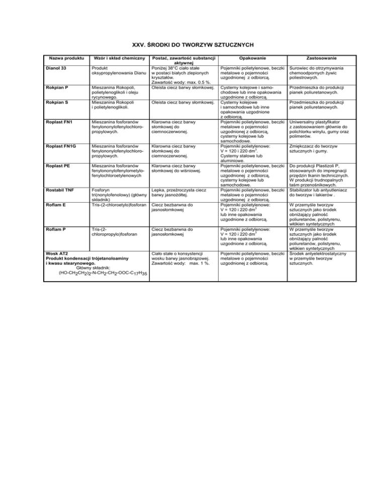 XXV. ŚRODKI DO TWORZYW SZTUCZNYCH Nazwa produktu Wzór i skład chemiczny Dianol 33 Produkt oksypropylenowania Dianu Rokpian P Mieszanina Rokopoli, polietylenoglikoli i oleju rycynowego. Mieszanina Rokopoli i polietylenoglikoli. Rokpian S Postać, zawartość substancji aktywnej Poniżej 38°C ciało stałe w postaci białych zlepionych kryształów. Zawartość wody: max. 0.5 %. Oleista ciecz barwy słomkowej. Oleista ciecz barwy słomkowej. Roplast FN1 Mieszanina fosforanów fenylononylofenylochloropropylowych. Klarowna ciecz barwy słomkowej do ciemnoczerwonej. Roplast FN1G Mieszanina fosforanów fenylononylofenylochloropropylowych. Klarowna ciecz barwy słomkowej do ciemnoczerwonej. Roplast PE Mieszanina fosforanów fenylononylofenylometylofenylochloroetylenowych Klarowna ciecz barwy słomkowej do wiśniowej. Rostabil TNF Fosforyn tri(nonylofenolowy) (główny składnik) Tris-(2-chloroetylo)fosforan Lepka, przeźroczysta ciecz barwy jasnożółtej. Roflam E Roflam P Tris-(2chloropropylo)fosforan Wosk AT2 Produkt kondensacji trójetanoloaminy i kwasu stearynowego. Główny składnik: (HO-CH2CH2)2-N-CH2-CH2-OOC-C17H35 Ciecz bezbarwna do jasnosłomkowej Opakowanie Zastosowanie Pojemniki polietylenowe, beczki metalowe o pojemności uzgodnionej z odbiorcą. Surowiec do otrzymywania chemoodpornych żywic poliestrowych. Cysterny kolejowe i samochodowe lub inne opakowania uzgodnione z odbiorcą. Cysterny kolejowe i samochodowe lub inne opakowania uzgodnione z odbiorcą. Pojemniki polietylenowe, beczki metalowe o pojemności uzgodnionej z odbiorcą, cysterny kolejowe lub samochodowe. Pojemniki polietylenowe: V = 120 i 220 dm3. Cysterny stalowe lub aluminiowe. Pojemniki polietylenowe, beczki metalowe o pojemności uzgodnionej z odbiorcą, cysterny kolejowe lub samochodowe. Pojemniki polietylenowe, beczki metalowe o pojemności uzgodnionej z odbiorcą. Pojemniki polietylenowe: V = 120 i 220 dm3 lub inne opakowania uzgodnione z odbiorcą. Przedmieszka do produkcji pianek poliuretanowych. Ciecz bezbarwna do jasnosłomkowej Pojemniki polietylenowe: V = 120 i 220 dm3 lub inne opakowania uzgodnione z odbiorcą. Ciało stałe o konsystencji wosku barwy jasnobrązowej. Zawartość wody: max. 1 %. Pojemniki polietylenowe, beczki metalowe o pojemności uzgodnionej z odbiorcą. Przedmieszka do produkcji pianek poliuretanowych. Uniwersalny plastyfikator z zastosowaniem głównie do polichlorku winylu, gumy oraz polimerów. Zmiękczacz do tworzyw sztucznych i gumy. Do produkcji Plastizoli P, stosowanych do impregnacji przędzin tkanin technicznych. W produkcji trudnopalnych taśm przenośnikowych. Stabilizator lub antyutleniacz do tworzyw i lakierów . W przemyśle tworzyw sztucznych jako środek obniżający palność poliuretanów, polistyrenu, włókien syntetycznych W przemyśle tworzyw sztucznych jako środek obniżający palność poliuretanów, polistyrenu, włókien syntetycznych Środek antyelektrostatyczny w przemyśle tworzyw sztucznych.