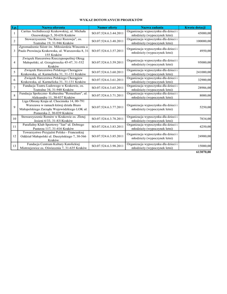 WYKAZ DOTOWANYCH PROJEKTÓW Lp. 1 2 3 4 5 6 7 8 9 10 11 12 13 Nazwa oferenta Caritas Archidiecezji Krakowskiej, ul. Michała Ossowskiego 5, 30-656 Kraków Stowarzyszenie "Na Rzecz Rozowju", os. Teatralne 19, 31-946 Kraków Zgromadzenie Sióstr św. Miłosierdzia Wincenta a Paulo Prowincja Krakowska, ul. Warszawska 8, 31155 Kraków Związek Harcerstwa Rzeczypospolitej Okręg Małopolski, ul. Grzegórzecka 45-47, 31-532 Kraków Związek Harcerstwa Polskiego Chorągiew Krakowska, ul. Karmelicka 31, 31-131 Kraków Związek Harcerstwa Polskiego Chorągiew Krakowska, ul. Karmelicka 31, 31-131 Kraków Fundacja Teatru Ludowego w Krakowie, os. Teatralne 34, 31-948 Kraków Fundacja Społeczno- Kulturalna "Remedium", ul. Aleksandry 11, 30-837 Kraków Liga Obrony Kraju ul. Chocimska 14, 00-791 Warszawa w ramach której działa Biuro Małopolskiego Zarządu Wojewódzkiego LOK ul. Pomorska 2, 30-039 Kraków Stowarzyszenie Romów w Krakowie os. Złotej Jesieni 6/33, 31-831Kraków Parafialny Klub Sportowy "Jan" ul. Dobrego Pasterza 117, 31-416 Kraków Towarzystwo Przyjaźni Polsko - Francuskiej Oddział Małopolski ul. Daszyńskiego 7, 30-566 Kraków Fundacja Centrum Kultury Katolickiej Mistrzejowice os. Oświecenia 7, 31-635 Kraków Numer oferty Nazwa zadania Organizacja wypoczynku dla dzieci i SO.07.524.6.3.44.2011 młodzieży (wypoczynek letni) Organizacja wypoczynku dla dzieci i SO.07.524.6.3.48.2011 młodzieży (wypoczynek letni) Kwota dotacji 45000,00 100000,00 SO.07.524.6.3.57.2011 Organizacja wypoczynku dla dzieci i młodzieży (wypoczynek letni) 4950,00 SO.07.524.6.3.59.2011 Organizacja wypoczynku dla dzieci i młodzieży (wypoczynek letni) 95000,00 Organizacja wypoczynku dla dzieci i młodzieży (wypoczynek letni) Organizacja wypoczynku dla dzieci i SO.07.524.6.3.61.2011 młodzieży (wypoczynek letni) Organizacja wypoczynku dla dzieci i SO.07.524.6.3.65.2011 młodzieży (wypoczynek letni) Organizacja wypoczynku dla dzieci i SO.07.524.6.3.71.2011 młodzieży (wypoczynek letni) SO.07.524.6.3.60.2011 SO.07.524.6.3.77.2011 Organizacja wypoczynku dla dzieci i młodzieży (wypoczynek letni) Organizacja wypoczynku dla dzieci i młodzieży (wypoczynek letni) Organizacja wypoczynku dla dzieci i SO.07.524.6.3.83.2011 młodzieży (wypoczynek letni) SO.07.524.6.3.78.2011 241000,00 32900,00 28986,00 8000,00 5250,00 7834,00 4250,00 SO.07.524.6.3.85.2011 Organizacja wypoczynku dla dzieci i młodzieży (wypoczynek letni) 24900,00 SO.07.524.6.3.98.2011 Organizacja wypoczynku dla dzieci i młodzieży (wypoczynek letni) 15000,00 613070,00
