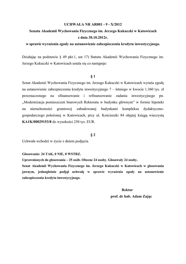 UCHWAŁA NR AR001 - 9 - X/2012 Senatu Akademii Wychowania Fizycznego im. Jerzego Kukuczki w Katowicach z dnia 30.10.2012r. w sprawie wyraŜenia zgody na ustanowienie zabezpieczenia kredytu inwestycyjnego. Działając na podstawie § 49 pkt.1, ust 17) Statutu Akademii Wychowania Fizycznego im. Jerzego Kukuczki w Katowicach ustala się co następuje: §1 Senat Akademii Wychowania Fizycznego im. Jerzego Kukuczki w Katowicach wyraŜa zgodę na ustanowienie zabezpieczenia kredytu inwestycyjnego 7 – letniego w kwocie 1.360 tys. zł przeznaczonego na sfinansowanie i refinansowanie zadania inwestycyjnego pn. „Modernizacja pomieszczeń biurowych Rektoratu w budynku głównym” w formie hipoteki na nieruchomości gruntowej zabudowanej budynkami kompleksu dydaktyczno- gospodarczego połoŜonej w Katowicach, przy ul. Kościuszki 84 objętej księgą wieczystą KA1K/00029153/8 do wysokości 250 tys. EUR. §2 Uchwała wchodzi w Ŝycie z dniem podjęcia. Głosowanie: 24 TAK, 0 NIE, 0 WSTRZ. Uprawnionych do głosowania – 25 osób. Obecne 24 osoby. Głosowały 24 osoby. Senat Akademii Wychowania Fizycznego im. Jerzego Kukuczki w Katowicach w głosowaniu jawnym, jednogłośnie podjął uchwałę w sprawie wyraŜenia zgody na ustanowienie zabezpieczenia kredytu inwestycyjnego. Rektor prof. dr hab. Adam Zając