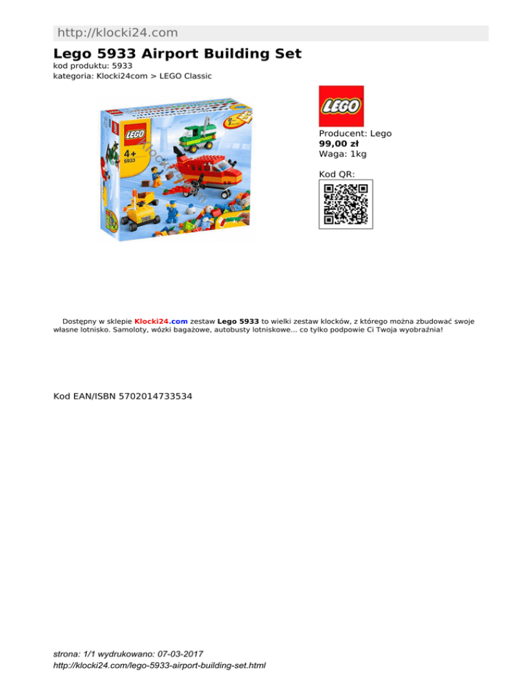 http://klocki24.com Lego 5933 Airport Building Set kod produktu: 5933 kategoria: Klocki24com > LEGO Classic Producent: Lego 99,00 zł Waga: 1kg Kod QR: Dostępny w sklepie Klocki24.com zestaw Lego 5933 to wielki zestaw klocków, z którego można zbudować swoje własne lotnisko. Samoloty, wózki bagażowe, autobusty lotniskowe... co tylko podpowie Ci Twoja wyobraźnia! Kod EAN/ISBN 5702014733534 strona: 1/1 wydrukowano: 07-03-2017 http://klocki24.com/lego-5933-airport-building-set.html