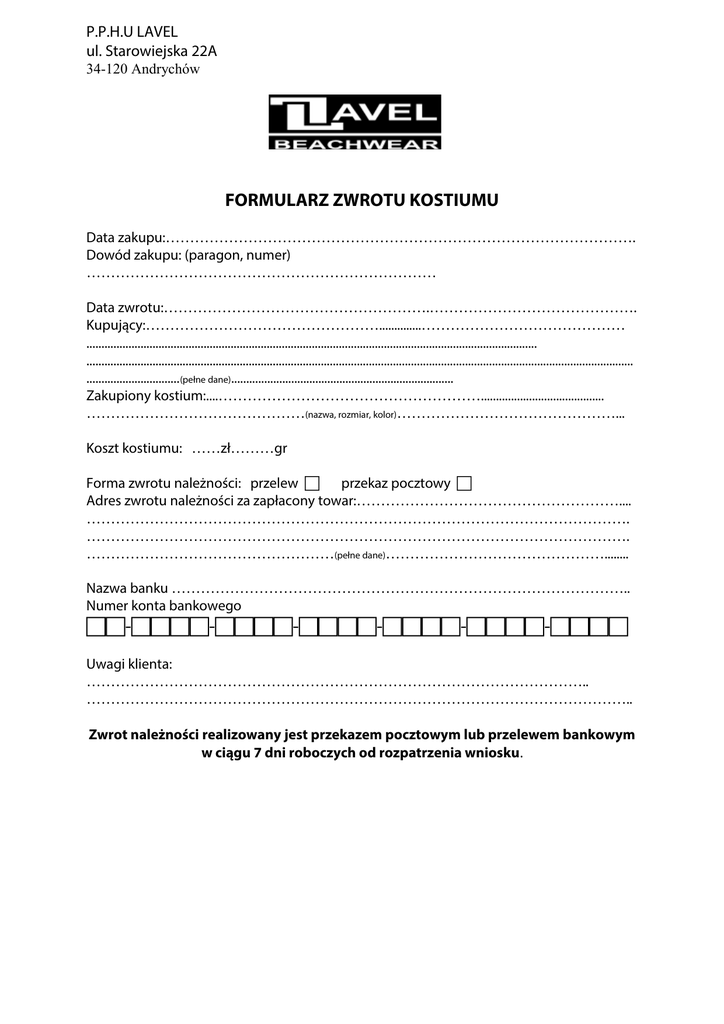 P.P.H.U LAVEL ul. Starowiejska 22A 34-120 Andrychów FORMULARZ ZWROTU KOSTIUMU Data zakupu:……………………………………………………………………………………. Dowód zakupu: (paragon, numer) ……………………………………………………………… Data zwrotu:……………………………………………….……………………………………. Kupujący:…………………………………………..............…………………………………… ...................................................................................................................................................... ...................................................................................................................................................................................... ............................... (pełne dane).......................................................................... Zakupiony kostium:....………………………………………………......................................... ………………………………………(nazwa, rozmiar, kolor)………………………………………... Koszt kostiumu: ……zł………gr Forma zwrotu należności: przelew przekaz pocztowy Adres zwrotu należności za zapłacony towar:……………………………………………….... …………………………………………………………………………………………………. …………………………………………………………………………………………………. ……………………………………………(pełne dane)………………………………………........ Nazwa banku ………………………………………………………………………………….. Numer konta bankowego ------ Uwagi klienta: ………………………………………………………………………………………….. ………………………………………………………………………………………………….. Zwrot należności realizowany jest przekazem pocztowym lub przelewem bankowym w ciągu 7 dni roboczych od rozpatrzenia wniosku. P.P.H.U LAVEL ul. Starowiejska 22A 34-120 Andrychów FORMULARZ REKLAMACJI KOSTIUMU Data zakupu:……………………………………………………………………………………. Dowód zakupu: (paragon numer) ……………………………………………………………… Data zwrotu:……………………………………………………………………………………. Kupujący:……………………………………………………………………………… .................................................................................................................................................... .................................................................................................................................................... .............................................................. (pełne dane)......................................................................... Zakupiony kostium: …………………………………………………..................................... …………………………………………(model, rozmiar, kolor)…………………………………….. Koszt kostiumu: ……zł………gr Wybrany kostium na zamianę: ………………………………………………………………………….. …………………………………………………………………………………………………………… ………………………………...............(model, rozmiar, kolor)……………………………………………… Dane do wysyłki:……………………………………………………………………………………….. …………………………………………………………………………………………………………… Uwagi: …………………………………………………………………………………………………… …………………………………………………………………………………………………………… W przypadku wyboru innego produktu należy sprawdzić jego dostępność drogą e-mail [email protected] a następnie postępować zgodnie z instrukcją zawartą w otrzymanej wiadomości zwrotnej.