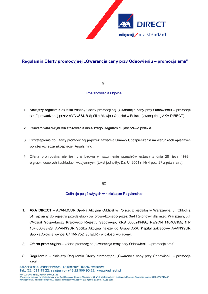 Regulamin Oferty promocyjnej „Gwarancja ceny przy Odnowieniu – promocja sms” §1 Postanowienia Ogólne 1. Niniejszy regulamin określa zasady Oferty promocyjnej „Gwarancja ceny przy Odnowieniu – promocja sms” prowadzonej przez AVANSSUR Spółka Akcyjna Oddział w Polsce (zwaną dalej AXA DIRECT). 2. Prawem właściwym dla stosowania niniejszego Regulaminu jest prawo polskie. 3. Przystąpienie do Oferty promocyjnej poprzez zawarcie Umowy Ubezpieczenia na warunkach opisanych poniżej oznacza akceptację Regulaminu. 4. Oferta promocyjna nie jest grą losową w rozumieniu przepisów ustawy z dnia 29 lipca 1992r. o grach losowych i zakładach wzajemnych (tekst jednolity: Dz. U. 2004 r. Nr 4 poz. 27 z późn. zm.). §2 Definicje pojęć użytych w niniejszym Regulaminie 1. AXA DIRECT – AVANSSUR Spółka Akcyjna Oddział w Polsce, z siedzibą w Warszawie, ul. Chłodna 51, wpisany do rejestru przedsiębiorców prowadzonego przez Sad Rejonowy dla m.st. Warszawy, XII Wydział Gospodarczy Krajowego Rejestru Sądowego, KRS 0000249486, REGON 140408155; NIP 107-000-33-23. AVANSSUR Spółka Akcyjna należy do Grupy AXA. Kapitał zakładowy AVANSSUR Spółka Akcyjna wynosi 67 155 752, 86 EUR - w całości wpłacony. 2. Oferta promocyjna – Oferta promocyjna „Gwarancja ceny przy Odnowieniu – promocja sms”. 3. Regulamin – niniejszy Regulamin Oferty promocyjnej „Gwarancja ceny przy Odnowieniu – promocja sms”. 4. Umowa ubezpieczenia – umowa ubezpieczenia zawarta pomiędzy AXA DIRECT a Nowym Klientem obejmująca swoim zakresem co najmniej ubezpieczenie odpowiedzialności cywilnej posiadaczy pojazdów mechanicznych (OC). Za Umowę ubezpieczenia nie są uważane umowy ubezpieczenia OC zawierane na okres krótszy niż 12 miesięcy (tzw. krótkoterminowe umowy ubezpieczenia). 5. Nowy Klient – osoba fizyczna, która w chwili przystąpienia do Oferty promocyjnej nie posiada zawartej z AXA DIRECT Umowy ubezpieczenia na pojazd, którego ma dotyczyć Oferta promocyjna i która spełnia wymogi określone w § 3 niniejszego Regulaminu. Nowym Klientem może być również osoba fizyczna prowadząca działalność gospodarczą, o ile ubezpiecza pojazd nie służący jej do prowadzenia działalności gospodarczej. 6. Odnowieniowa Umowa Ubezpieczenia – umowa ubezpieczenia zawarta na kolejny Rok Polisowy pomiędzy AXA DIRECT a Nowym Klientem na ten sam pojazd z identycznym zakresem ubezpieczenia oraz identycznym Harmonogramem Płatności, jak wskazane w Umowie Ubezpieczenia. 7. Doradca – pracownik AXA DIRECT w Call Center lub osoba świadcząca w imieniu i na rzecz AXA DIRECT usługi w Call Center, na podstawie umowy cywilnoprawnej. 8. Call Center – Centrum telefoniczne AXA DIRECT dostępne pod numerem telefonu 22 599 95 53 (koszt połączenia z Call Center według taryfy operatora) 9. Czas trwania Oferty promocyjnej – okres, w którym Nowy Klient może skorzystać z Oferty promocyjnej, określony w §5 niniejszego Regulaminu. 10. Gwarancja ceny – gwarantowana przez AXA DIRECT wysokość składki ubezpieczeniowej w Odnowieniowej Umowie Ubezpieczenia równa składce ubezpieczeniowej należnej z Umowy Ubezpieczenia. 11. Rok Polisowy – Okres ubezpieczenia, na jaki udzielona jest ochrona ubezpieczeniowa przez AXA DIRECT wskazany w Umowie Ubezpieczenia lub Odnowieniowej Umowie Ubezpieczenia. 12. Harmonogram Płatności – określony w Umowie Ubezpieczenia termin płatności ubezpieczeniowej albo poszczególnych rat składki ubezpieczeniowej. składki §3 Zasady korzystania z Oferty promocyjnej 1. W ramach Oferty promocyjnej i na warunkach określonych w Regulaminie, AXA DIRECT Klientowi udziela Gwarancji Ceny dla Odnowieniowej Umowy Ubezpieczenia Nowemu na kolejny Rok Polisowy , z zastrzeżeniem ust. 2-9. 2. Z Oferty promocyjnej mogą skorzystać wyłącznie Nowi Klienci, którzy spełnią łącznie wszystkie warunki określone w Regulaminie. 3. Oferta promocyjna przeznaczona jest dla Nowych Klientów, którzy w Czasie trwania Oferty promocyjnej otrzymali od AXA Direct wiadomość tekstową sms o treści: Teraz assistance opony za 5 zł oraz gwarancja równie niskiej ceny przy zakupie polisy na kolejny rok. Zadzwoń na 22 599 95 53 i kup polisę. 4. Oferta promocyjna przeznaczona jest dla Nowych Klientów, którzy w Czasie trwania Oferty promocyjnej złożą wniosek o zawarcie Umowy ubezpieczenia za pośrednictwem Call Center dzwoniąc na numer 22 599 95 53. 5. Z Oferty promocyjnej Nowy Klient może skorzystać, o ile Umowa ubezpieczenia zostanie zawarta nie później niż w terminie 30 dni kalendarzowych od dnia złożenia u Doradcy wniosku o zawarcie Umowy ubezpieczenia w AXA DIRECT. 6. Nowy Klient może skorzystać z Oferty promocyjnej pod warunkiem posiadania na dzień złożenia wniosku o zawarcie Umowy Ubezpieczenia, historii ubezpieczenia potwierdzającej: a. posiadanie 60% zniżki w zakresie ubezpieczenia OC oraz b. brak zgłoszonych jakichkolwiek szkód z tytułu ubezpieczenia OC lub AC w okresie ostatnich 5 lat poprzedzających dzień złożenia wniosku o zawarcie Umowy Ubezpieczenia. AXA DIRECT zastrzega sobie prawo dokonania weryfikacji historii przebiegu ubezpieczenia, w tym szkodowości Nowego Klienta w Ośrodku Informacji Ubezpieczeniowego Funduszu Gwarancyjnego. W przypadku stwierdzenia rozbieżności między danymi zawartymi we wniosku o zawarcie Umowy ubezpieczenia, a danym uzyskanymi z Ośrodka Informacji Ubezpieczeniowego Funduszu Gwarancyjnego, Nowy Klient nie uzyskuje prawa do skorzystania z Oferty promocyjnej. 7. Warunkiem skorzystania przez Nowego Klienta z Oferty promocyjnej i udzielenia przez AXA Direct Gwarancji ceny jest bezszkodowy przebieg Umowy Ubezpieczenia, z wyłączeniem szkód z tytułu ubezpieczeń AXA ASSISTANCE określonych w Rozdziale VII Ogólnych Warunków Ubezpieczenia AXA DIRECT z dnia 07.12.2012 roku. 8. Gwarancja Ceny nie przysługuje w sytuacji gdy : a. W dniu przygotowywania przez AXA DIRECT oferty Odnowieniowej Umowy Ubezpieczenia, o k