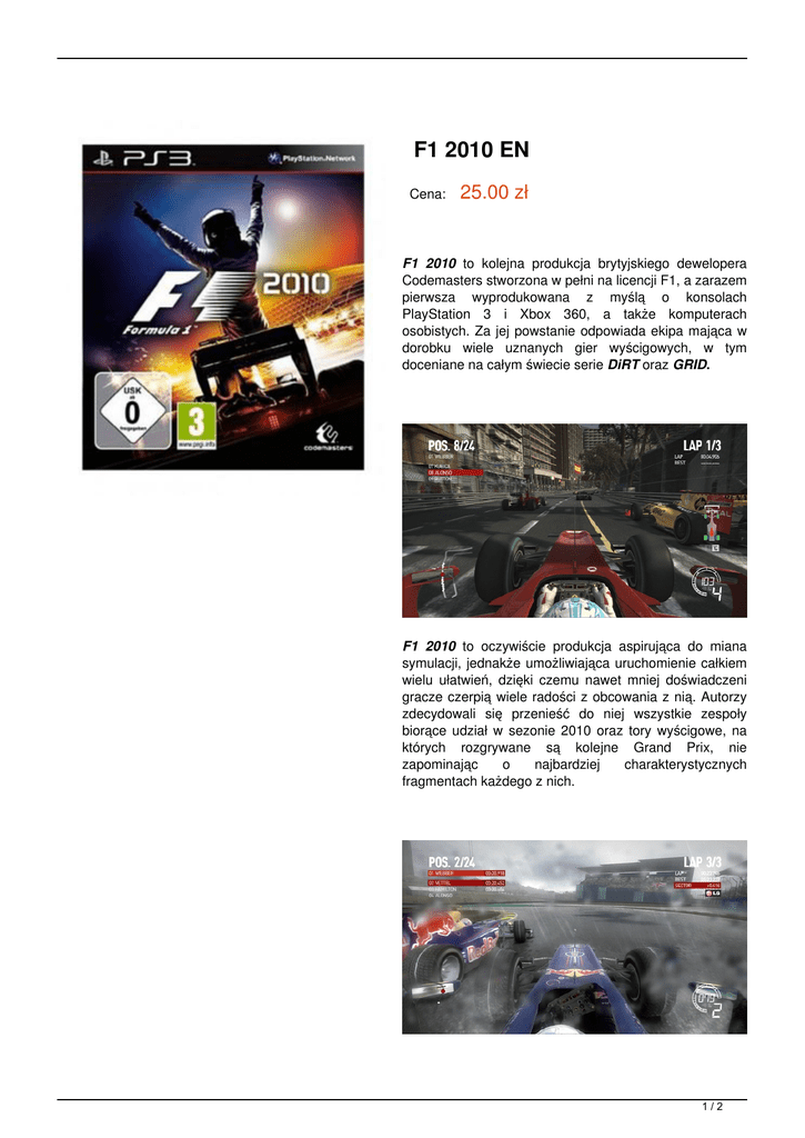 F1 2010 EN Cena: 25.00 zł F1 2010 to kolejna produkcja brytyjskiego dewelopera Codemasters stworzona w pełni na licencji F1, a zarazem pierwsza wyprodukowana z myślą o konsolach PlayStation 3 i Xbox 360, a także komputerach osobistych. Za jej powstanie odpowiada ekipa mająca w dorobku wiele uznanych gier wyścigowych, w tym doceniane na całym świecie serie DiRT oraz GRID. F1 2010 to oczywiście produkcja aspirująca do miana symulacji, jednakże umożliwiająca uruchomienie całkiem wielu ułatwień, dzięki czemu nawet mniej doświadczeni gracze czerpią wiele radości z obcowania z nią. Autorzy zdecydowali się przenieść do niej wszystkie zespoły biorące udział w sezonie 2010 oraz tory wyścigowe, na których rozgrywane są kolejne Grand Prix, nie zapominając o najbardziej charakterystycznych fragmentach każdego z nich. 1/2 Na potrzeby gry autorzy opracowali zaawansowany model jazdy, biorąc przy tym pod uwagę takie elementy, jak nierówności terenu wpływające na zachowanie bolidów, czy też zmiany ustawień spojlerów i skrzydeł. Osiągnięcie zadowalającego wyniku zależy także od taktyki rozgrywania pit-stopów – zatankowanie samochodu do pełna ma istotny wpływ na jego wagę oraz sposób prowadzenia, podobnie jak dobór opon do warunków atmosferycznych. Zobacz wideo: 2/2 Powered by TCPDF (www.tcpdf.org)