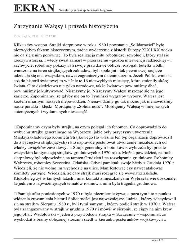 Niezależny serwis społeczności blogerów Zarzynanie Wałęsy i prawda historyczna Piotr Piętak, 21.01.2017 12:01 Kilka słów wstępu. Strajki sierpniowe w roku 1980 i powstanie „Solidarności” było niezwykłym faktem historycznym, żadne wydarzenie z historii Europy XIX i XX wieku nie da się z nim porównać. To była realizacja mitu robotniczej rewolucji, który stał się rzeczywistością. I wtedy świat zamarł w przerażeniu –groźba interwencji radzieckiej – i zachwycie; robotnicy pokazywali swoje prawdziwe oblicze, rozbijali butelki wódki wnoszone na teren strajkujących zakładów, byli spokojni i tak pewni swej racji, że udzielała się ona wszystkim, nawet zagranicznym dziennikarzom. Jeżeli Polska wniosła coś do historii światowej to właśnie te 16 niezwykłych miesięcy, które zmieniły skórę świata. O to dziedzictwo nie tylko narodowe, także światowe powinniśmy dbać, powinniśmy je kultywować. Niszczymy je. Niszczymy Wałęsę mszcząc się na jego karierze. Zapominamy, że gdyby nie on to Tymiński wygrałby wybory. Wałęsa jest kozłem ofiarnym naszych niepowodzeń. Nienawidzimy go tak mocno jak nienawidzimy nasze porażki i klęski. Mordujemy „Solidarność”. Mordujemy Wałęsę w imię naszych autentycznych i wydumanych nieszczęść. Zapominamy czym były strajki, na czym polegał ich fenomen. Co doprowadziło do wybuchu strajku generalnego na Wybrzeżu, jakie były przyczyny utworzenia Międzyzakładowego Komitetu Strajkowego (to właśnie ten typ organizacji doprowadził do zwycięstwa strajkujących) i kto naprawdę postulował utworzenie niezależnych od władzy związków zawodowych. Strajk generalny robotników z wybrzeża był przede wszystkim kontynuacją strajków grudniowych z 1970 roku. Można powiedzieć, ze ruch sierpniowy był odpowiedzią na tamten Grudzień i na rozwiązania grudniowe. Robotnicy Wybrzeża, robotnicy Szczecina, Gdańska, Gdyni pamiętali swoje błędy z Grudnia 1970 r. Wiedzieli, że nie wolno im wychodzić na ulice. Manifestować czy nawet atakować komitety partyjne. Wiedzieli, że cały strajk musi rozegrać się wewnątrz zakładu. Ktokolwieg żył w tamtych latach i miał kontakt z mieszkańcami Wybrzeża wie doskonale, że jednym z najważniejszych tematów rozmów z nimi była tragedia grudniowa. Pamięć ofiar poniesionych w 1970 r. była niezmiernie żywa, a poza tym i to z punktu widzenia zrozumienia historii Solidarności jest najważniejsze, ludzie , którzy zdecydowali się na strajk w Sierpniu 1980 r., byli tymi samymi , którzy podjeli strajk w 1970 r. Wałęsa była zaangażowany w strajk w grudniu 1970 r i mówił w sierpniu, że ciąży na nim krew jego ofiar. Wądołowski – jeden z przywódców strajku w Szczecinie – wspominał, że wychodził z bramy oblężonej stoczni i szedł w kierunku posterunków wojskowych z strona 1 / 2 Niezależny serwis społeczności blogerów podniesionymi rekami, nie wiedząc czy będą do niego strzelać czy nie. Przysiągł sobie wtedy, ze nigdy więcej nie można dopuścić do takiej masakry, jaka się zdarzyła. Lato roku 80-tego było nawiązaniem do wydarzeń roku 70-tego, było ich drugą falą. Druga fala społecznego ruchu zawsze jest silniejsza, ponieważ zawiera w sobie nie tylko reakcje na wydarzenia aktualne, lecz także reminiscencje i – co najważniejsze – uraz wyniesiony z wydarzeń dawniejszych. Robotnicy Wybrzeża wiedzieli, że dali się wpuścić Gierkowi w maliny ; to ich własnie cała Polska oglądała na ekranach telewizorów rozmawiających z Gierkiem przez wiele godzin. I to ich okrzyk „pomożemy” był hasłem gierkowskiej epoki. To ten okrzyk legitymizował partie komunistyczną, ta samą partie na której rozkaz wymordowano ich kolegów i koleżanki. A zatem do pamięci o krwi.... ciąg dalszy wpisu: http://pp.mediologia.pl/2017/01/20/zarzynanie-walesy-i-prawda-historyczna/ strona 2 / 2 Powered by TCPDF (www.tcpdf.org)