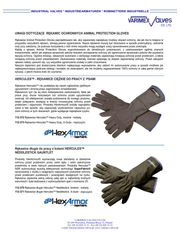 INDUSTRIAL VALVES * INDUSTRIEARMATUREN * ROBINETTERIE INDUSTRIELLE UWAGI DOTYCZĄCE RĘKAWIC OCHRONNYCH ANIMAL PROTECTION GLOVES Rękawice Animal Protection Gloves zaprojektowano tak, aby zapewniały największy możliwy stopień ochrony, ale jak ma to miejsce w przypadku wszystkich rękawic, istnieją pewne ograniczenia. Nasze rękawice muszą być stosowane w sposób przemyślany, ostrożnie oraz przy założeniu, że podczas korzystania z nich mimo wszystko mogą wystąpić urazy spowodowane przez zwierzęta. Każdą z rękawic Animal Protection Gloves wyprodukowano do określonych przeznaczeń, z zastosowaniem ogólnie znanych kompromisów, takich jak większa sprawność palców kosztem zmniejszenia ochrony lub ograniczenie sprawności palców dla uzyskania lepszej ochrony. Ogólnie mówiąc, rękawiczki wykonane z cieńszego materiału zapewniają mniejszą ochronę przed przebiciem, a także mniejszą ochronę przed zmiażdżeniem. Zastosowane materiały również wpływają na stopień zapewnianej ochrony. Przed zakupem rękawic należy upewnić się, czy wszystkie ograniczenia zostały w pełni zrozumiane. Naszym dążeniem jest dostarczanie klientom najlepszego wyposażenia, aby ułatwić im wykonywanie pracy w sposób możliwie jak najbezpieczniejszy podczas obsługi i kontaktu ze zwierzętami, ale nie możemy zagwarantować 100% ochrony w całej gamie różnych sytuacji, z jakimi można mieć do czynienia. HERCULESTM - RĘKAWICE CIĘŻKIE DO PRACY Z PSAMI Rękawice HerculesTM nie poddadzą się nawet najbardziej zjadliwym ugryzieniom i chronią przez zagrożeniem zmiażdżeniem. Rękawicom tym nie są obce niebezpieczne zastosowania, takie jak prace przy drucie kolczastym lub ochrona przed ugryzieniami zwierząt. Ich efektywność została podniesiona do nowego poziomu, dzięki połączeniu wiodącej w branży innowacyjnej ochrony przed przebiciem i odporności. Produkty HexArmour® zostały zaprojektowane w taki sposób, aby zapewniały użytkownikom najwyższy poziom ochrony w tych obszarach, gdzie występuje największe ryzyko. 112-372 Rękawice HerculesTM Heavy Duty, średnie - kobiety 112-373 Rękawice HerculesTM Heavy Duty, X-Duże - mężczyźni Rękawice długie do pracy z kotami HERCULESTM NEDDLESTICK GAUNTLET Produkty HexArmour® wyznaczają nowe standardy w dziedzinie ochrony przed przebiciem przez ostre zęby i ostro zakończone przedmioty w wielu różnych zastosowaniach. Produkty HerculesTM NSR wykorzystują wysoką efektywność technologii SuperFabric® opracowanej z myślą o osiągnięciu najwyższych poziomów ochrony przed przebiciem punktowym i przecięciem dostępnych na rynku. Rękawica zapewnia pełną osłonę całej ręki w najbardziej trudnych warunkach i była testowana z wykorzystaniem igieł o rozmiarze 25. 112-370 Rękawice długie HerculesTM Neddlestick, średnie - kobiety 112-371 Rękawice długie HerculesTM Neddlestick, X-duże - mężczyźni VARIMEX-VALVES CO.LTD 03-284 Warszawa, Porannej Bryzy 33, Poland Tel. (48 22) 828 15 31, Fax (48 22) 828 15 32 e-mail: [email protected]; www.varimex-valves.pl